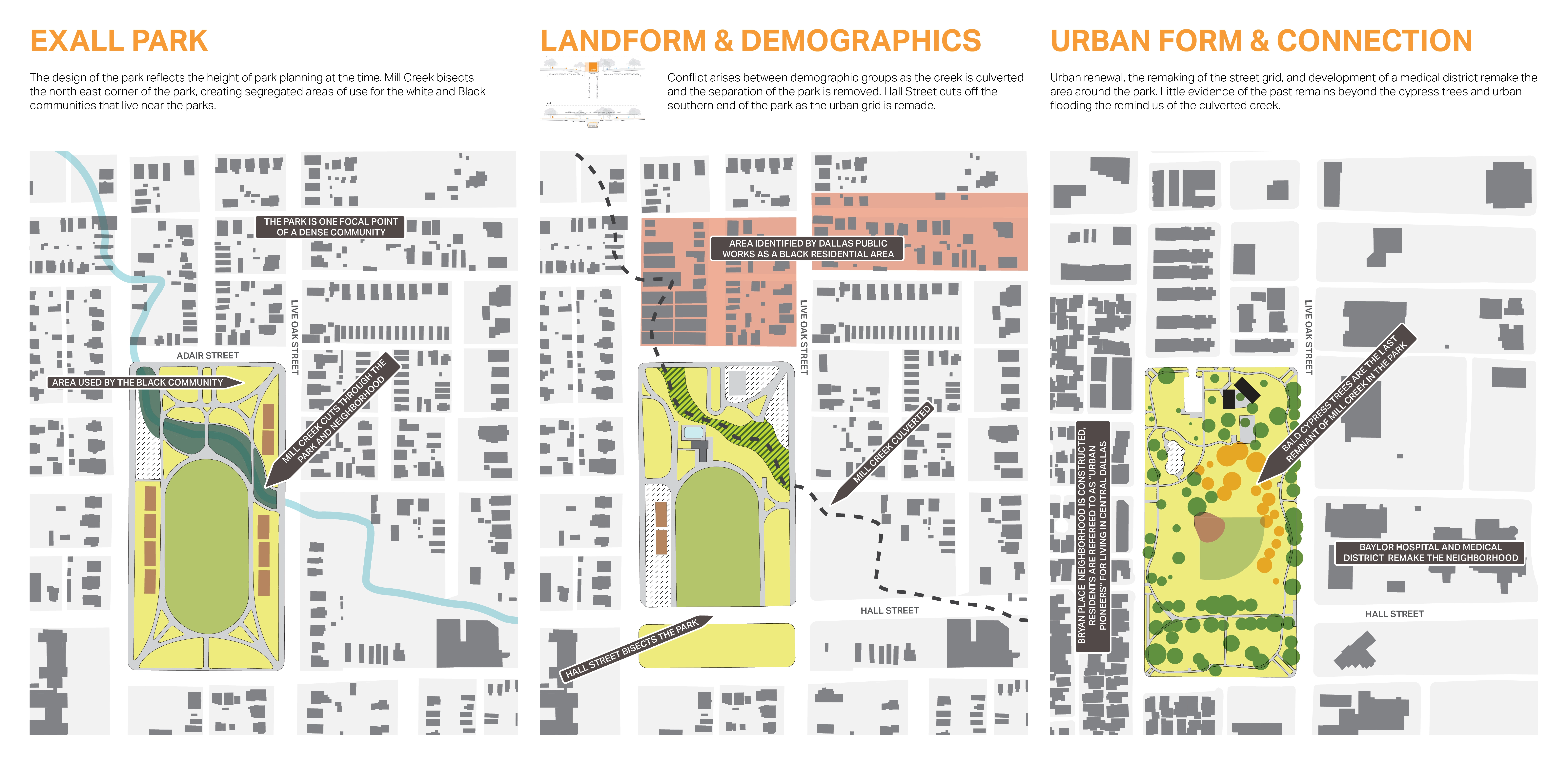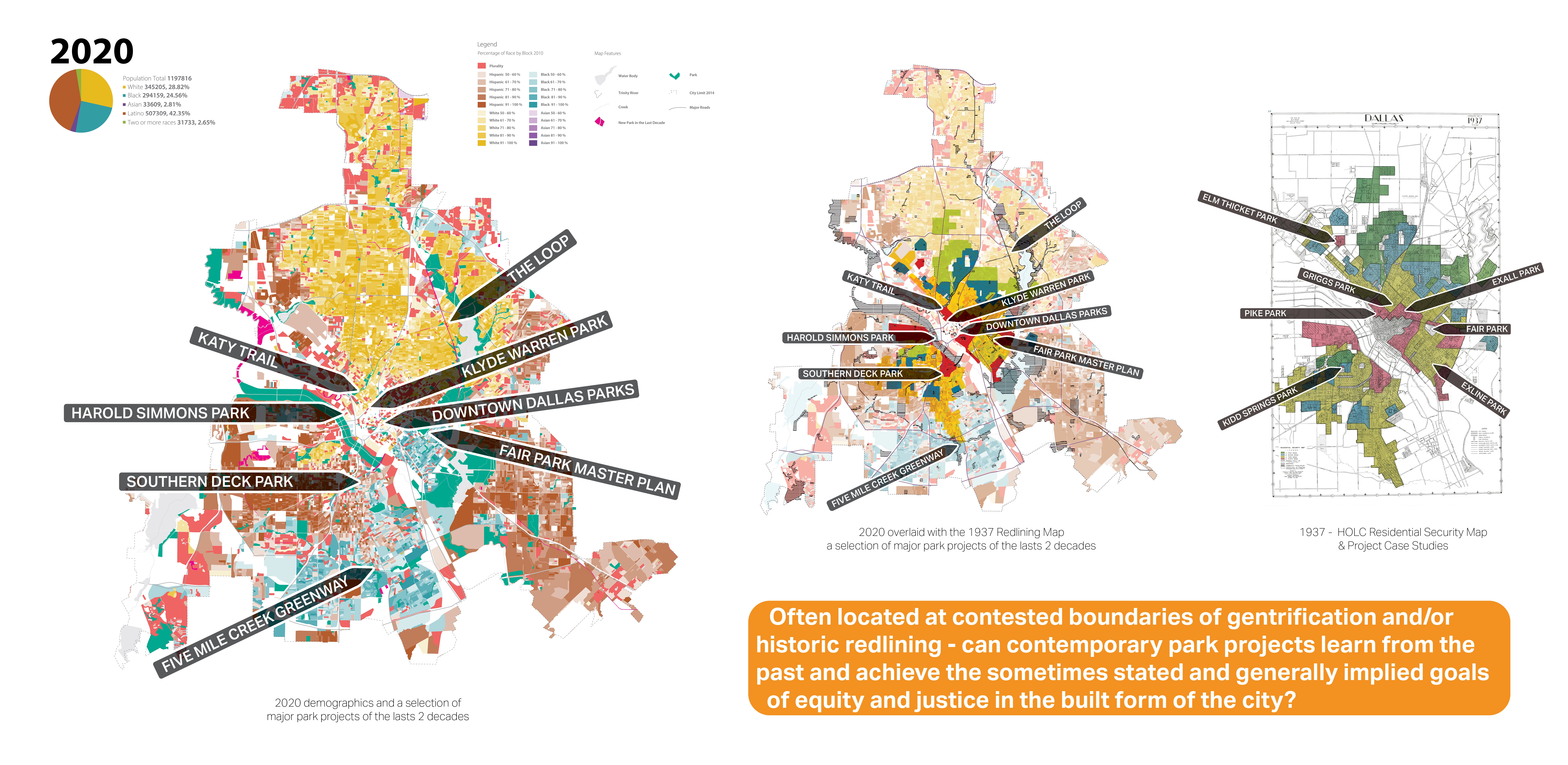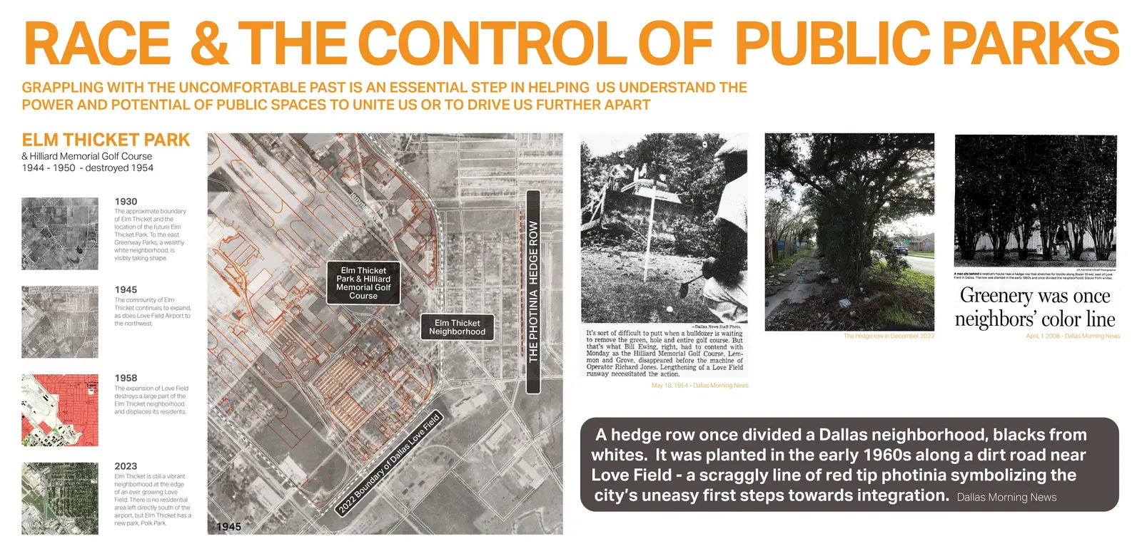 This research uses a century long historical analysis of the public park system in Dallas, Texas, USA to uncover the physical and psychological ways in which public landscapes and the works of landscape architects have segregated urban spaces and how we might fight against these design practices. Through reframing past practice this work seeks to create a method for informing design thought and practices that seek to create a more just built environment. Overlaying the mapping of demographic data with the development of the public park system and incidents of segregation and violence; the research creates a clear link between the social and economic process of racial injustice and the process of park design and urban development.