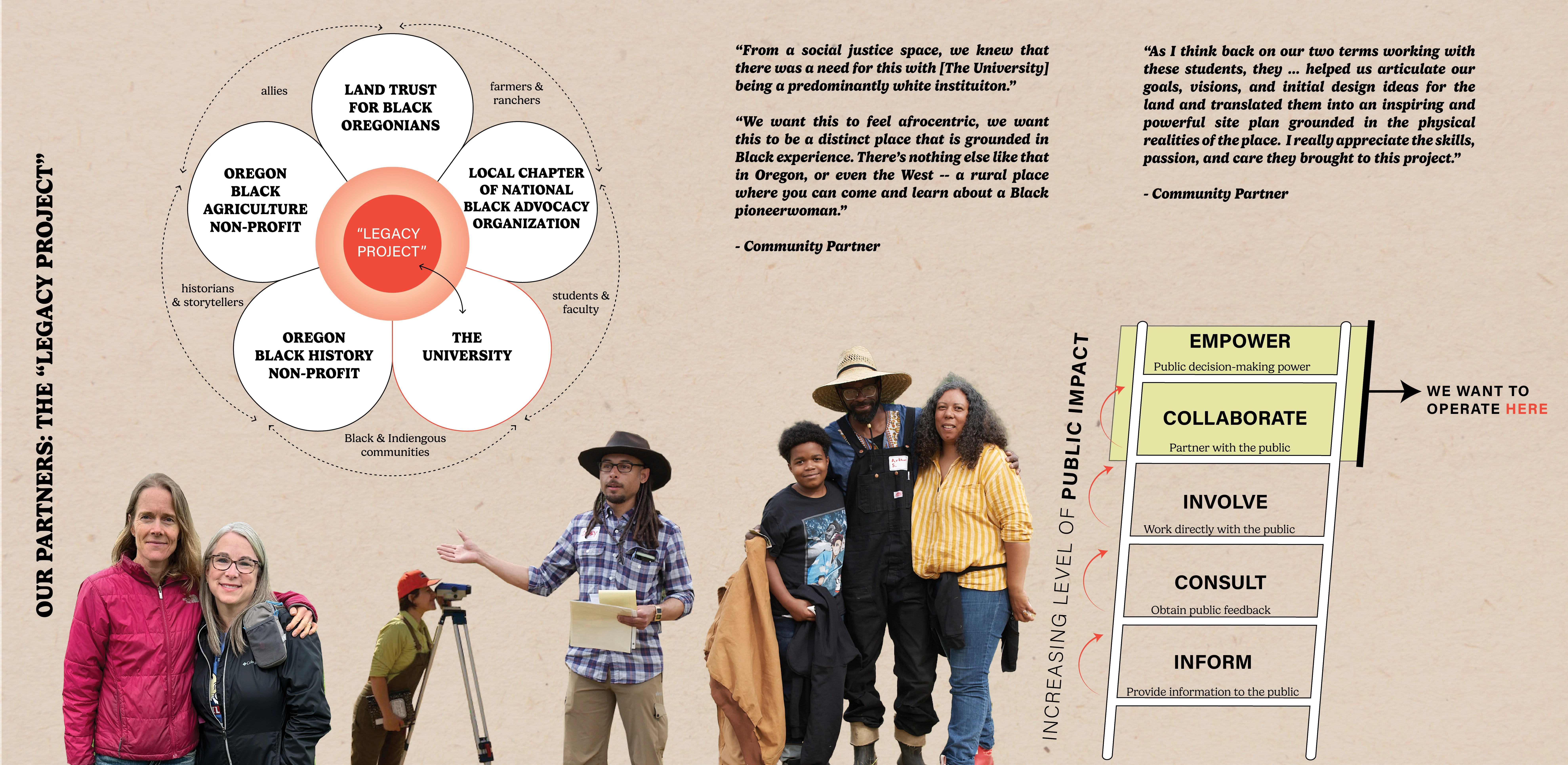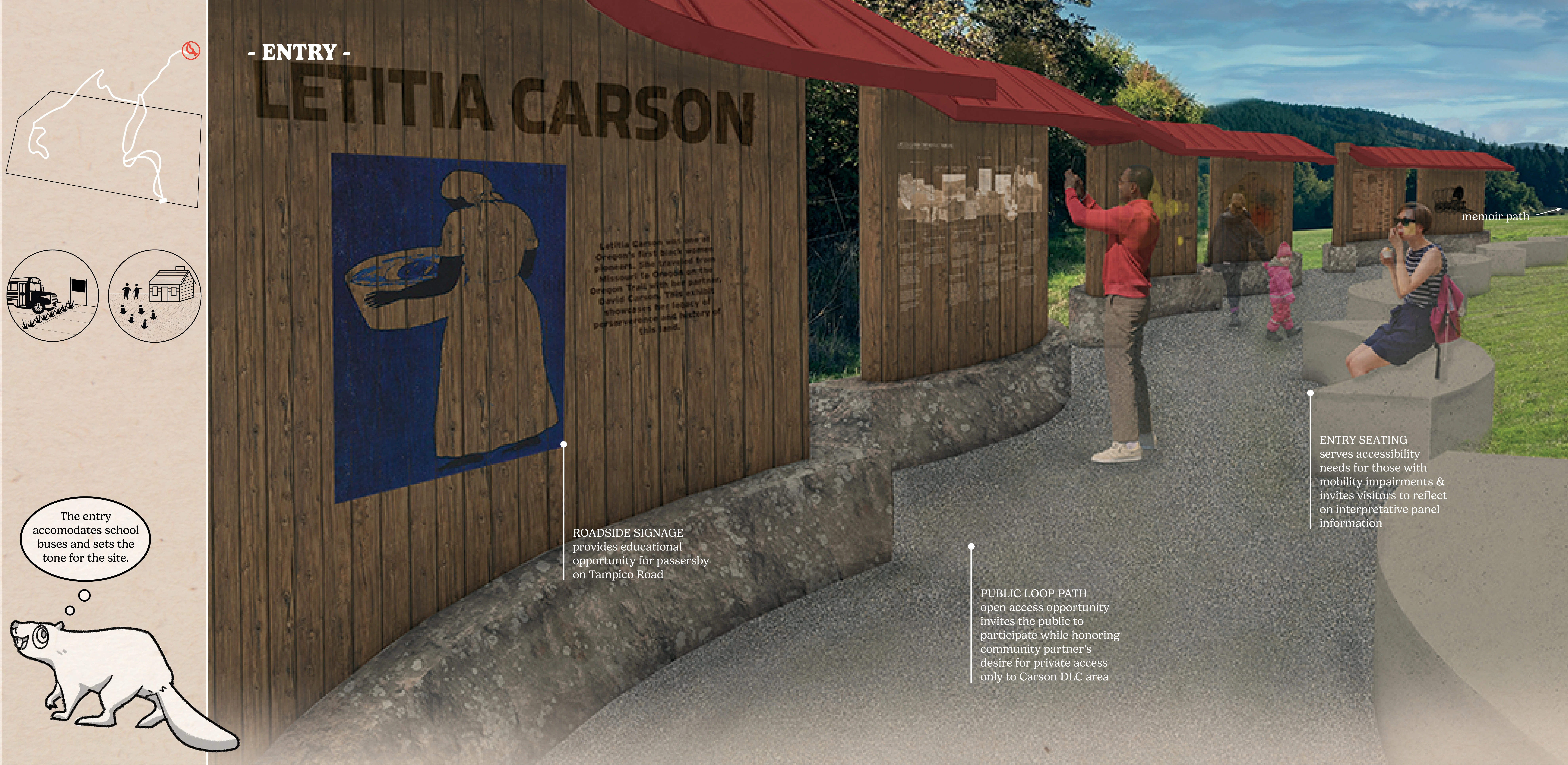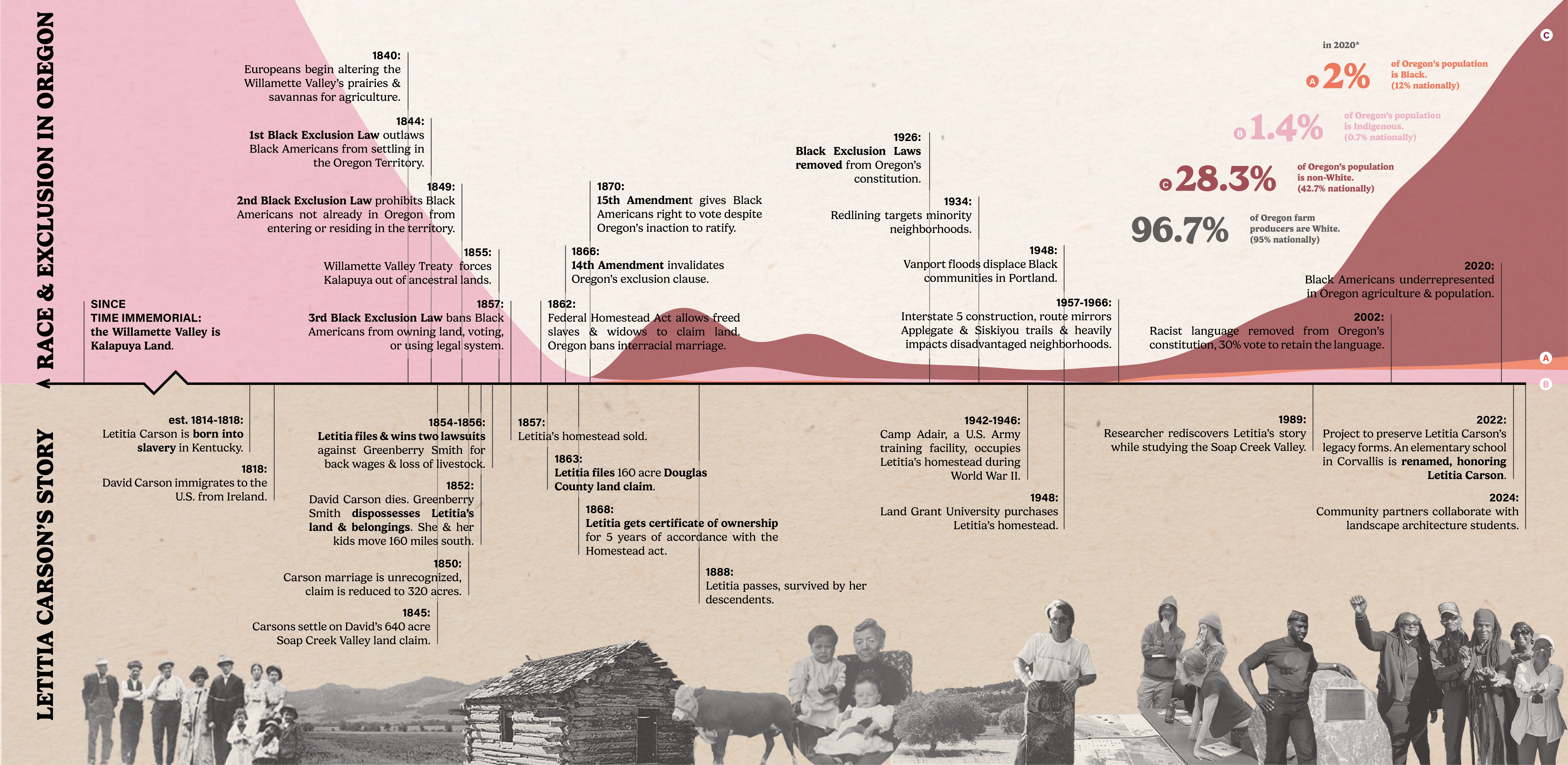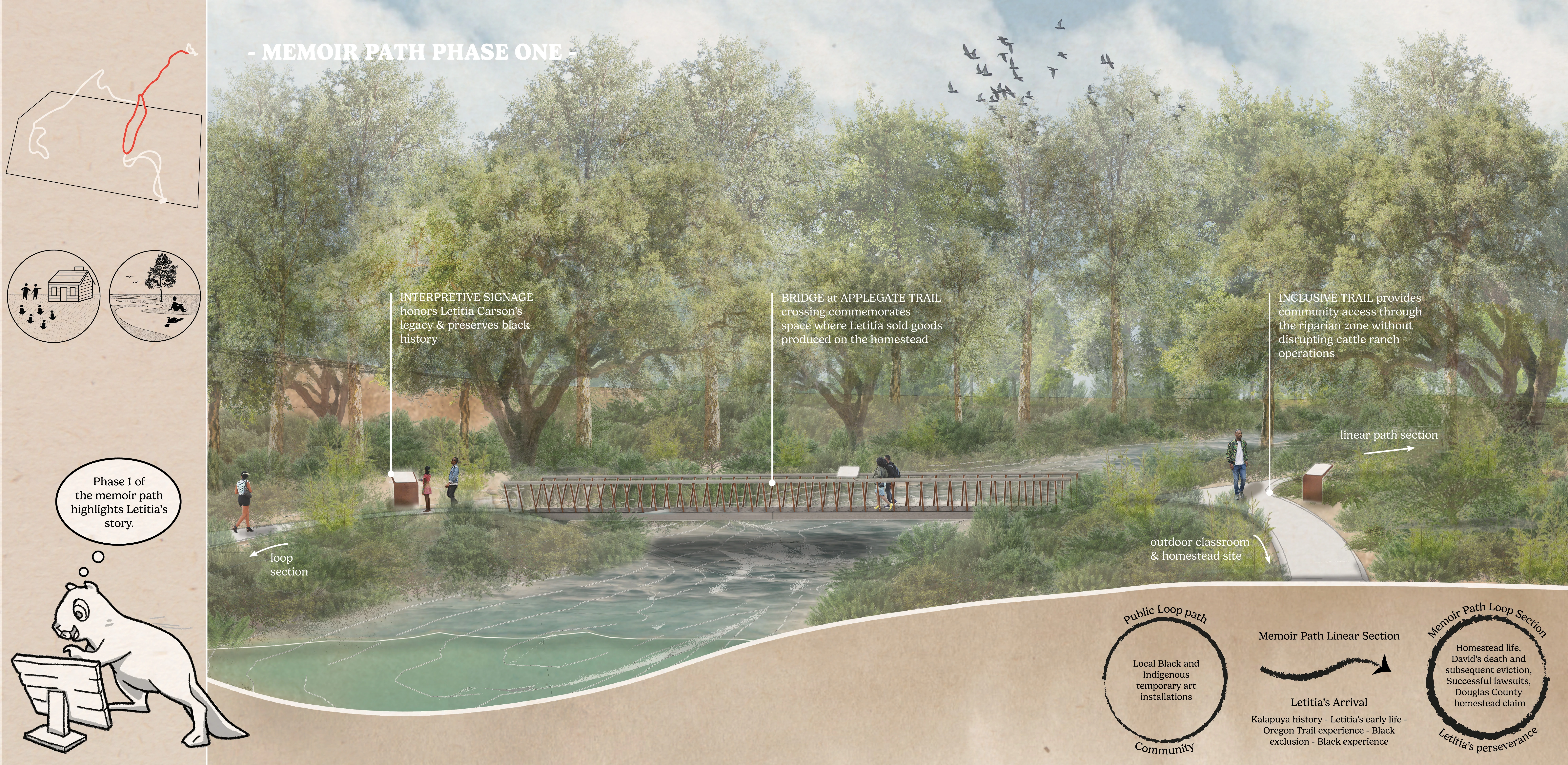 Letitia Carson’s Legacy utilizes the skills of landscape design to uplift several community organizations dedicated to honoring Letitia Carson, one of the first Black homesteaders in Oregon. This conceptual design made tangible the visions of our partners through the process of building authentic relationships and finding common ground through land stewardship. The final booklet has already been used to begin fundraising efforts, support grant applications, and gain approval to begin construction on Phase One. This studio addresses many challenging concepts, including the delicacy of telling a history embedded in narratives of race, gender, displacement, and colonialism, all while supporting current agricultural land use.