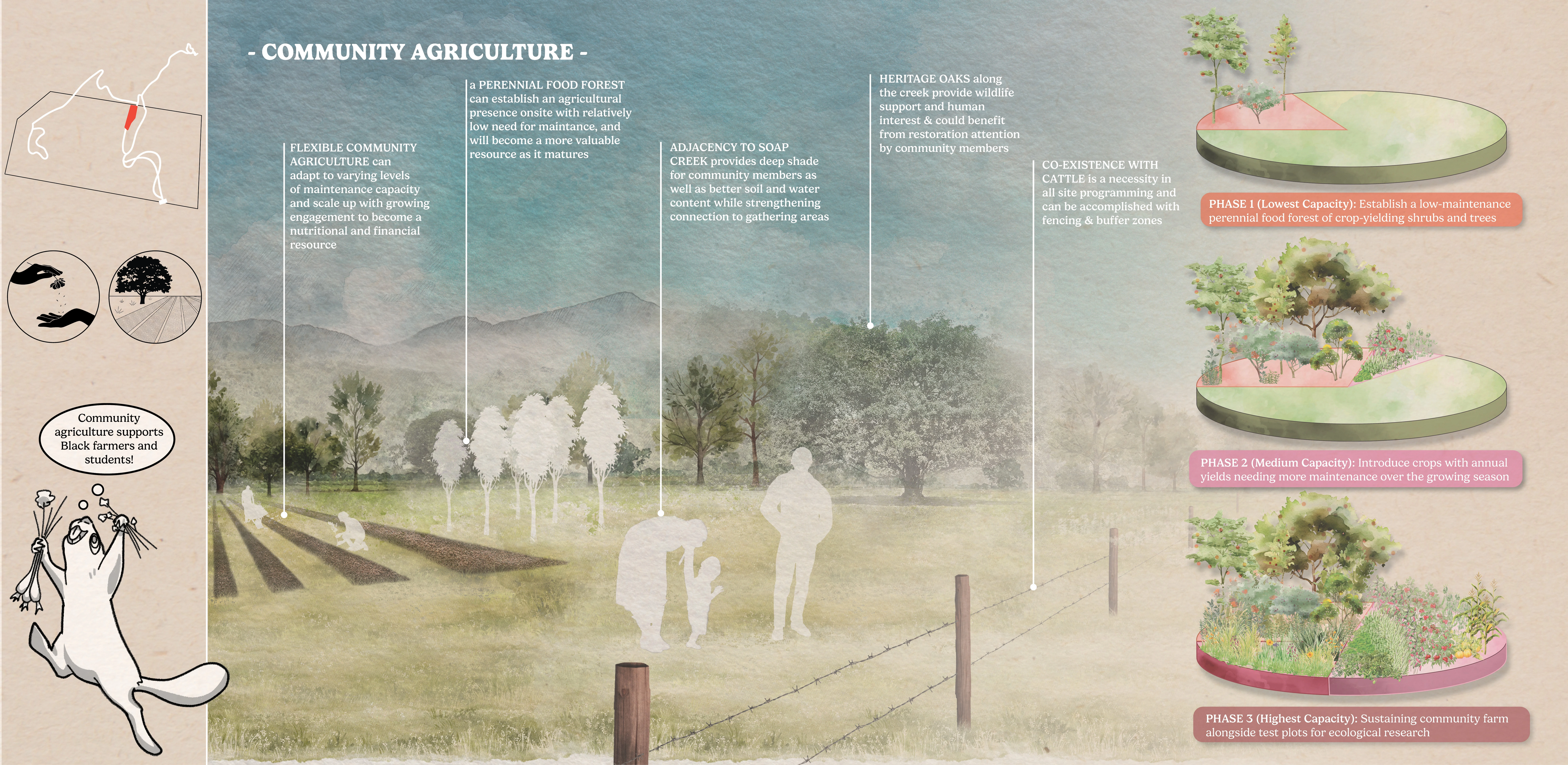 Working with the Legacy Project — a partnership between the land grant university, four Black-led community organizations, and an array of community stakeholders — this studio helped to examine the entangled past and present narratives of this site with an eye towards future programming. Our design process was guided by the goal of building authentic relationships, with active communication and extensive community engagement over 6 months. We approached this process with respect and curiosity, listening to our partners’ needs, desires, feelings, and experiences, and balancing the diverse perspectives of numerous stakeholders. Together we came up with project goals connected by an overarching theme of healing – healing ourselves, healing our community, and healing the land.