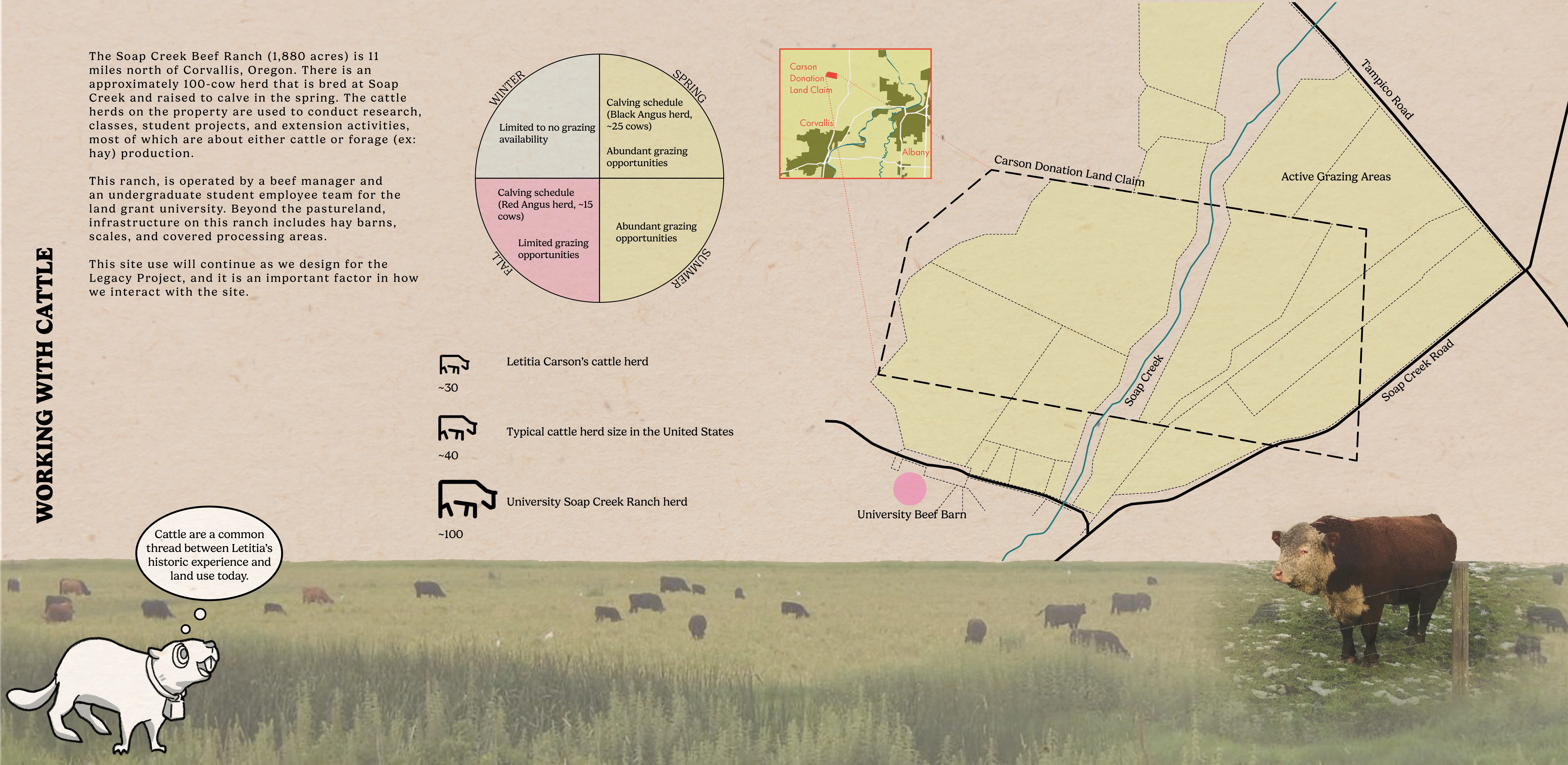 Letitia Carson’s Legacy works to highlight Letitia’s unsung story of resilience and bravery. Design elements reconnect Black and Indigenous communities to the land through education and stewardship and inspire reverence for Letitia’s story through Memoir Trails and an interpretive Homestead Site. The design works within the needs of the existing Beef Ranch, allowing for year-long rotational cattle grazing as currently scheduled. Instead of considering ranch operations as a limitation, this project celebrates current land-use by highlighting Letitia’s identity as a cattle rancher and linking past with present.