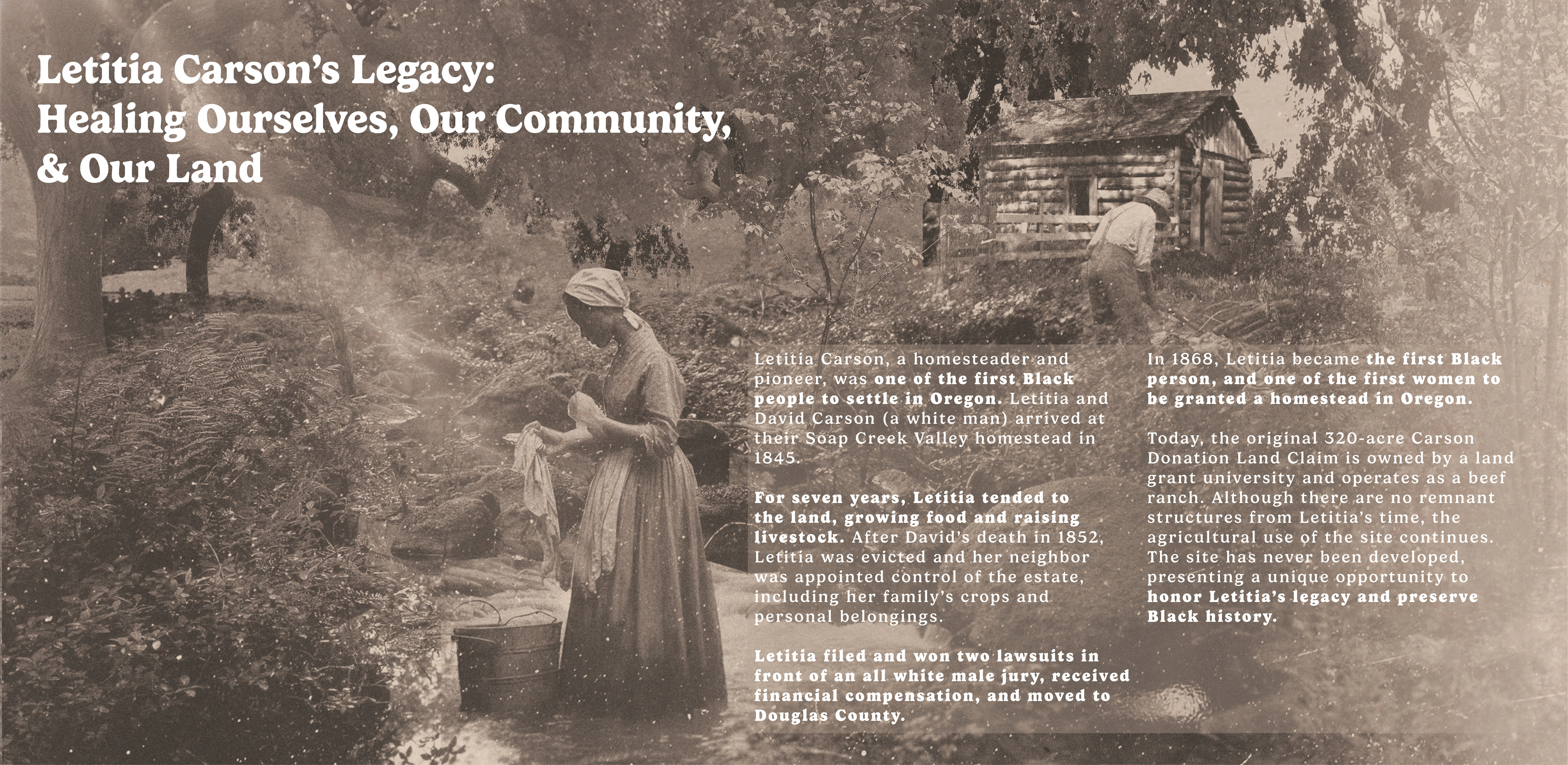 Letitia Carson, a homesteader and pioneer, was one of the Black women to settle in Oregon. She and her white male partner, David Carson, arrived at their Soap Creek Valley homestead in 1845 after a five-month journey along the Oregon Trail. The Carson’s 320-acre Donation Land Claim sits in Benton County, 11 miles north of Corvallis, Oregon on the ancestral homelands of the Kalapuya people. Today, the Carson’s historic Donation Land Claim is owned by a land grant university and is under operation as an educational beef ranch. The site has never been developed, offering the opportunity to celebrate and commemorate Black and Indigenous history through the agricultural landscape.