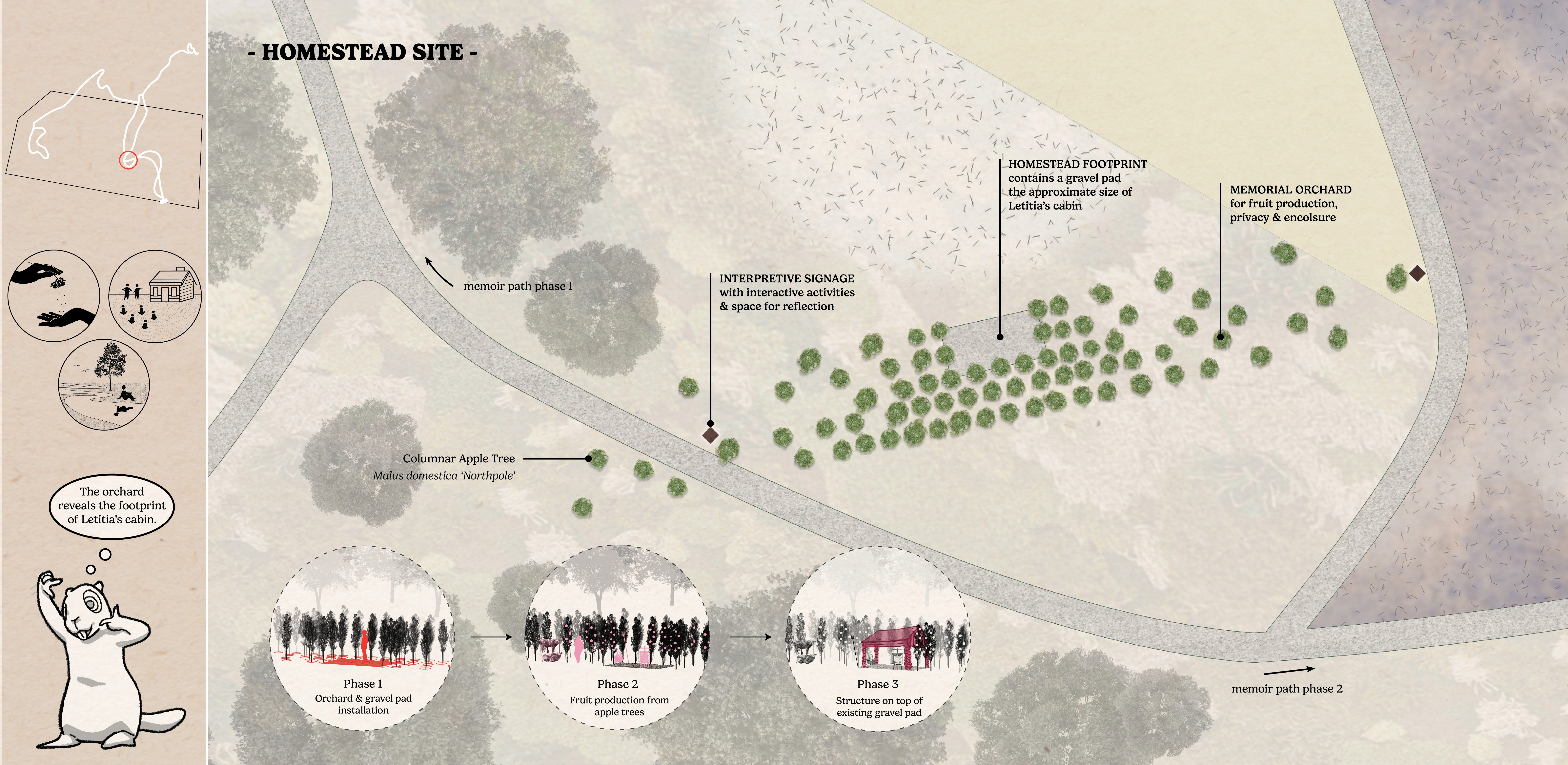 Our design proposal seeks to provide opportunities for Black and Indigenous community members, students, and allies to engage with Letitia’s land. This site could be the only place in the rural West for people to learn about Black pioneer history on the same land it happened on. This flexible space aims to provide opportunities for reflection, connect Black and Indigenous community members across generations, and raise awareness about Letitia’s story through place-based historical education.