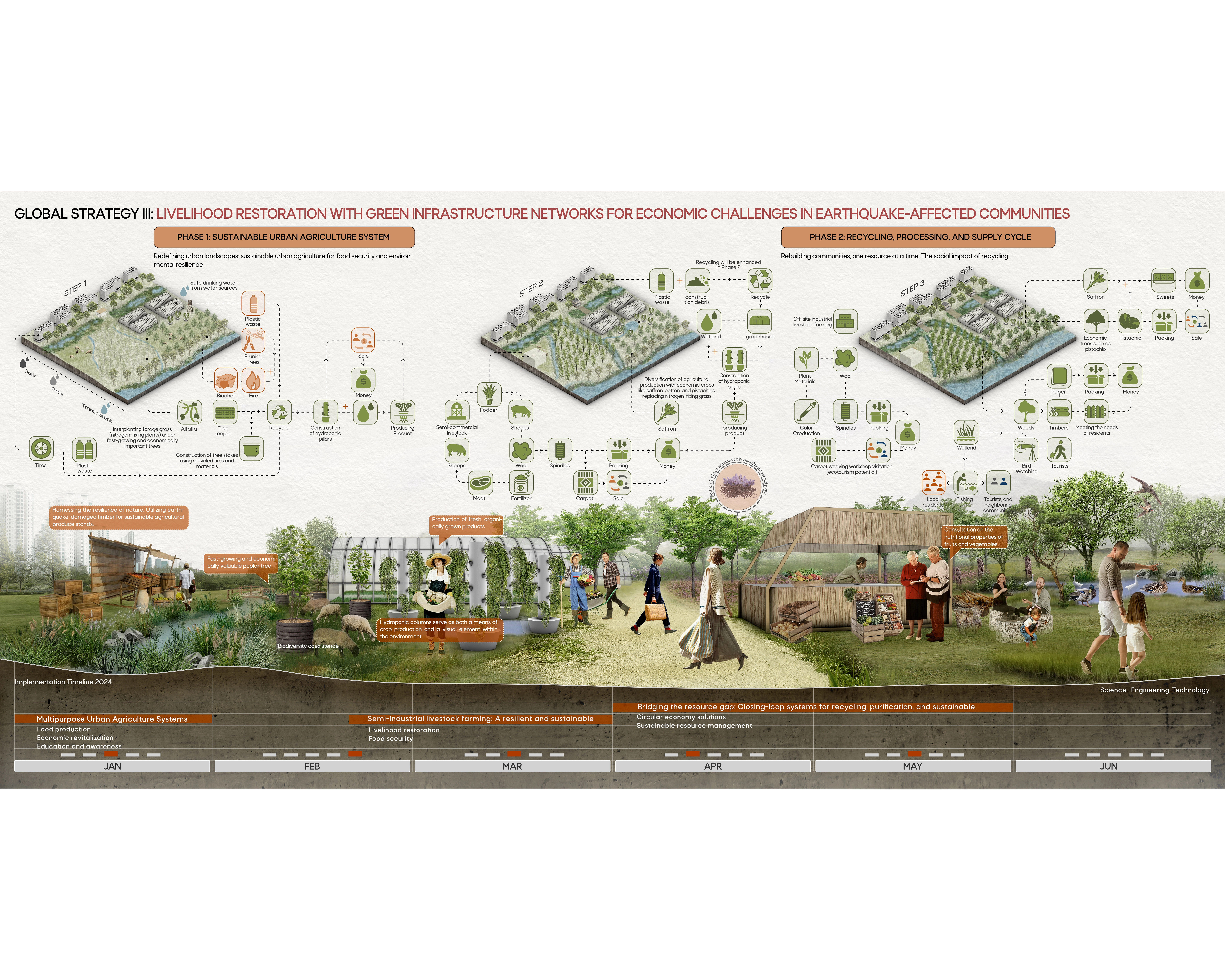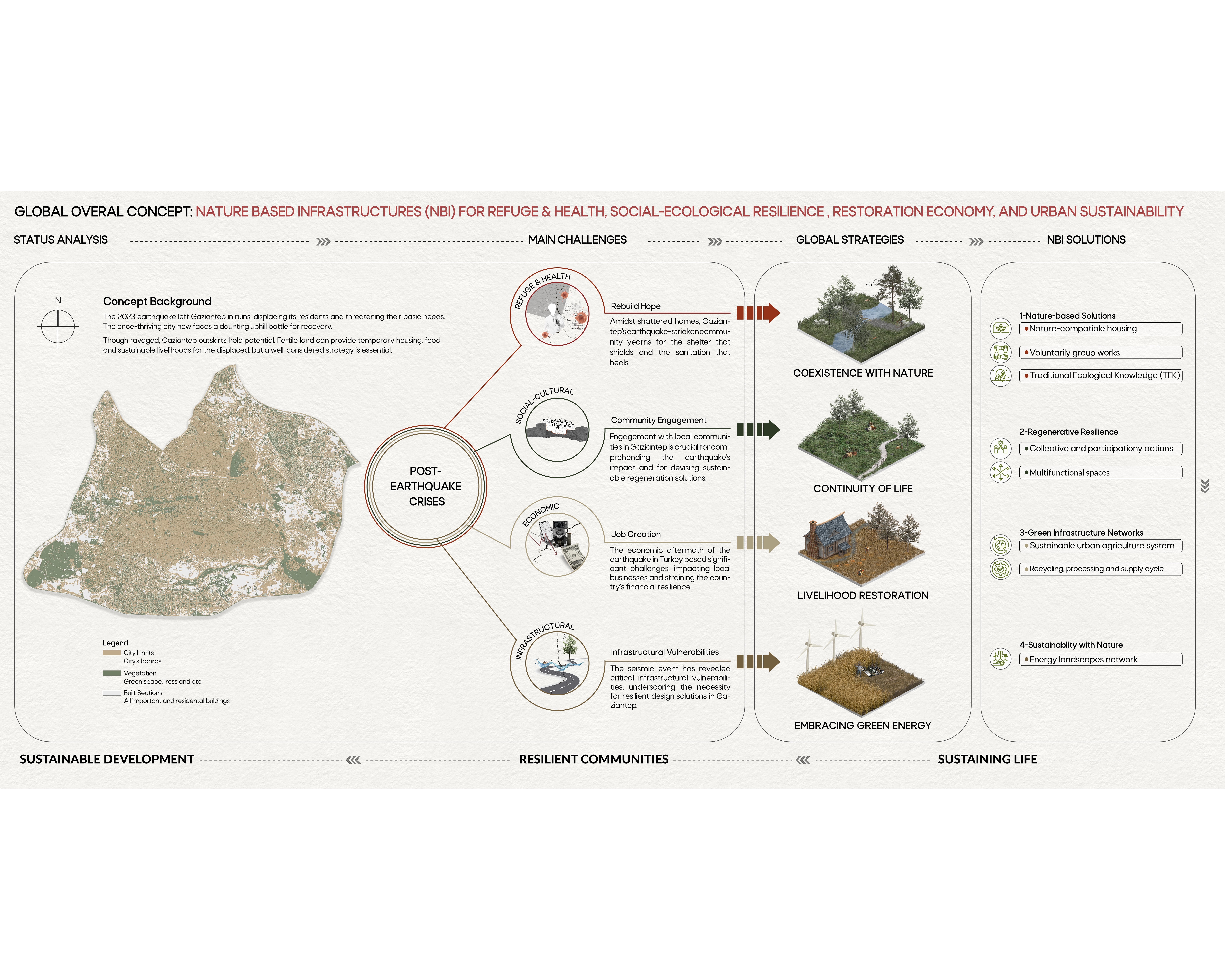 This project encompasses a comprehensive study of nature-based infrastructures (NBI) global concept that leverages the unique opportunities presented by nature to address the city's post-earthquake challenges. We are visually oriented people, with the tools of art and knowledge of natural science, produce creative works that improve people’s lives and the health of our planet [1]. Leveraging nature's ability to provide ecosystem services, the strategy tackles multifaceted challenges like infrastructure damage, environmental degradation, and socioeconomic disruption. Ecological planning encompasses a broad spectrum of natural, biological, and social sciences that are aligned with ecological perspectives [2].By integrating NBI into planning and design, cities can rebuild and emerge more adaptable to future natural disasters.Project Goals