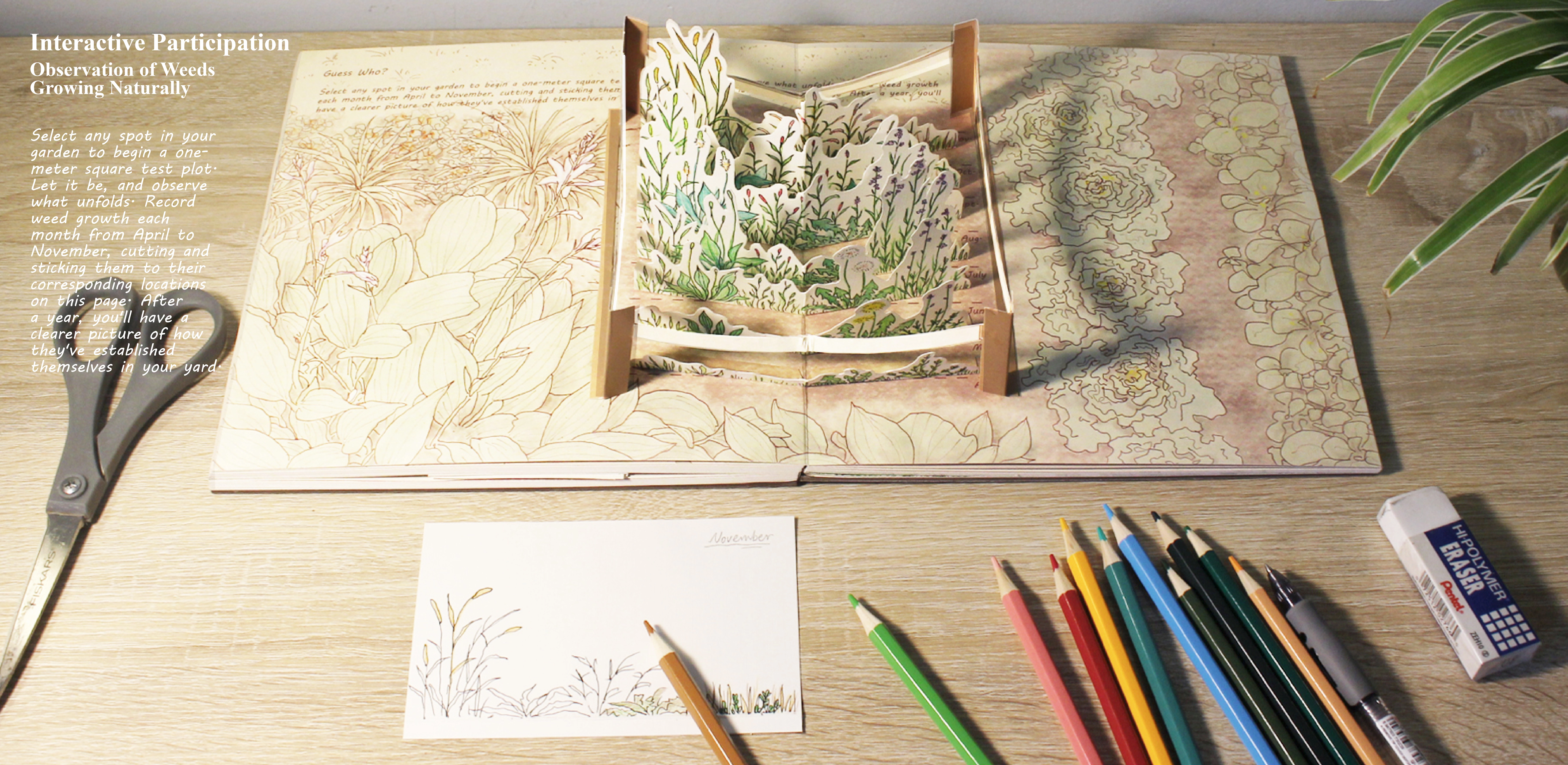As important components of urban green infrastructure, the ecological potential in domestic gardens is not taken seriously by the landscape architecture academia nowadays. The widely used methods of weed control are highly resource-intensive, unhelpful, or even harmful to our urban ecosystem. By targeting teenagers who are more open to new perspectives and will become future garden owners, our picture book Wonderland of Weeds is an exploration of the participatory medium to help the public equipped with enough interest, awareness, knowledge, and skills to start managing weeds in a better way so that individual gardens can contribute to the overall urban ecosystem.