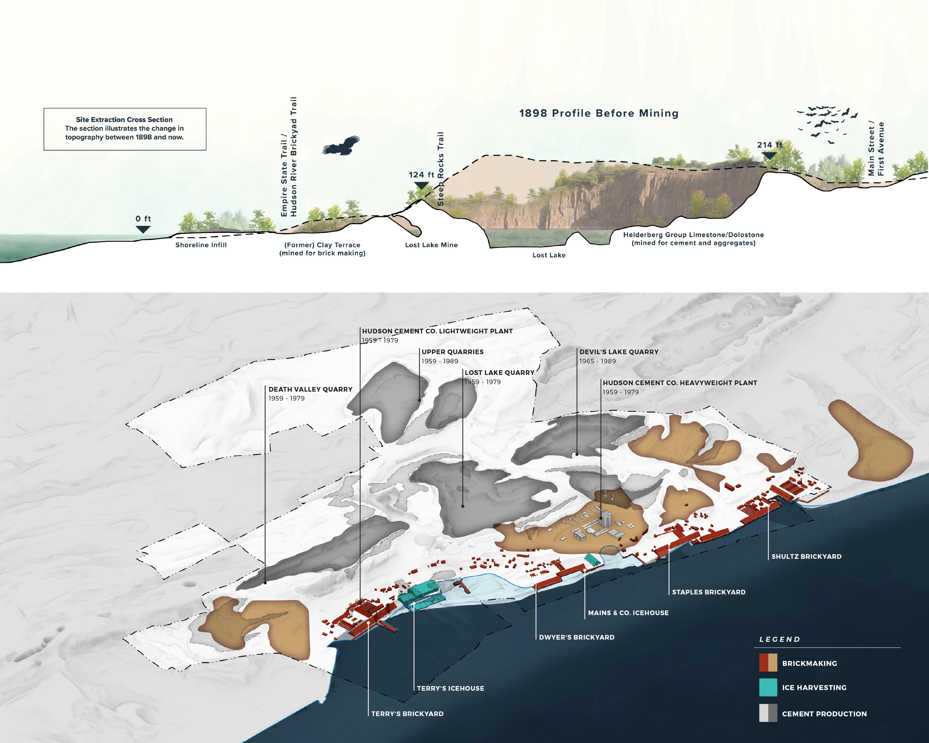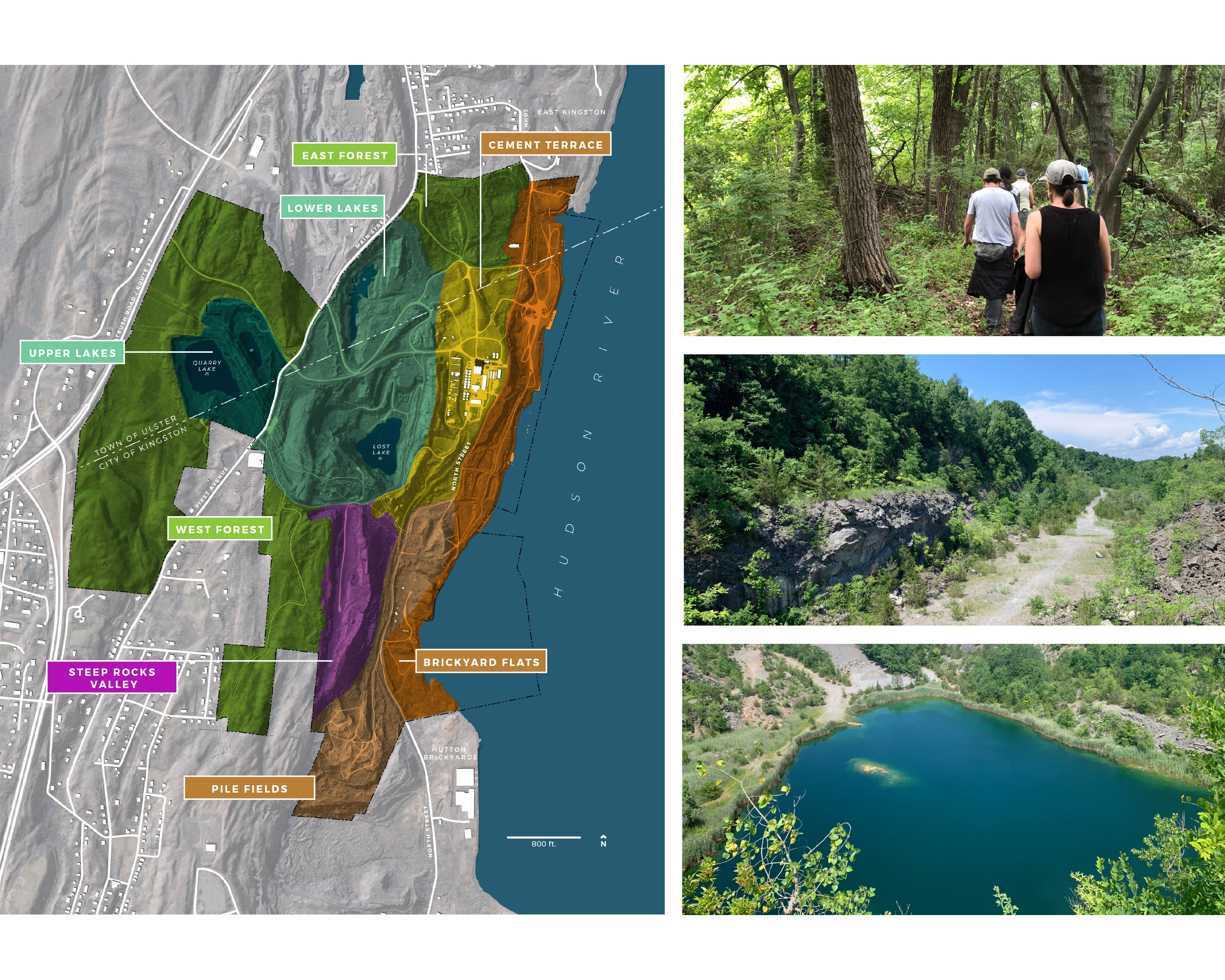 Context: Situated on 520-acres of abandoned quarry land in the City of Kingston and adjacent to the Town of Ulster, the site includes diverse natural features such as woodlands, wetlands, quarry lakes, and Hudson River waterfront. The area's history spans from its pre-industrial home to the Esopus people and later as the "Kingston Commons," and through a century of extractive industry use and abandonment, led to its current state: part wild and heavily degraded. The plan is deeply informed by understanding local communities of the area including diverse Black and Hispanic communities.