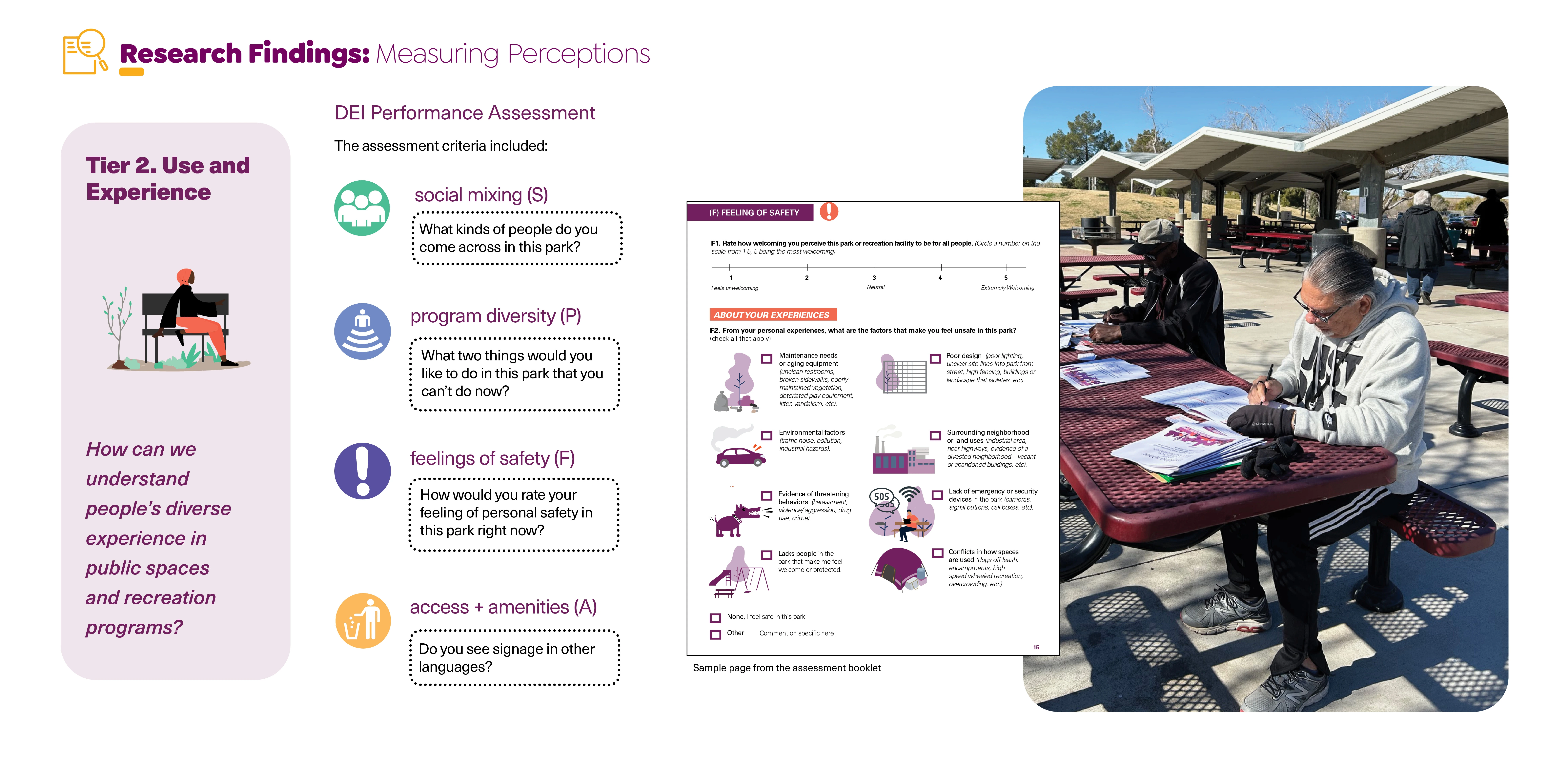 A growing body of research examines the continued devastation of policies and bias facilitating inequities in park provision. This study provides the most comprehensive look at geographic-based disparities amidst diverse populations. It expands research to include public health and climate change implications and examination of city operations. One innovation is measuring complex qualities of green spaces, recreation offerings, and public gatherings: an assessment tool to understand cultural inclusion and a sense of safety. Multiple methods elevate diverse community member perceptions to drive changes in policies and target equitable investments. This methodology is poised to change the field of public space planning and design.