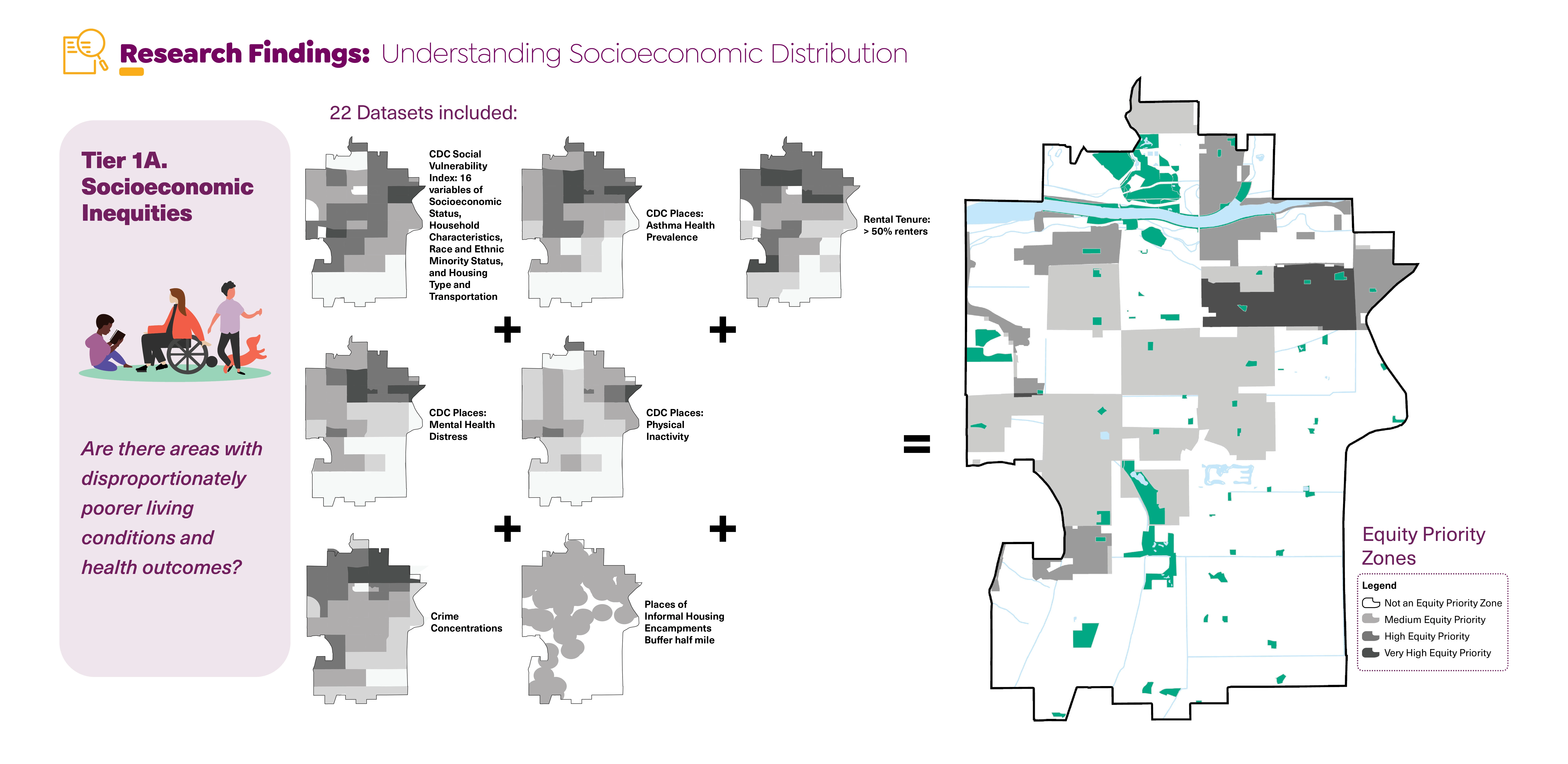 The inquiry phase included a review of Tempe’s existing planning and policy documents, a review of the city’s historic land planning practices, local factors effecting climate resilience, and a synthesized case study analysis comparing equity reports for peer communities and best practices. The second phase focused on generating an equity analysis framework (based on tier 1 data), highlighting systemic inequities around socioeconomic disparity and environmental impact data, and park distribution, condition, and investment trends. The third phase paired with findings from the second phase involved a robust community engagement campaign comprised of community navigator-led park assessments, park intercept surveys, neighborhood pop-up events, topical focus groups, and staff surveys (tier 2 data). This ultimately informed the fourth research phase that translated the rigorous analysis process into actionable next steps for the City to undertake in partnership with local stakeholders.