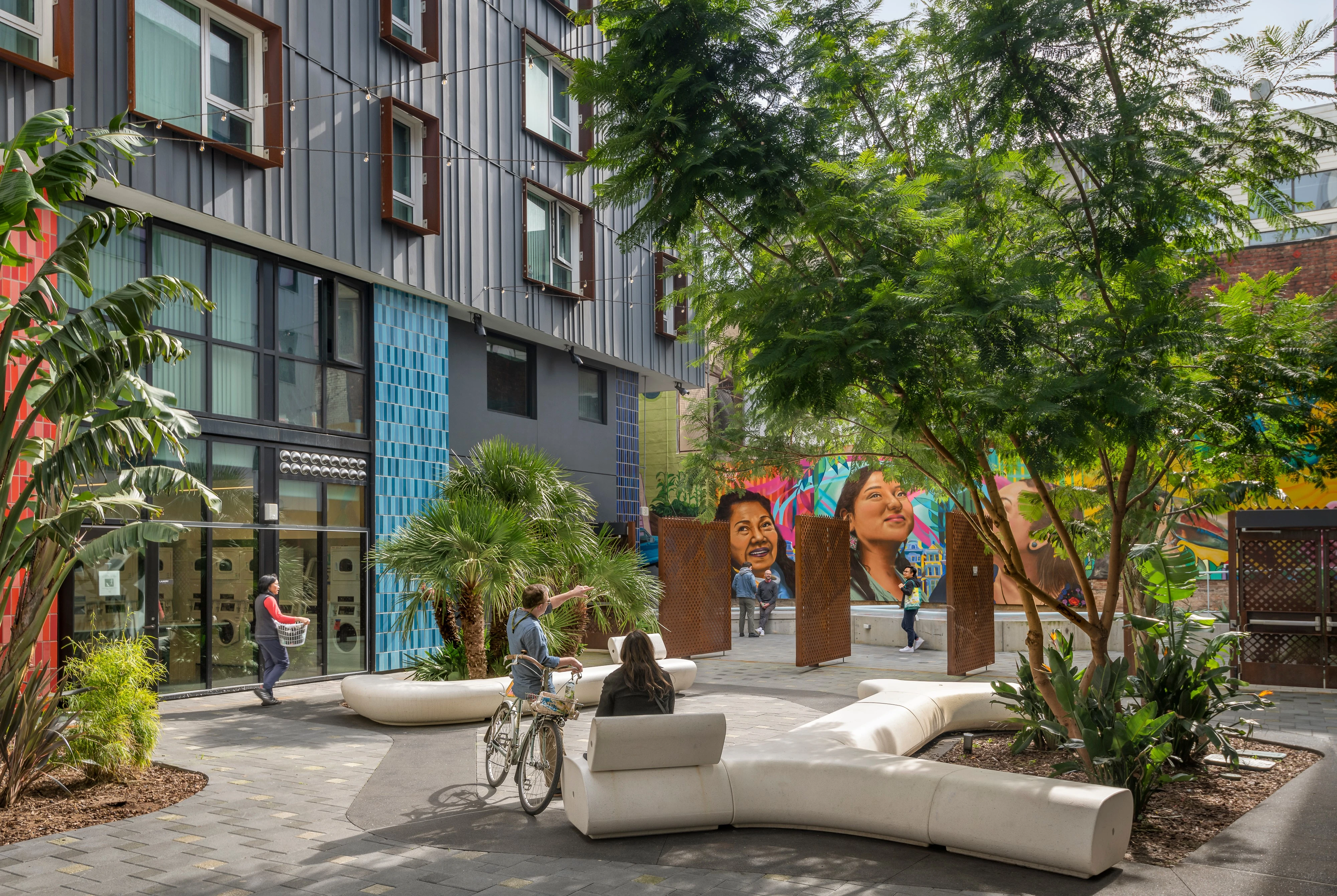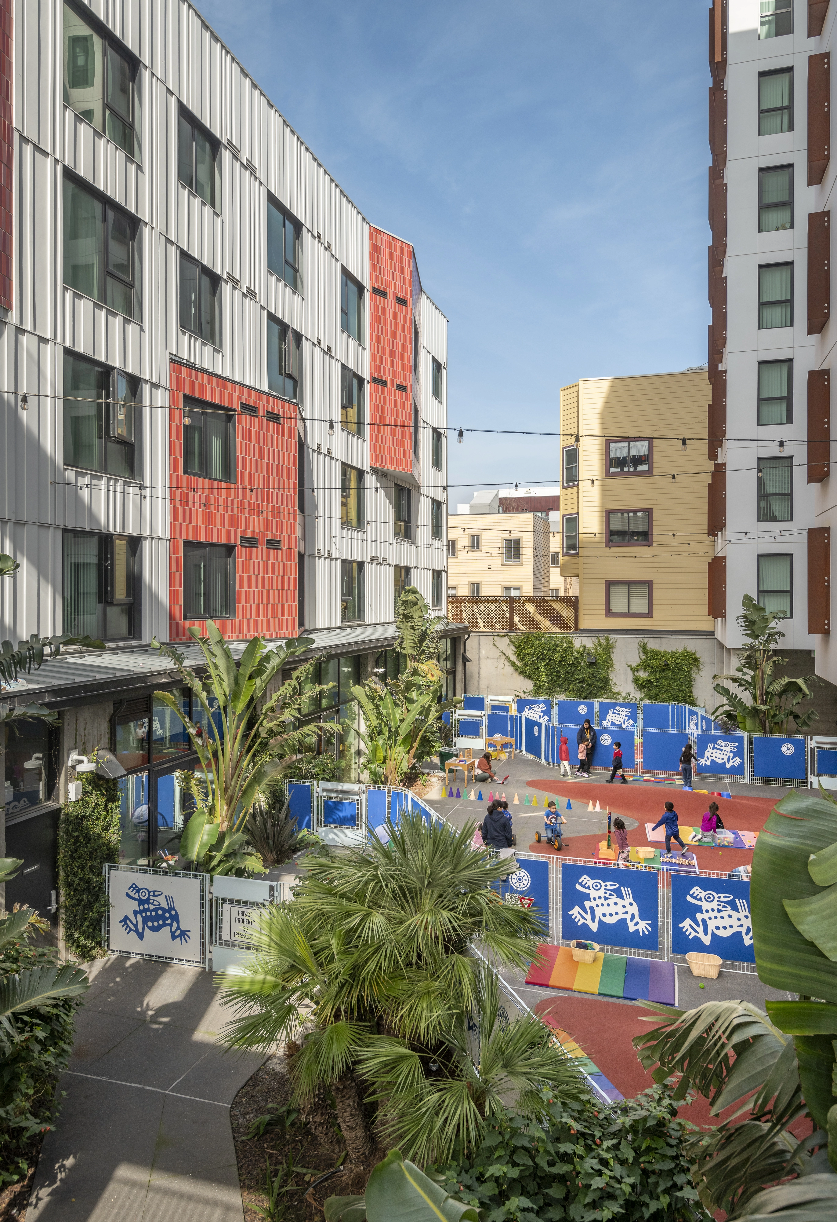 San Francisco’s Mission District has been an epicenter of gentrification for 25 years. La Fénix at 1950 provides 157 affordable homes for displaced and unhoused families in the Mission, as well as a home for nonprofit service providers. The ground level courtyard, or Zócalo, links amenities to encourage community building. The Paseo de Artistas opens to the street and is lined with murals, low-cost artist studios, and classrooms for free art education. At the Jardin de las Familias, a roof deck planted with natives and southwest plantings provides a play area with panoramic city views. A partnership of community nonprofits led the engagement process, allowing the design to be guided by long-term neighborhood constituents.