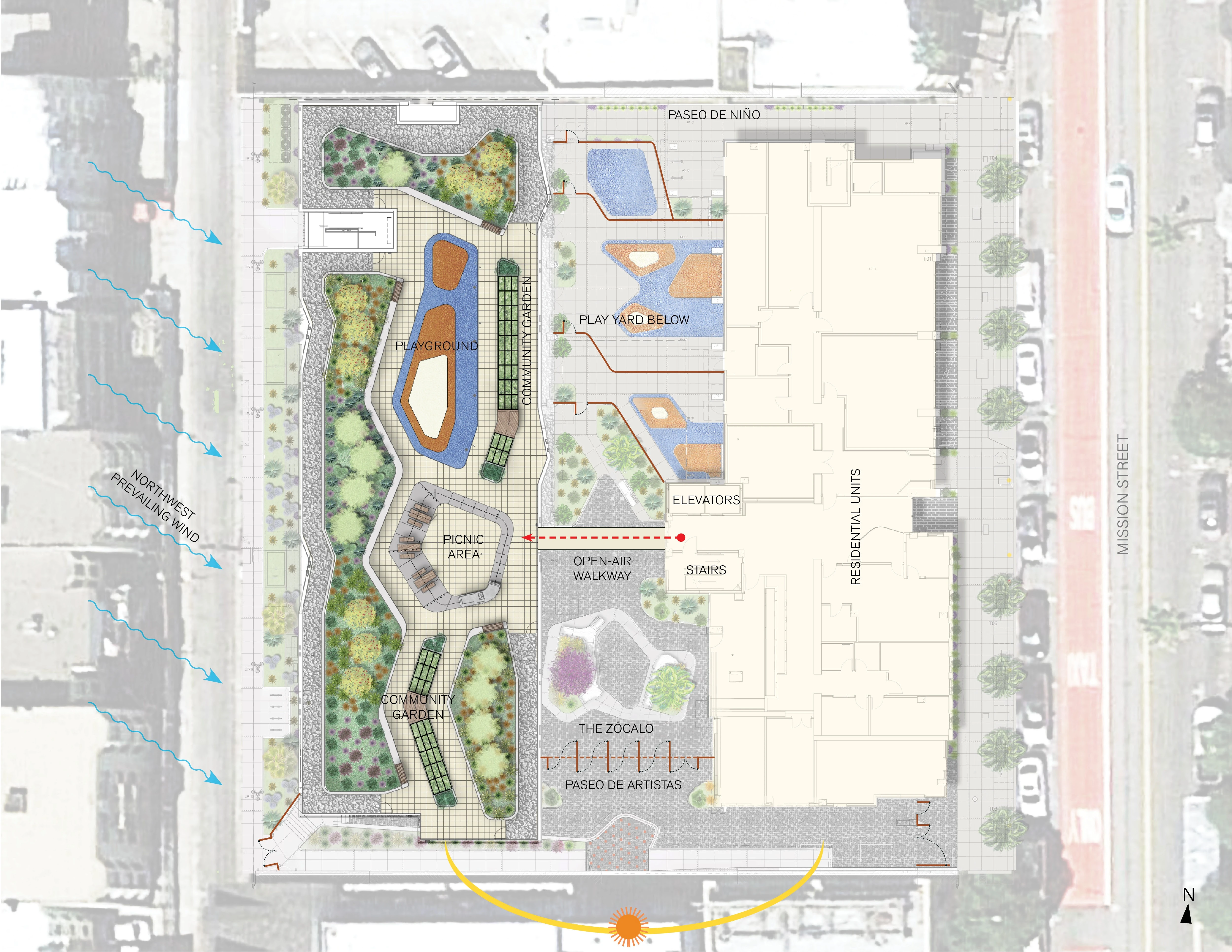 The Jardin de la Familias, or the family garden, is a roof terrace six floors above the hustle of the Mission. With panoramic views to Twin Peaks and Downtown, it creates a safe play space and a respite from the street. Native drought-tolerant and southwest plant species create a verdant subtropical garden and enhance urban biodiversity, with bees and hummingbirds regularly visiting the rooftop.