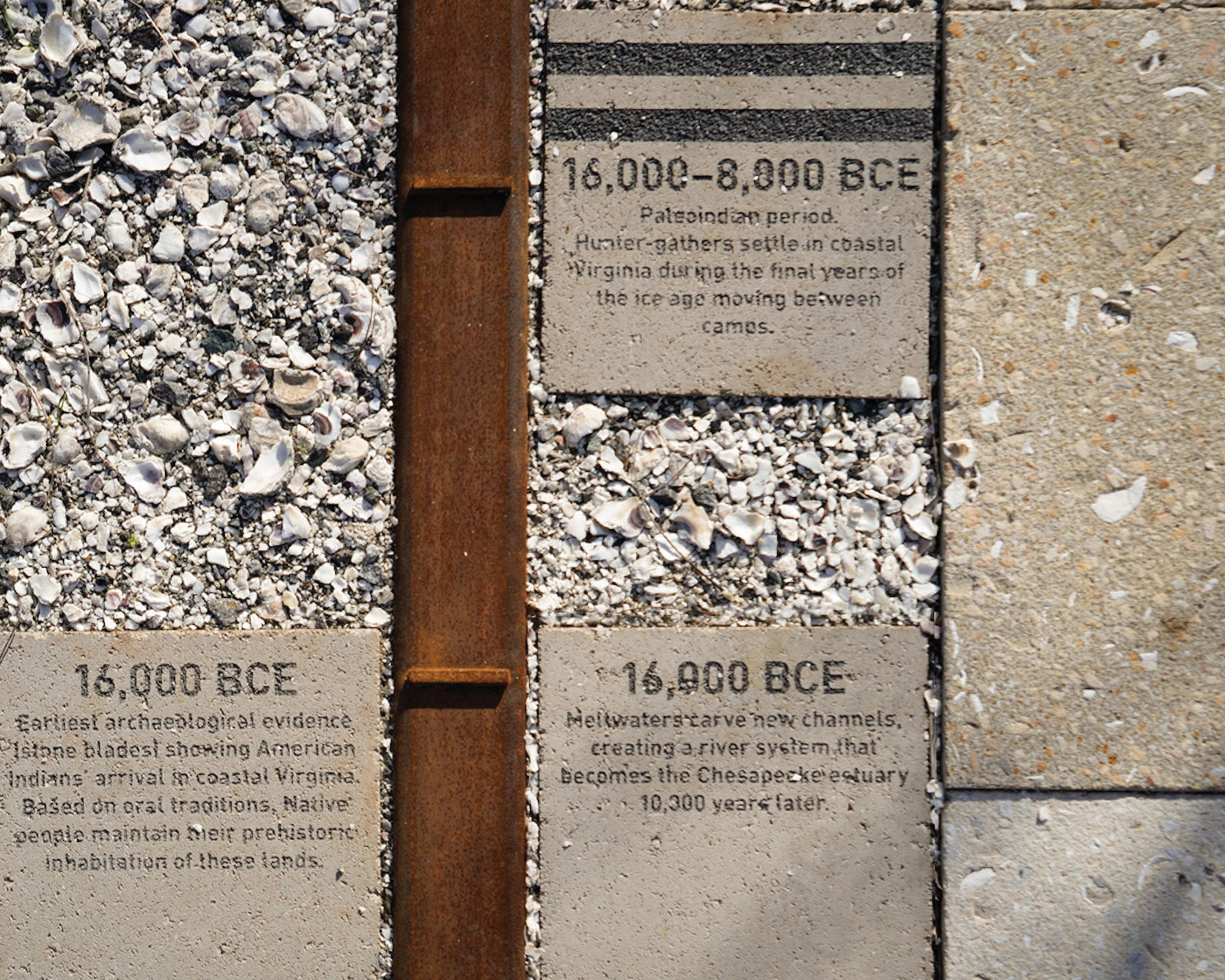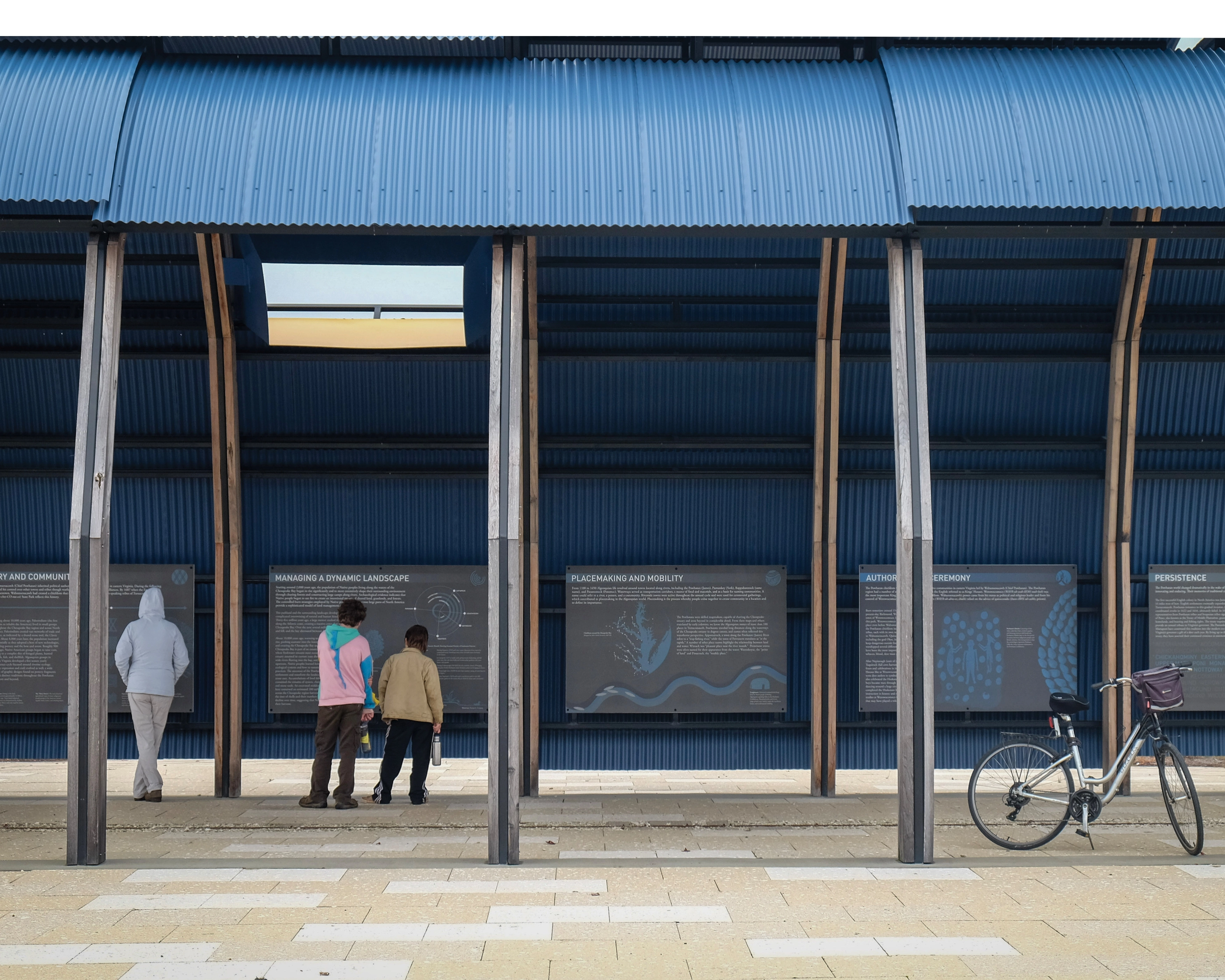The Interpretive Pavilion, the main visitor entry point, integrates materials and spatial design with revelatory content. Before entering the pavilion to reach the landscape, visitors pass a cubelike sculptural representation of a shell midden, a type of repository of shellfish remains found in locations around the world left behind by coastal peoples. The sculpture refers to archaeological work identifying Algonquian oyster shell midden in and around the park land. The simple cubic form also harkens to the universal importance of data, knowledge, and evidence in unearthing important histories.
