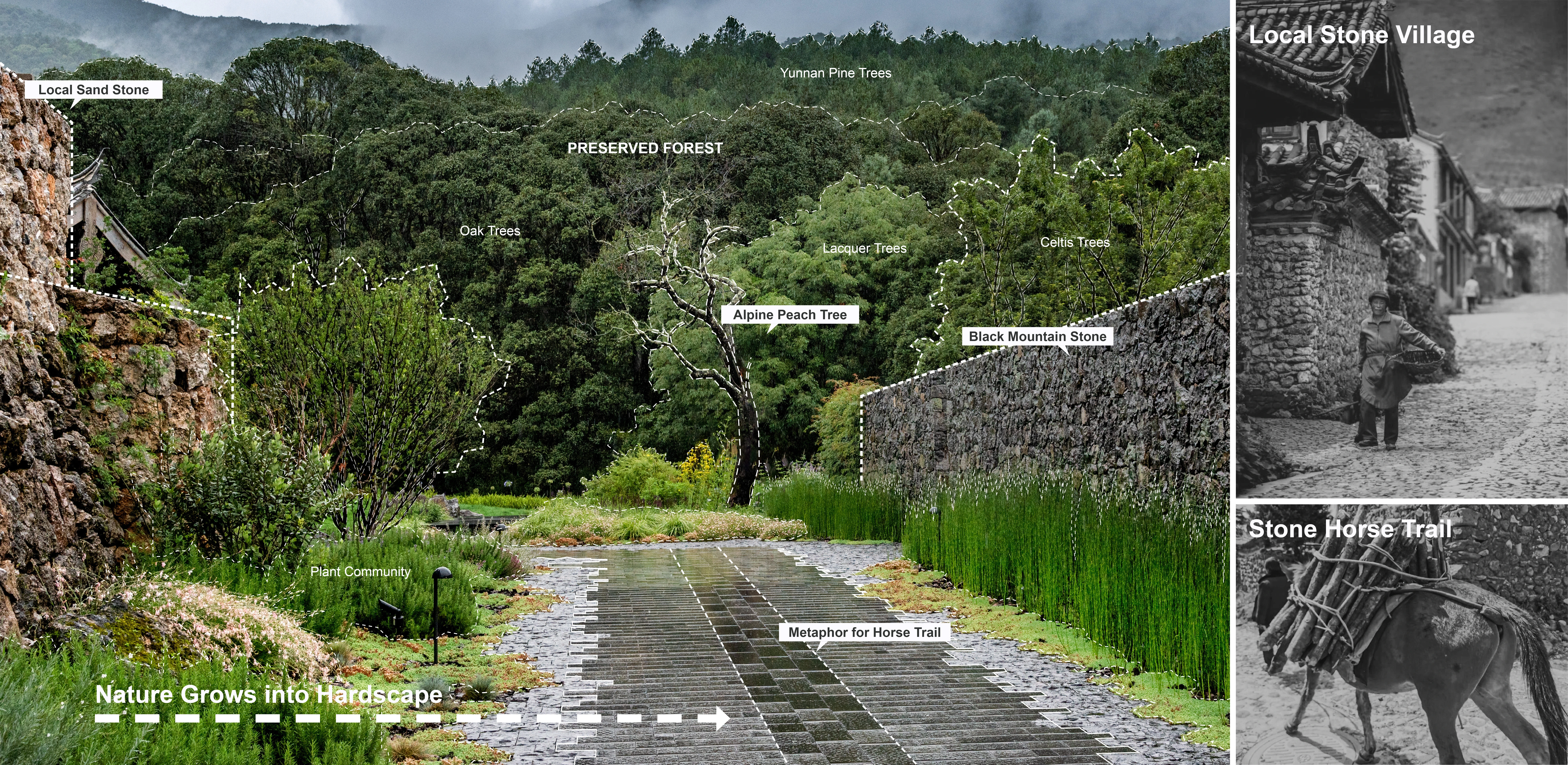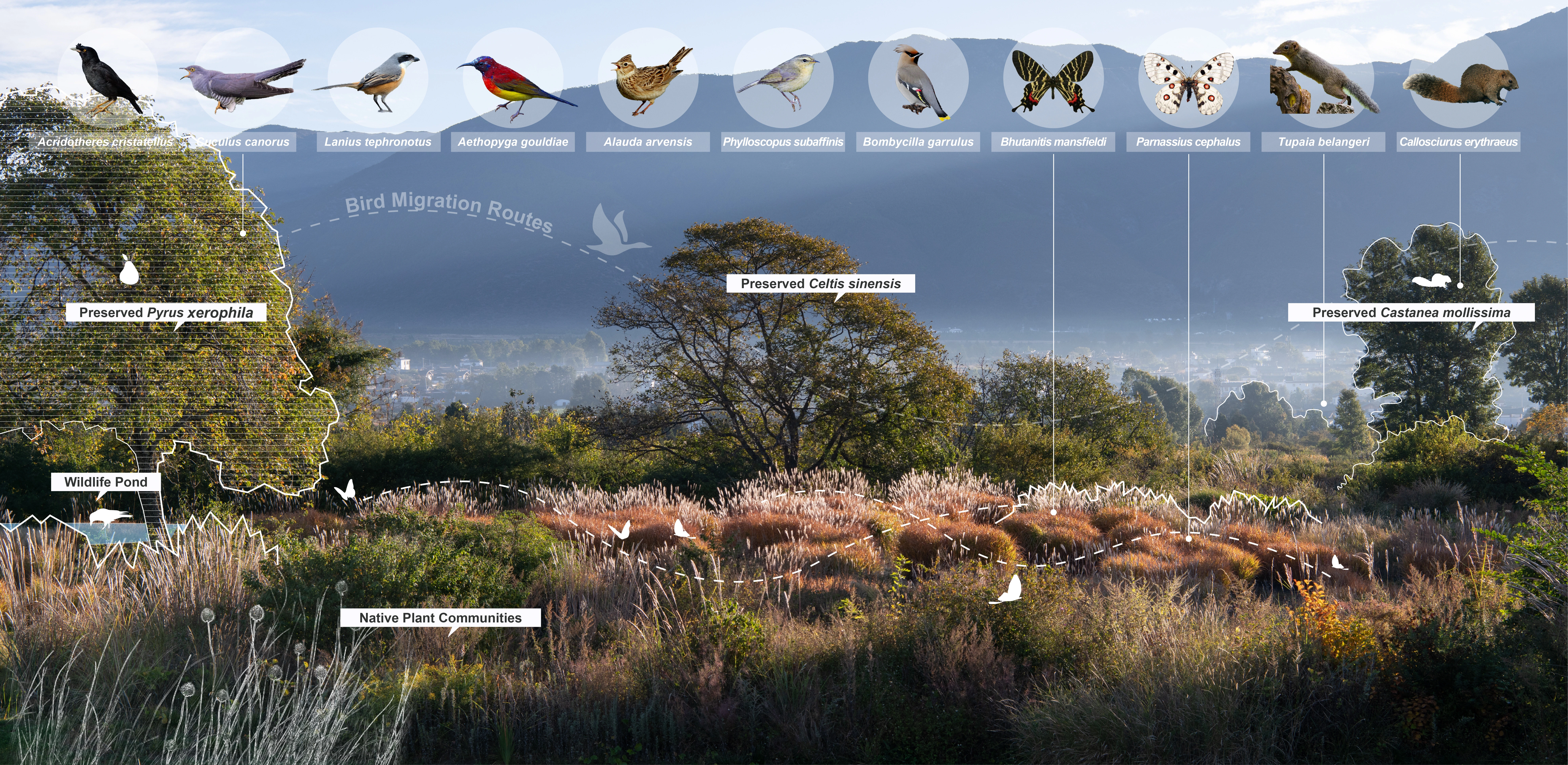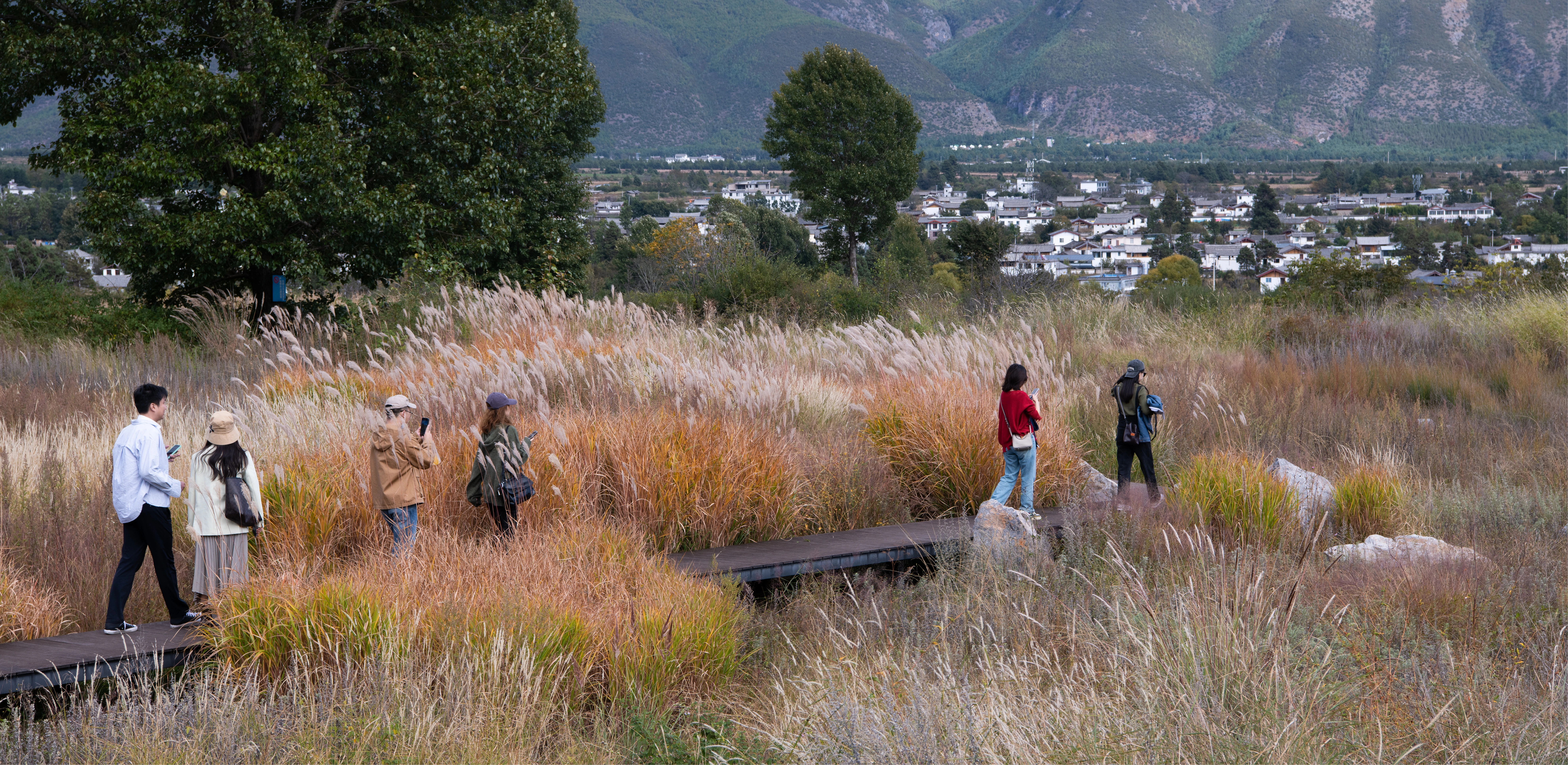While restoring 90% of the native plant communities, the design transforms the space into a diverse alpine habitat. Conserved walnut and pear trees offer food and nesting spaces for birds. The boardwalk is elevated by 60cm to ensure undisturbed movement for animals and insects. Rocks not only act as aesthetics element but also serve as shelter for wildlife. The perennial meadow serves as a vital feeding and nesting habitat for pollinators throughout the year. The wilderness garden has become an outdoor educational center focusing on the importance of indigenous plants and wildlife to the biodiversity of Lijiang.