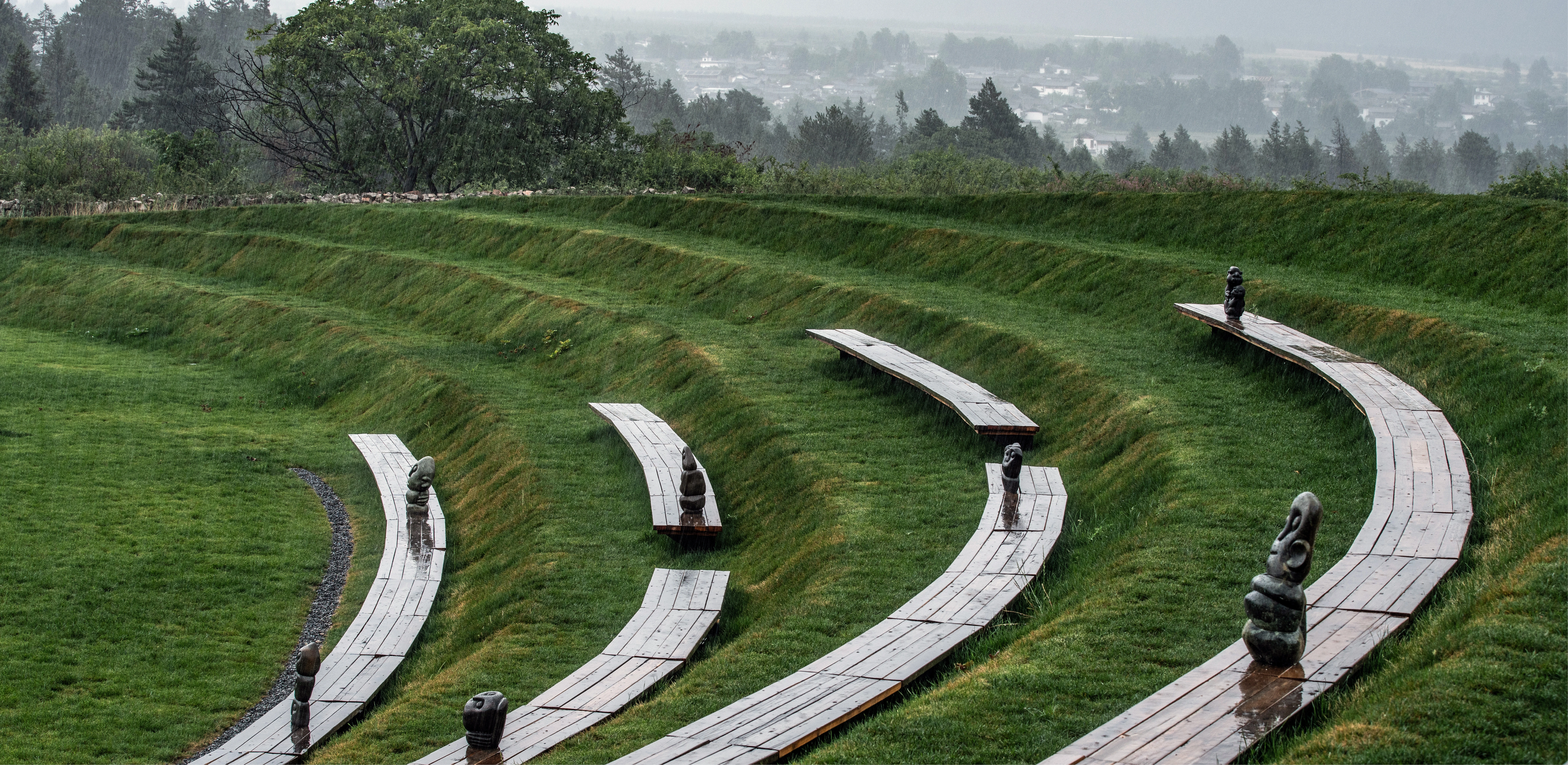 The landscape design, shaped through the community engagement process, was enriched by the cultural context and experiences of tribal stakeholders, fostering a deep understanding of identity, culture and nature. With uncompromising craftsmanship, local stonemasons and carpenters executed all tasks related to stone and wood, utilizing materials sourced from within a 50 km radius. By using traditional techniques to carve and stack, they deliberately remained subtle texture details on every stone while making the design form contemporary and simple. The team carefully kept the tribal spiritual tree, Xupai, untouched and used it as a visual focal point to create culturally sensitive landscape which blends together new and old seamlessly. In response to the surrounding farmland context, the meandering wooden boardwalk led visitors through a characteristic alpine lawn interspersed with shamrocks, symbolizing the linear ridges of wheat fields.