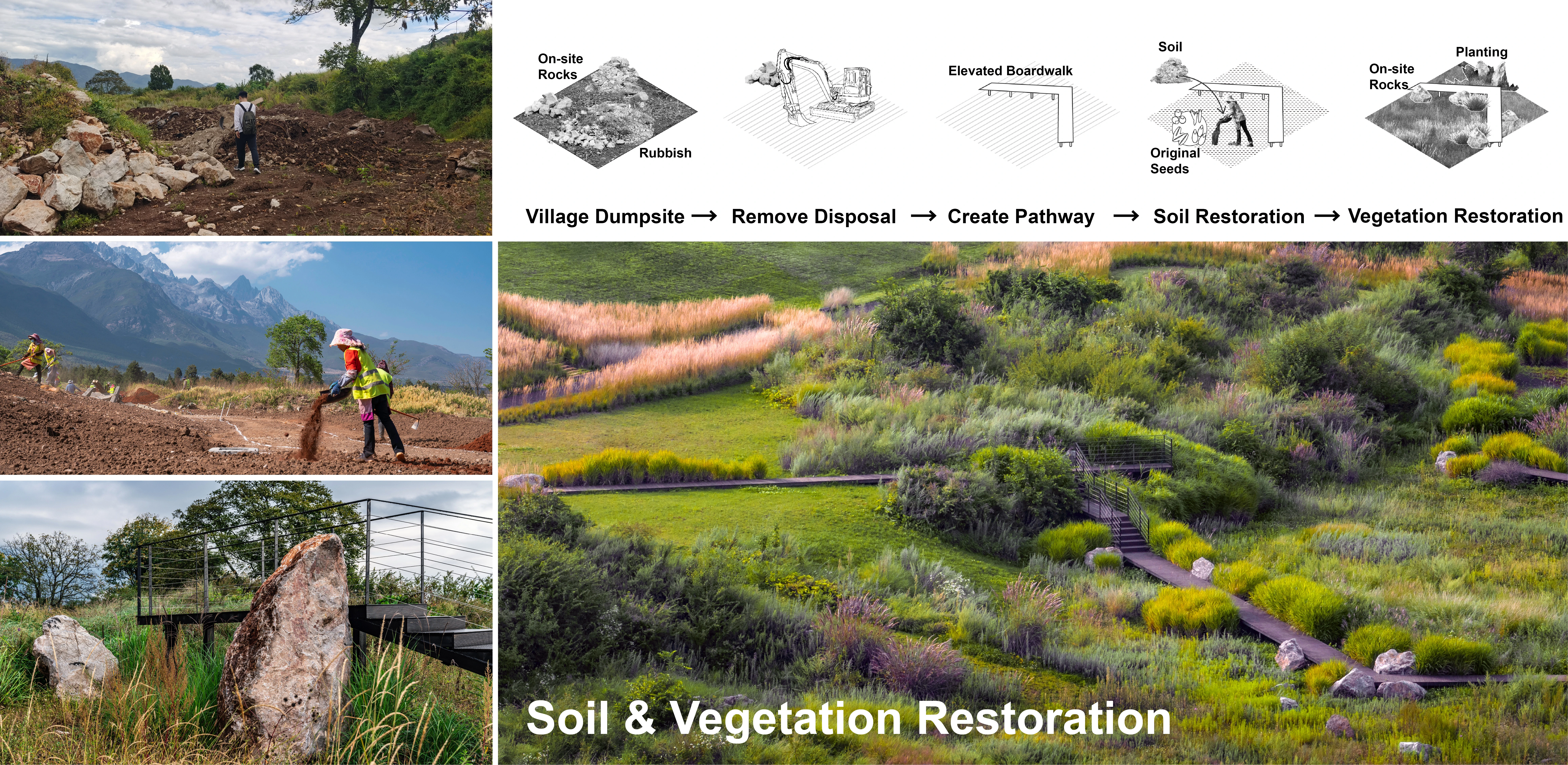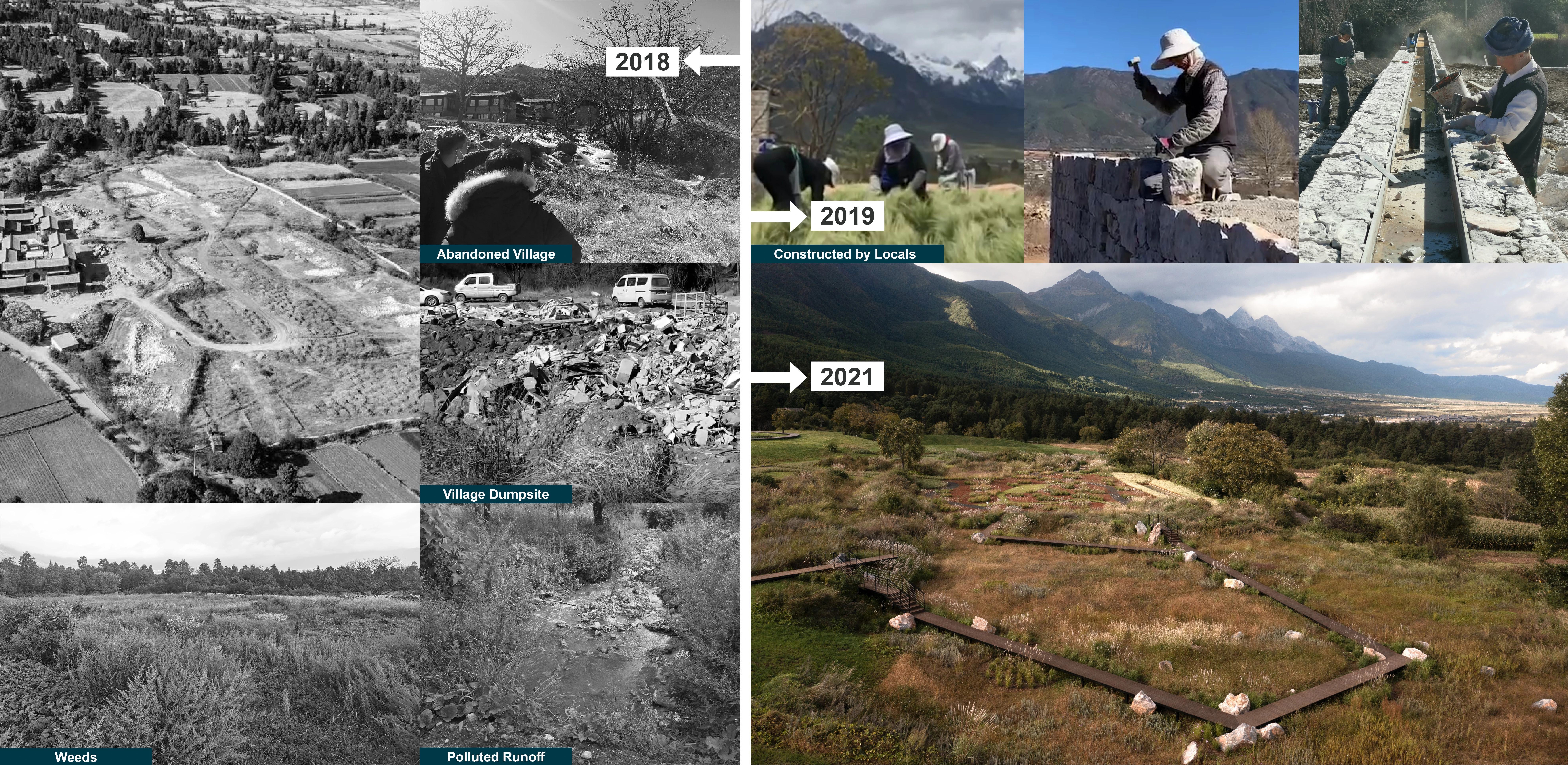 Situated on the ecological hillside of Yulong Snow Mountain in Lijiang, at an altitude of 2540m, the site has regrettably been abandoned as a village dumpsite over the past decade. Over time, habitat loss poses great threat to sensitive local species. During the Pan-Himalayan monsoon season, there is a risk that it may fail to capture and retain stormwater runoff, thereby leaving the low-lying Baisha historic town vulnerable to flooding.