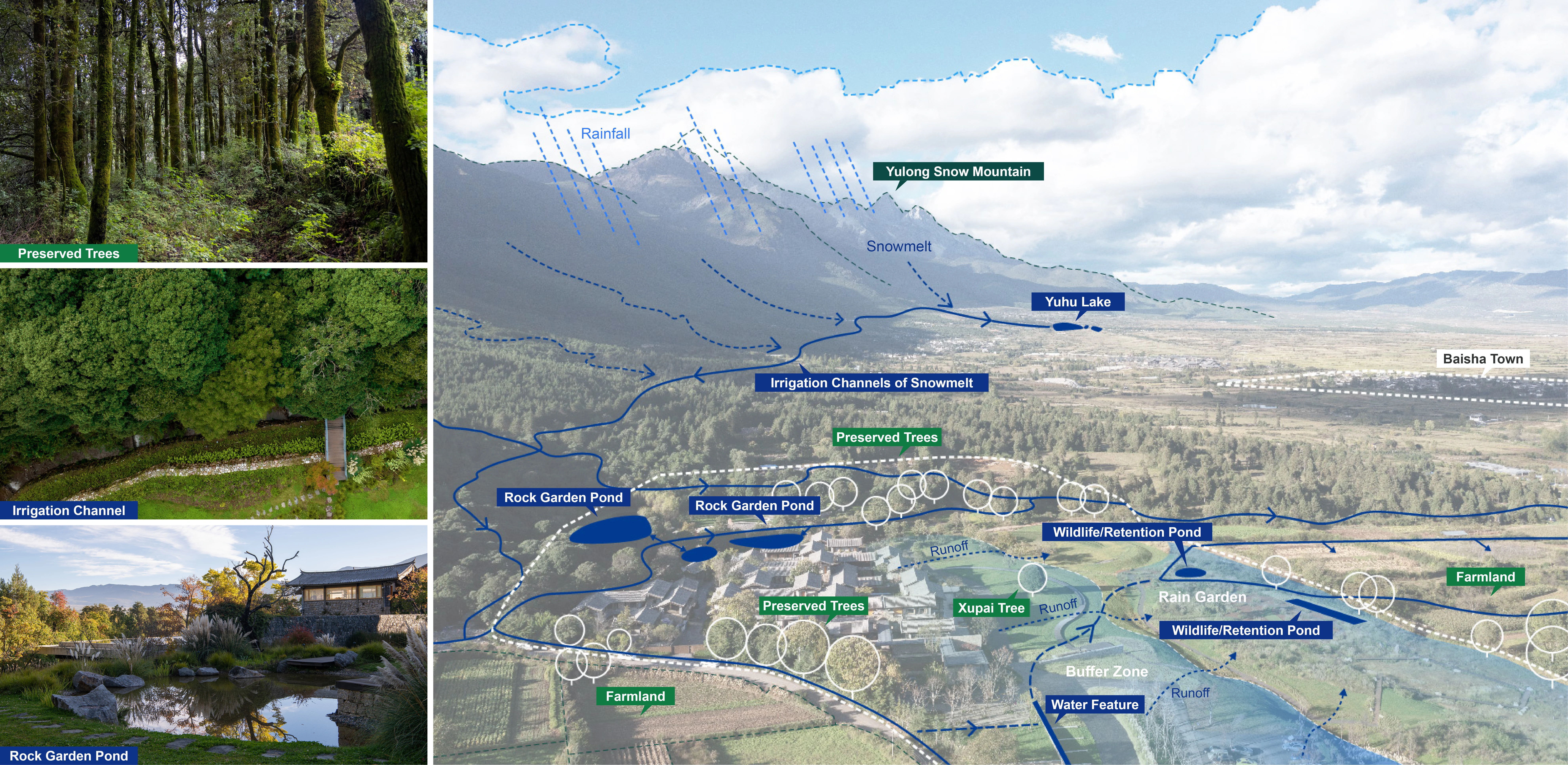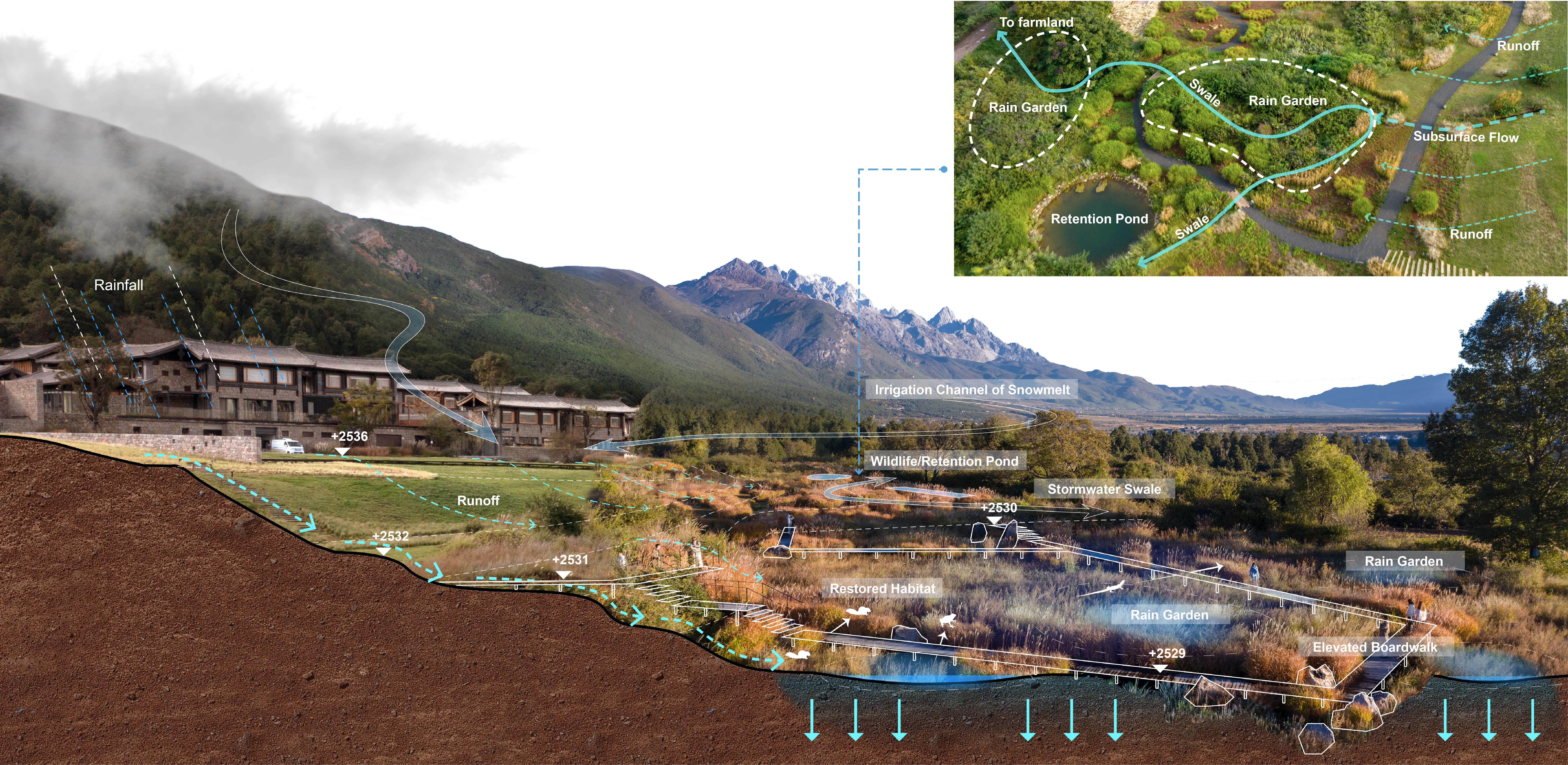 To fulfill up to 95% of the project’s water requirements, a rain garden system is implemented, reducing the risks of stormwater to the town. Stormwater swales also act as part of natural stream system to deliver snowmelt for agricultural water to Baisha historic town. The northern circular retention pond, known as the “Eye of Hylla” by locals, serves dual purposes as an irrigation source for the entire garden and a critical wildlife pond.