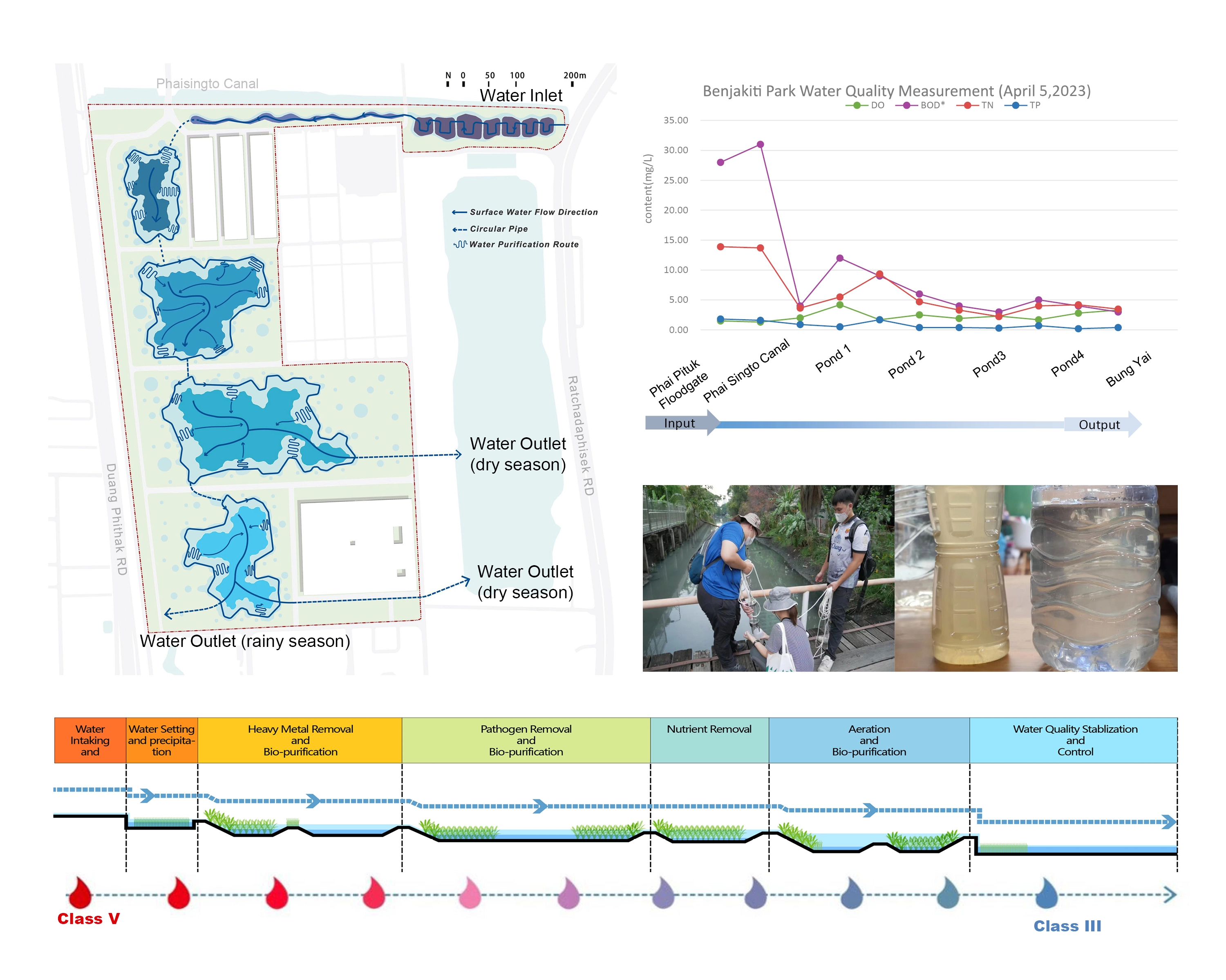 Bangkok is a densely populated city. The region experiences a monsoon climate with an average precipitation of about 1500 mm per year. The effects of global warming have resulted in increased flood risk due to Bangkok’s low elevation. The 102-acre site was formerly a tobacco factory. The budget was limited and was overseen by the army and did not have extensive experience or skills in building landscape projects.