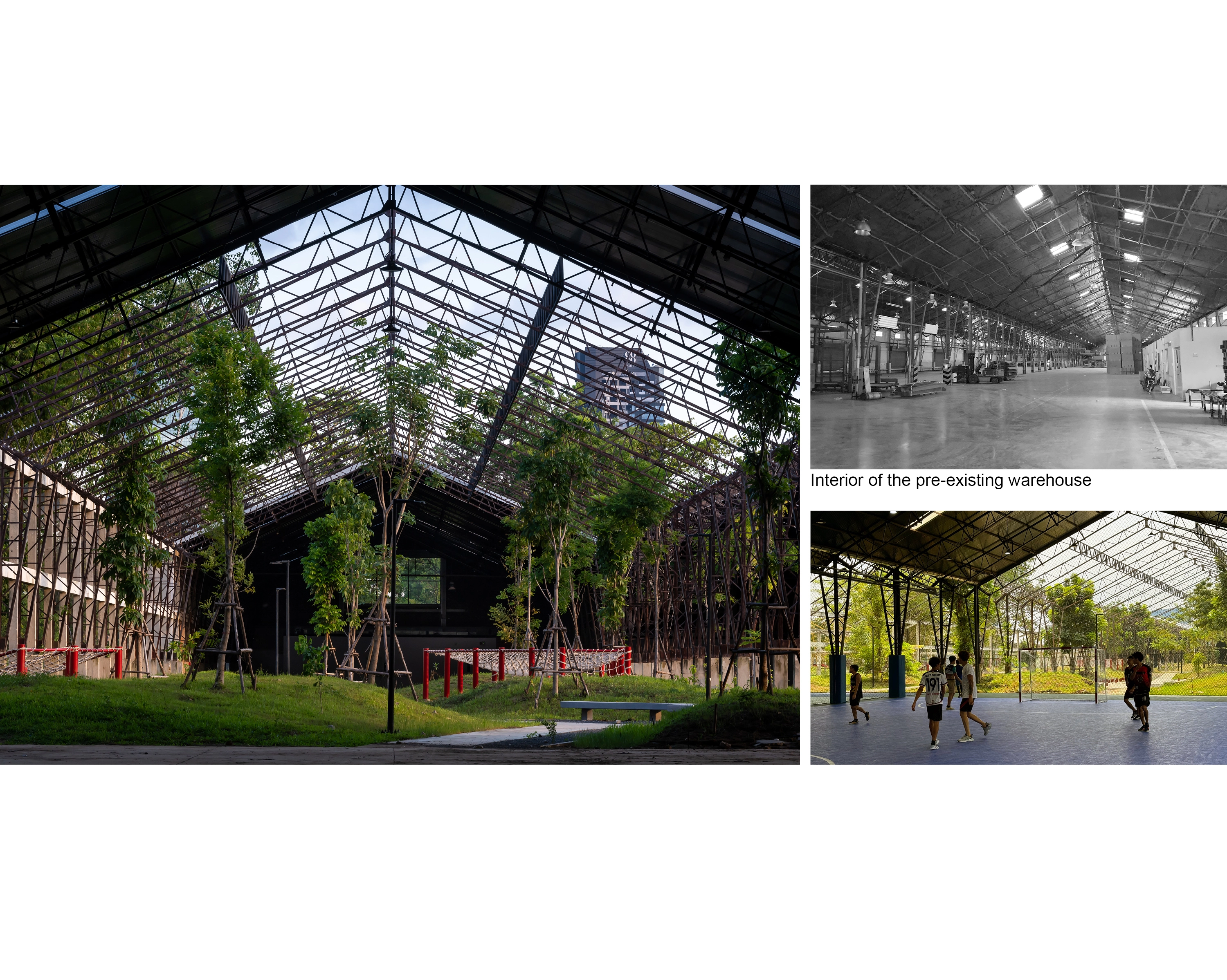 Reuse and recycle: All existing trees on site were preserved and integrated into the park design. Existing factory buildings were repurposed to house the sports center and museum. The demolished concrete materials were recycled for the earthwork foundation and paving.
