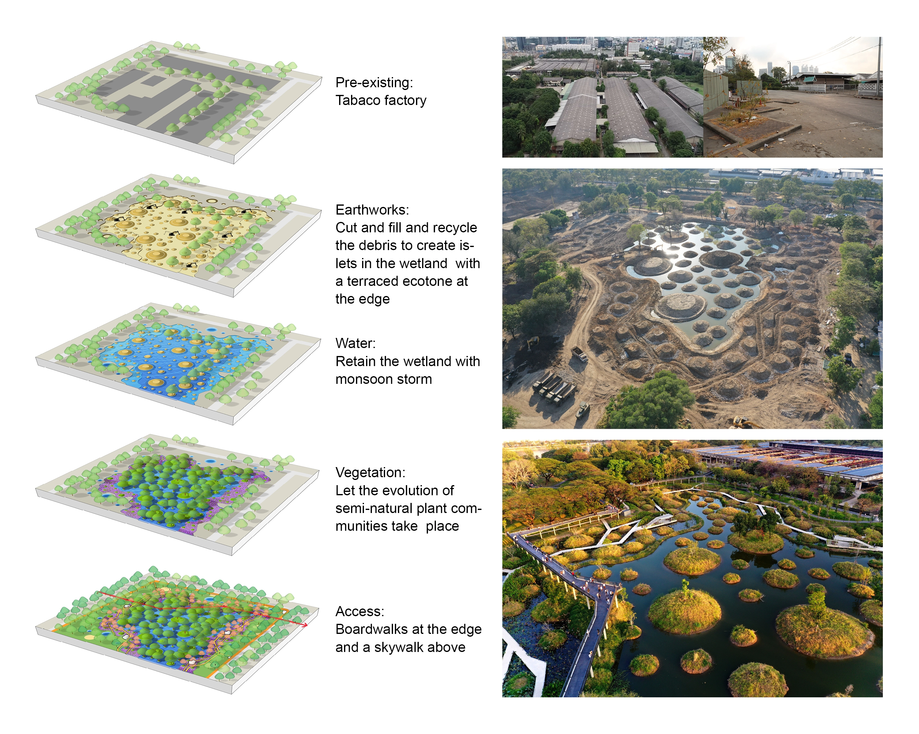 Creating porosity and wetlands: Cut-and-fill techniques were used to transform the impermeable, concrete-paved ground into a spongy and porous landscape of wetlands dotted with islets, which is expected to retain up to 200,000M3 of stormwater from the surrounding area during the monsoon season. This tilled landscape also transformed the otherwise hard clay surface soil into wet and spongy habitat, allowing a rich native plant community to establish itself with minimal irrigation or maintenance needed during the dry season. This modular landscape can be easily executed with a single excavator and minimizes dependence on skilled labor.