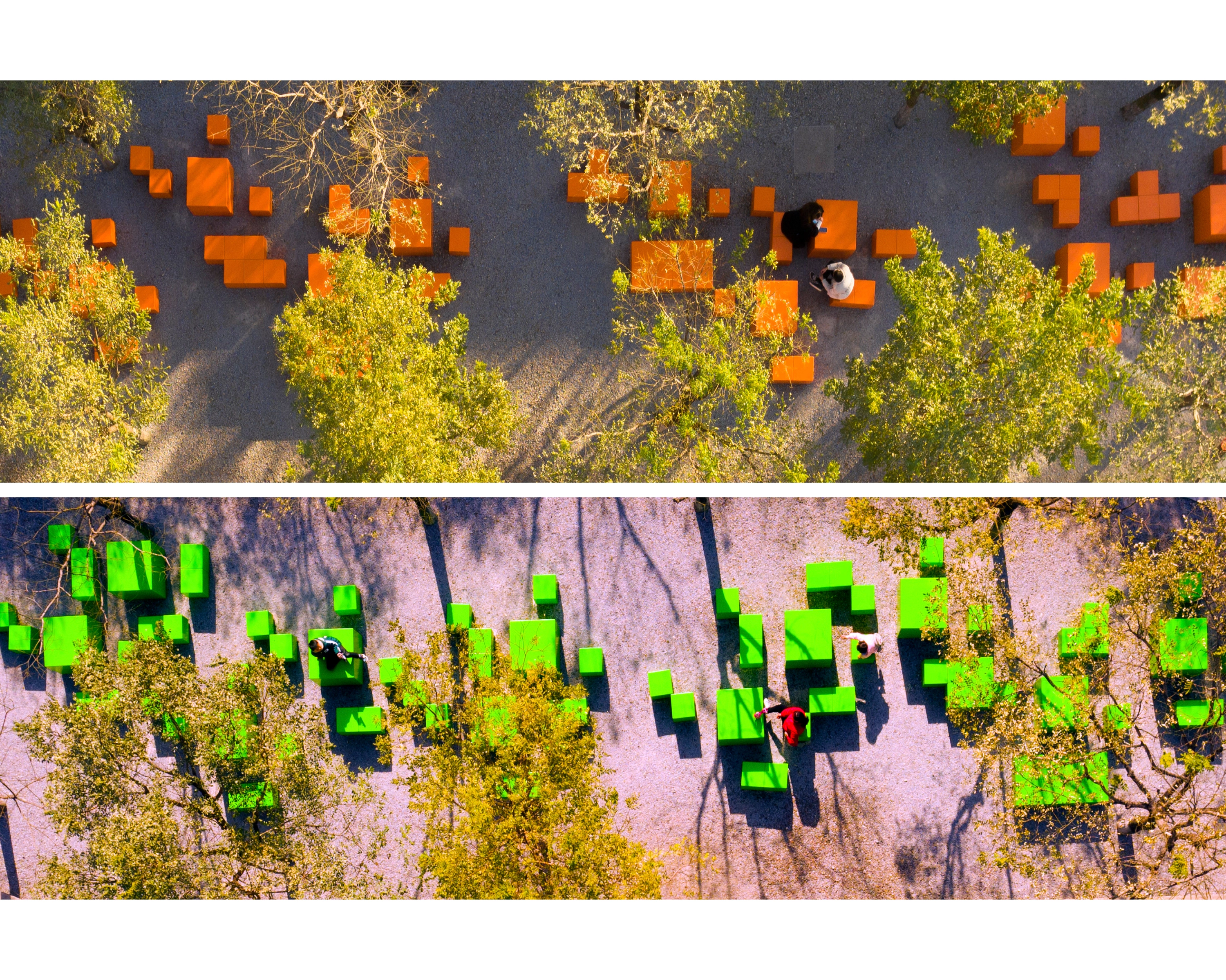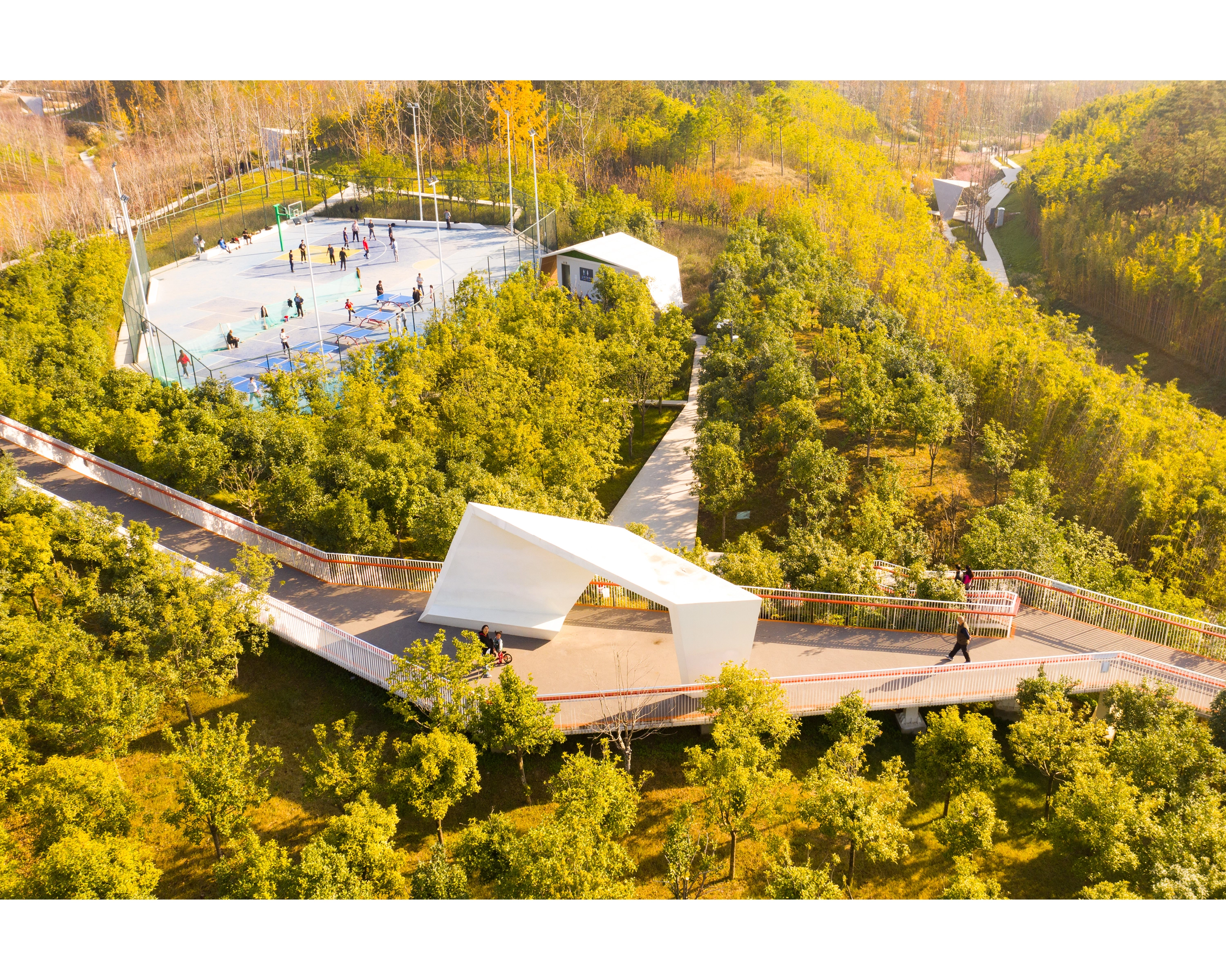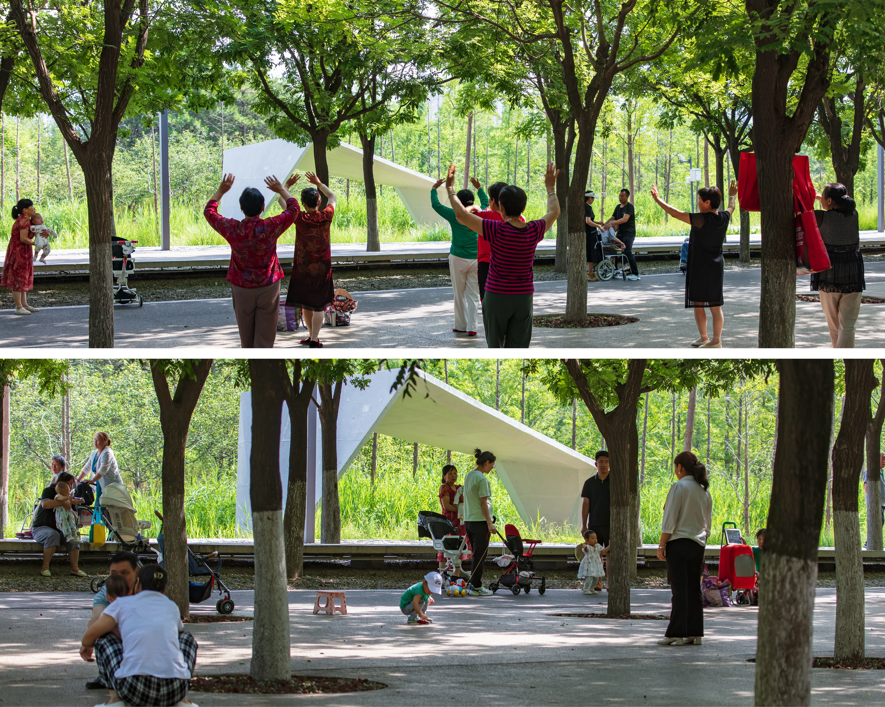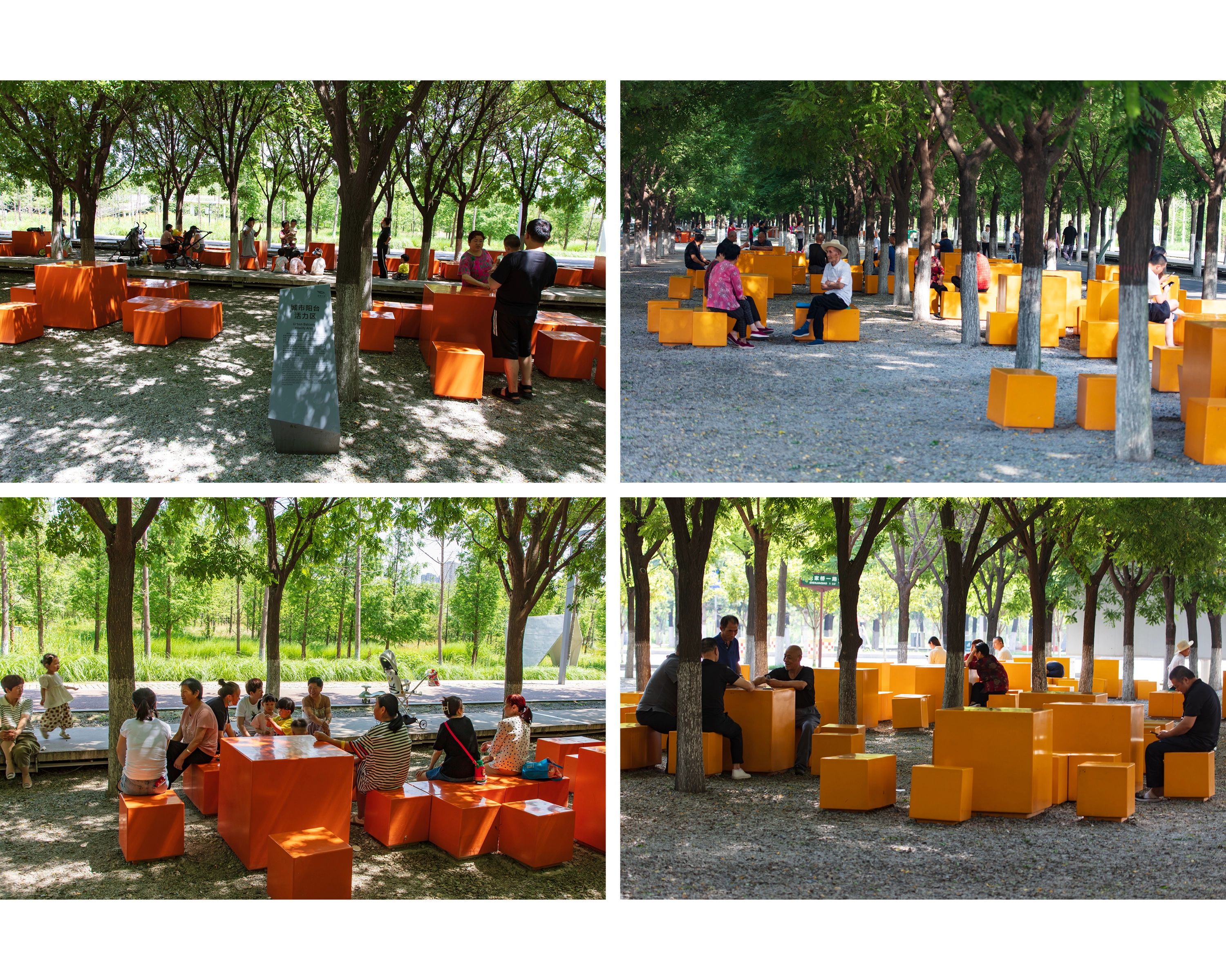 (1) Urban Balcony: A 50-meter-wide balcony stretches over 1500 meters along the western edge, featuring permeable gravel and 20,000 Poga Trees for shade. Amenities include pavilions, playgrounds, and modular, colorful fiberglass seating, encouraging diverse community activities. The balcony serves as a communal living room, hosting a variety of activities from Tai Chi to evening social gatherings.