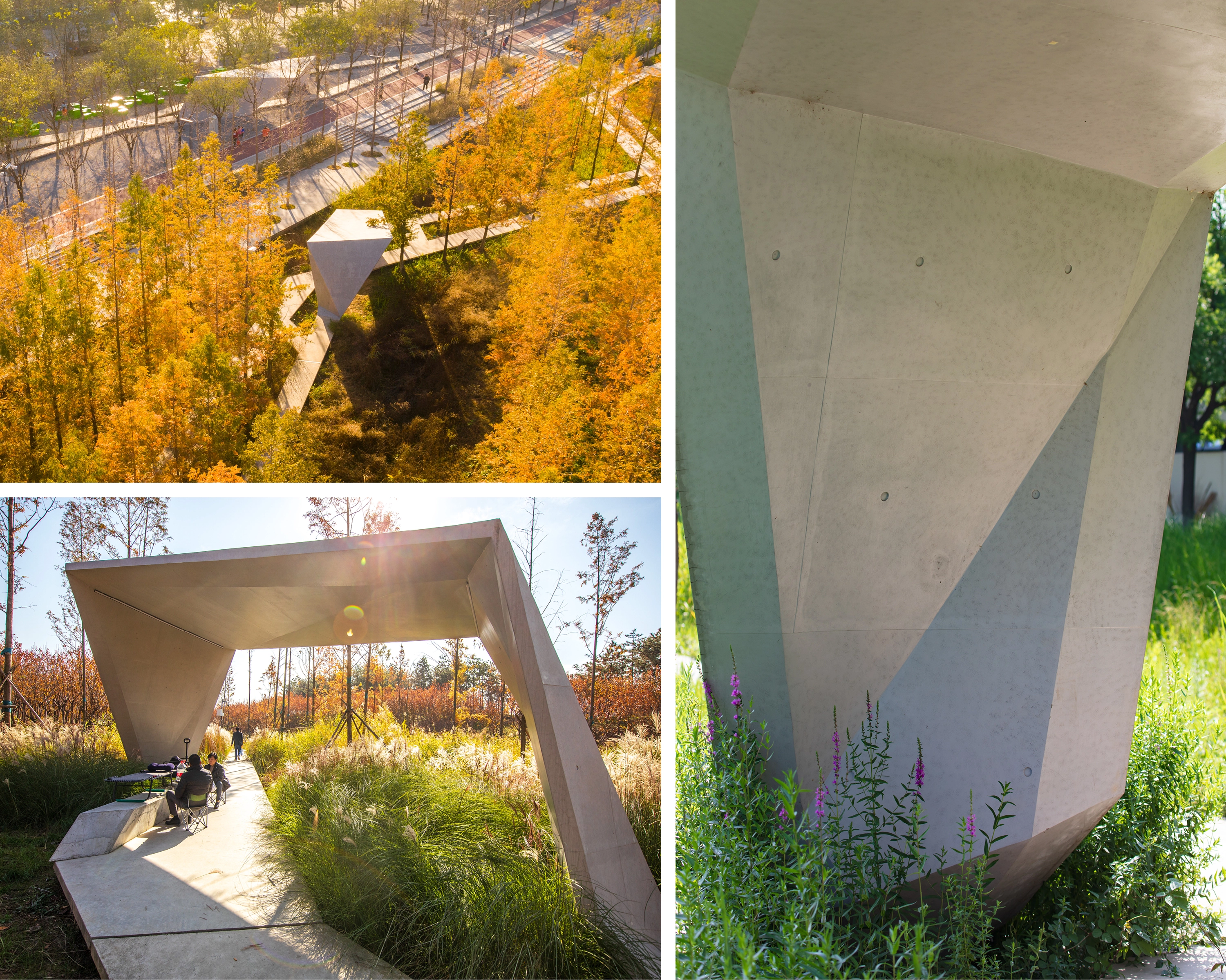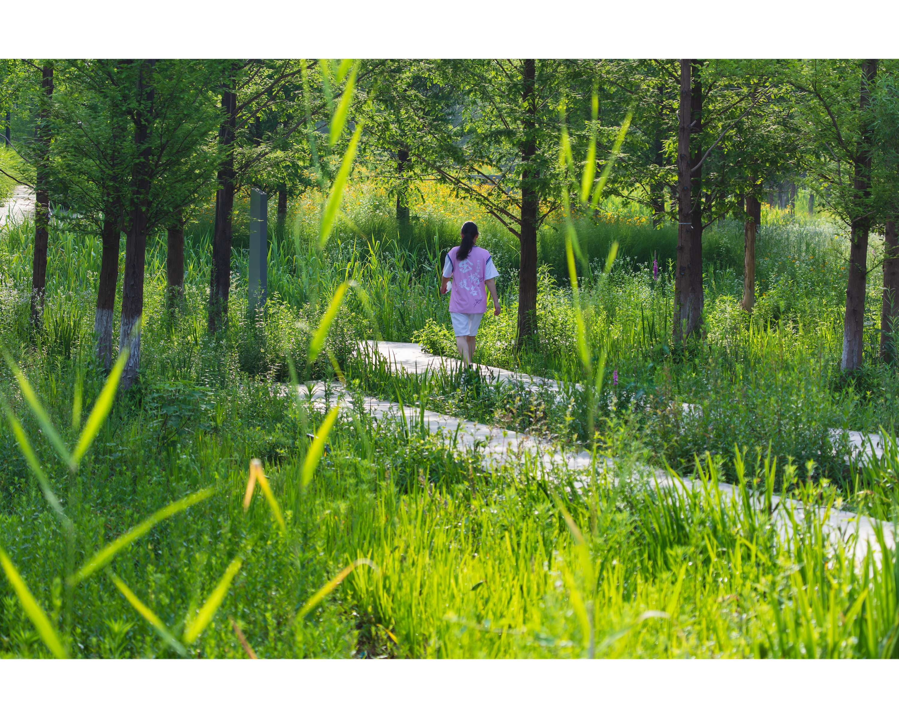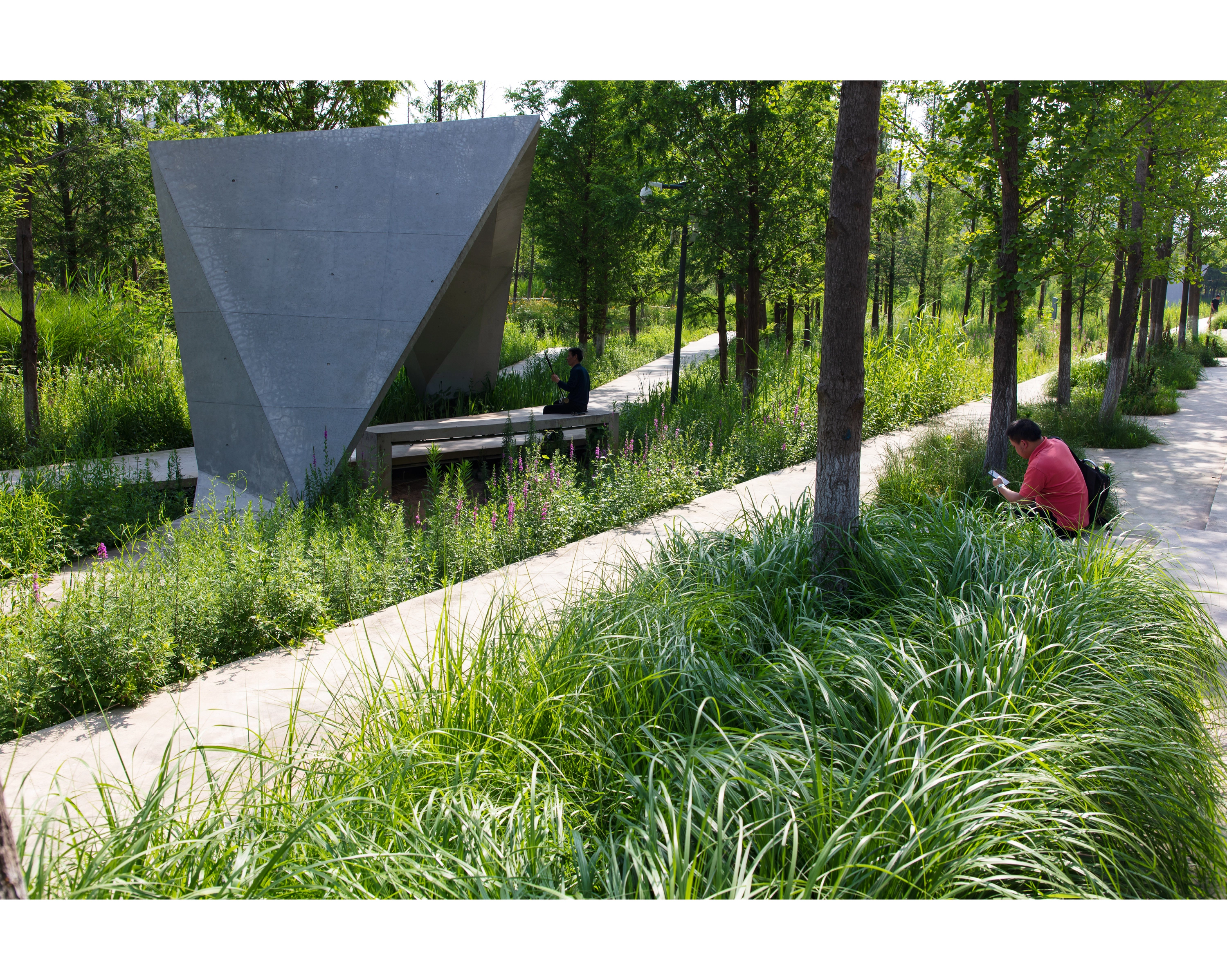 (4) Path Network: An intricate path network, raised above ground and weaving through tall grass, offers a nature-immersive experience. The paths, made of prefabricated concrete slates, are designed for efficient installation and aesthetic variation.