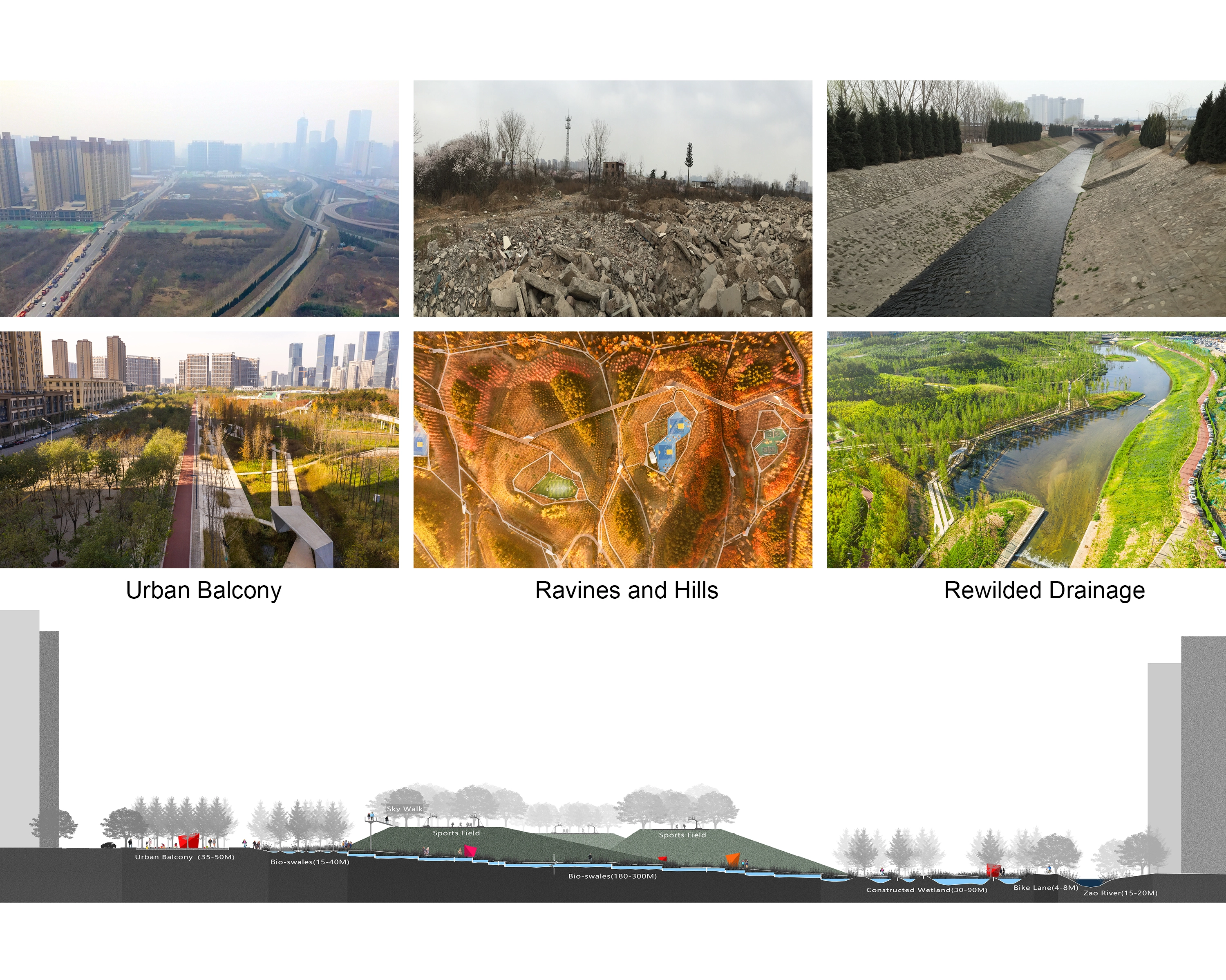 (2) Ravines and Hills: Utilizing existing debris, the design includes ravines for stormwater channels and hills for sports facilities. A bioswale system alongside the Urban Balcony collects and filters stormwater runoff, leading it to the rewilded drainage. The ravines, enriched by summer stormwater, foster a lush, diverse plant community, guiding visitors from the bustling balcony to the tranquil natural interior and the rewilded waterfront.