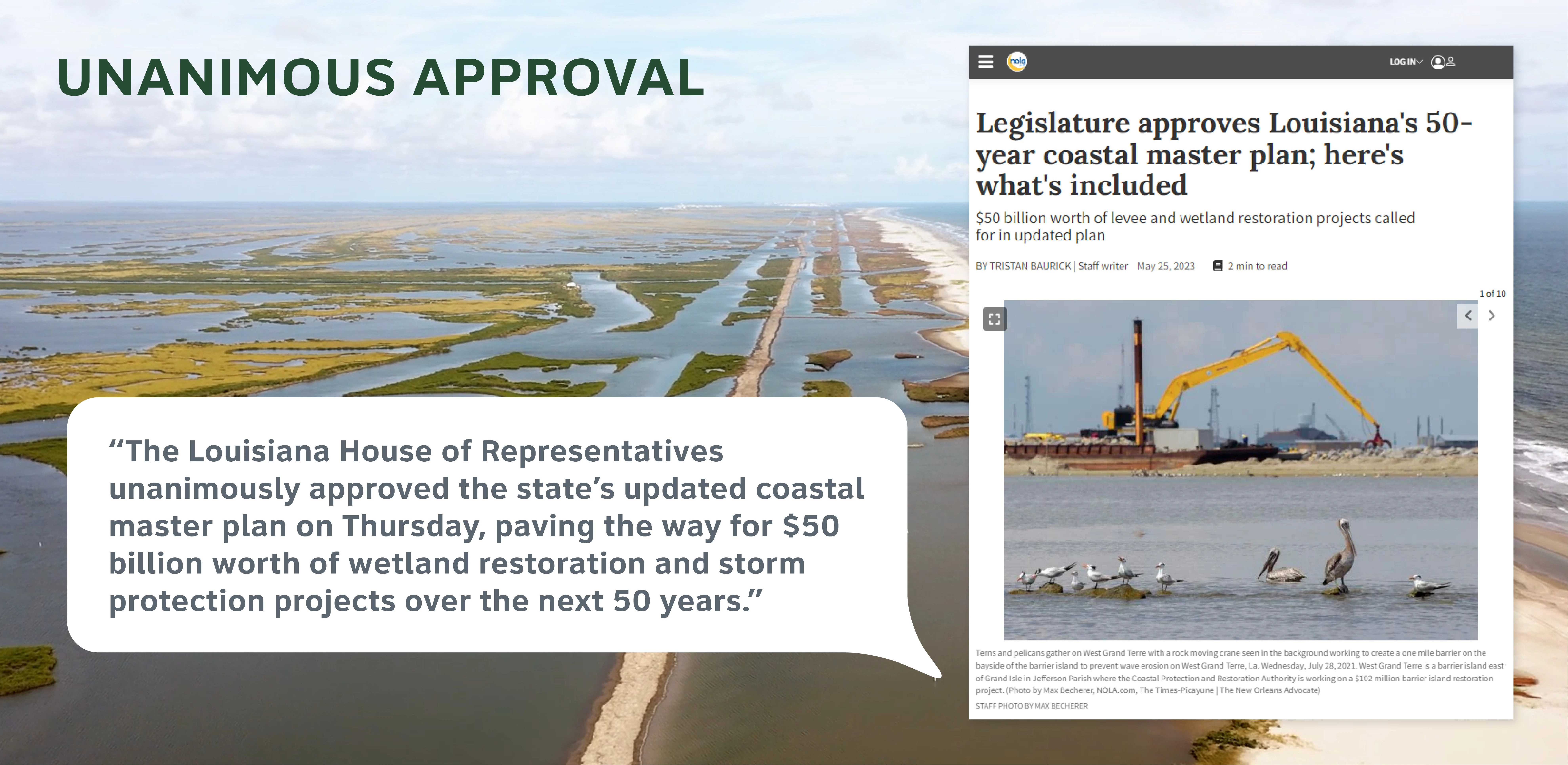 The plan was unanimously approved by both the Coastal Protection and Restoration Authority and the Louisiana Legislature in Spring of 2023, and is a key tool in organizing collective action and funding centered on protecting and restoring the coast.