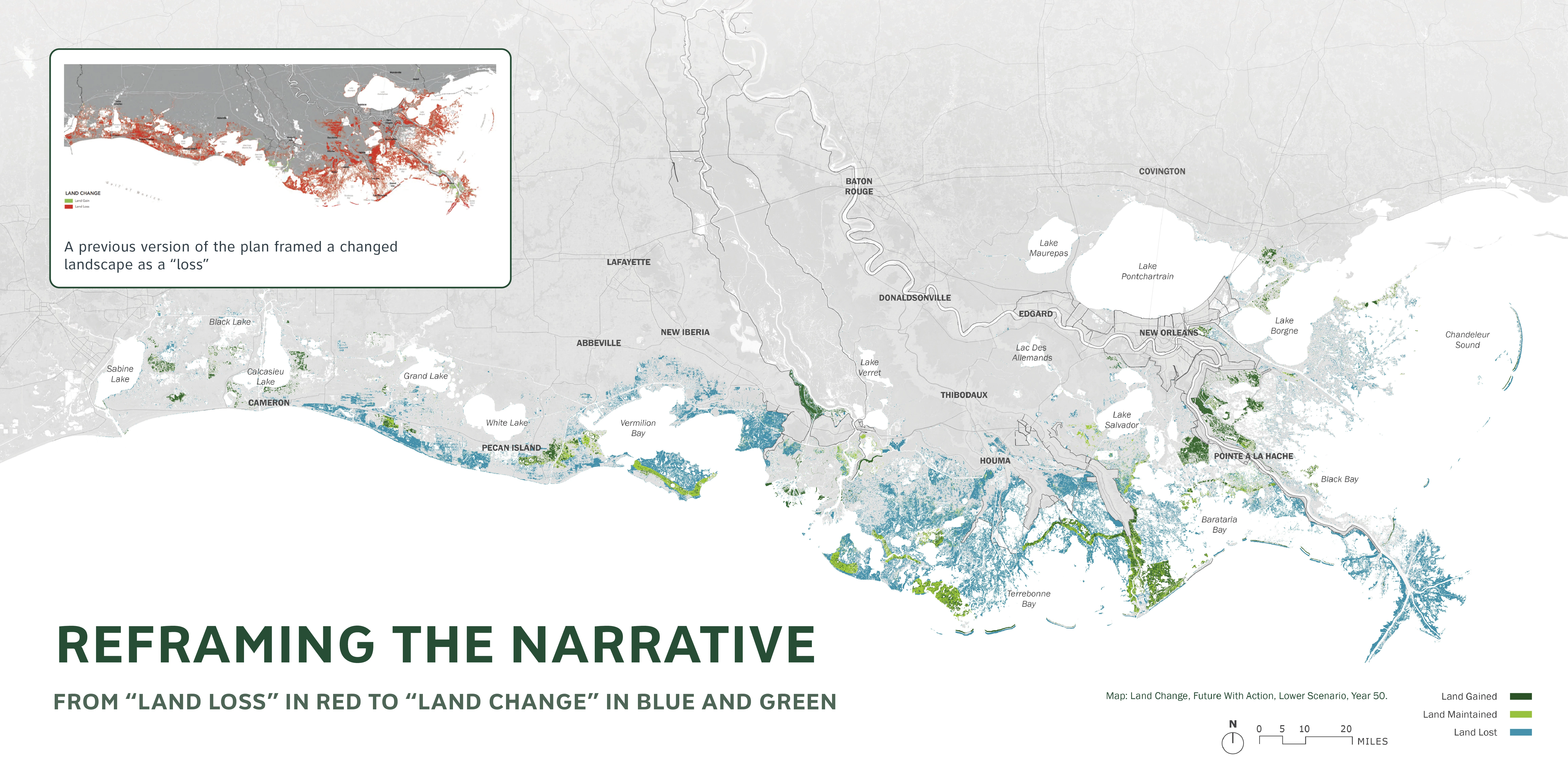 A major shift in the plan was reframing the communication of a changed landscape. In previous iterations of the plan, land loss was shown on maps in red. The landscape architects reframed this to show land change in blue and green. This shift in visualization communicates that change is inevitable, but communities are able to adapt.