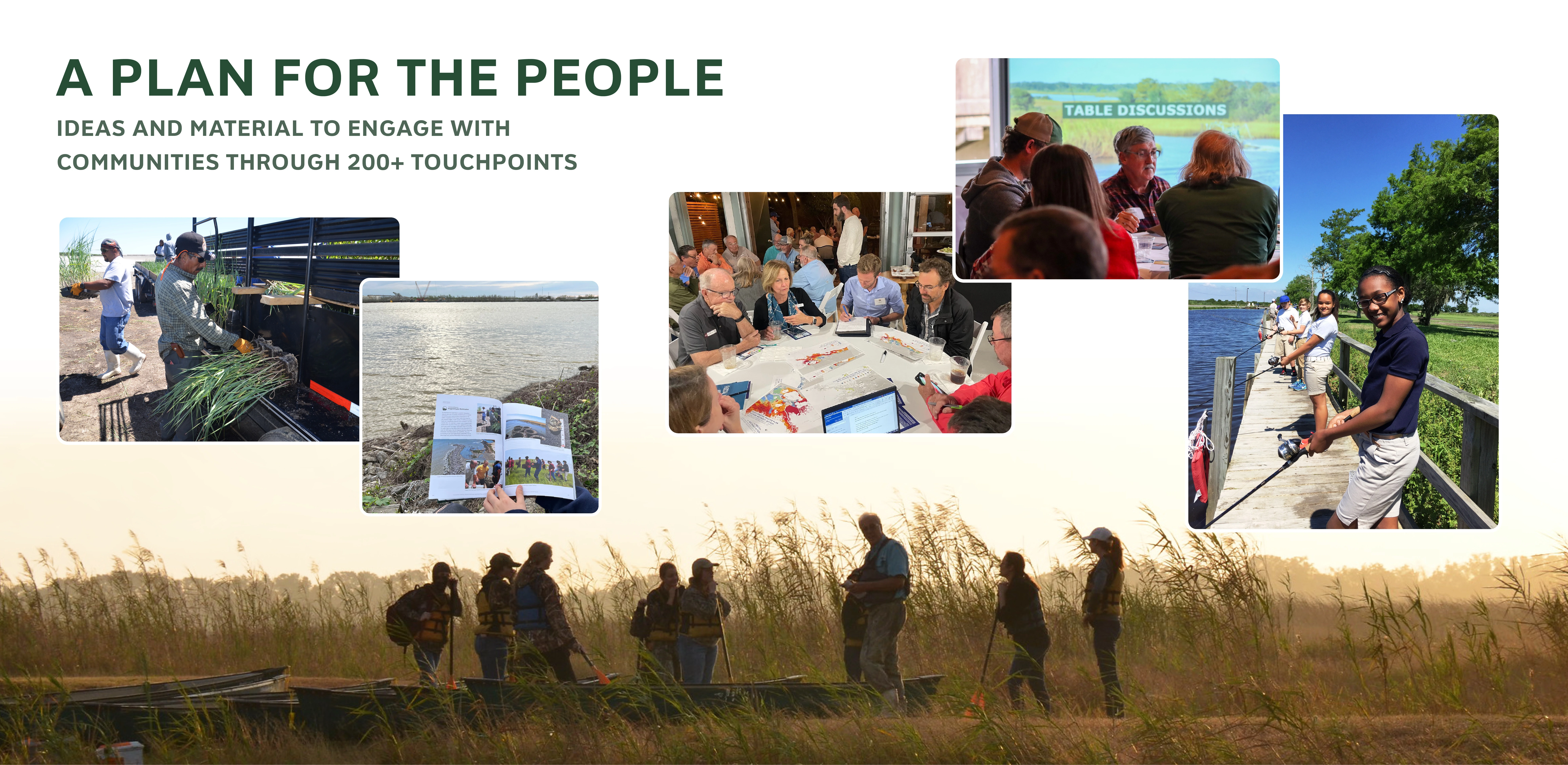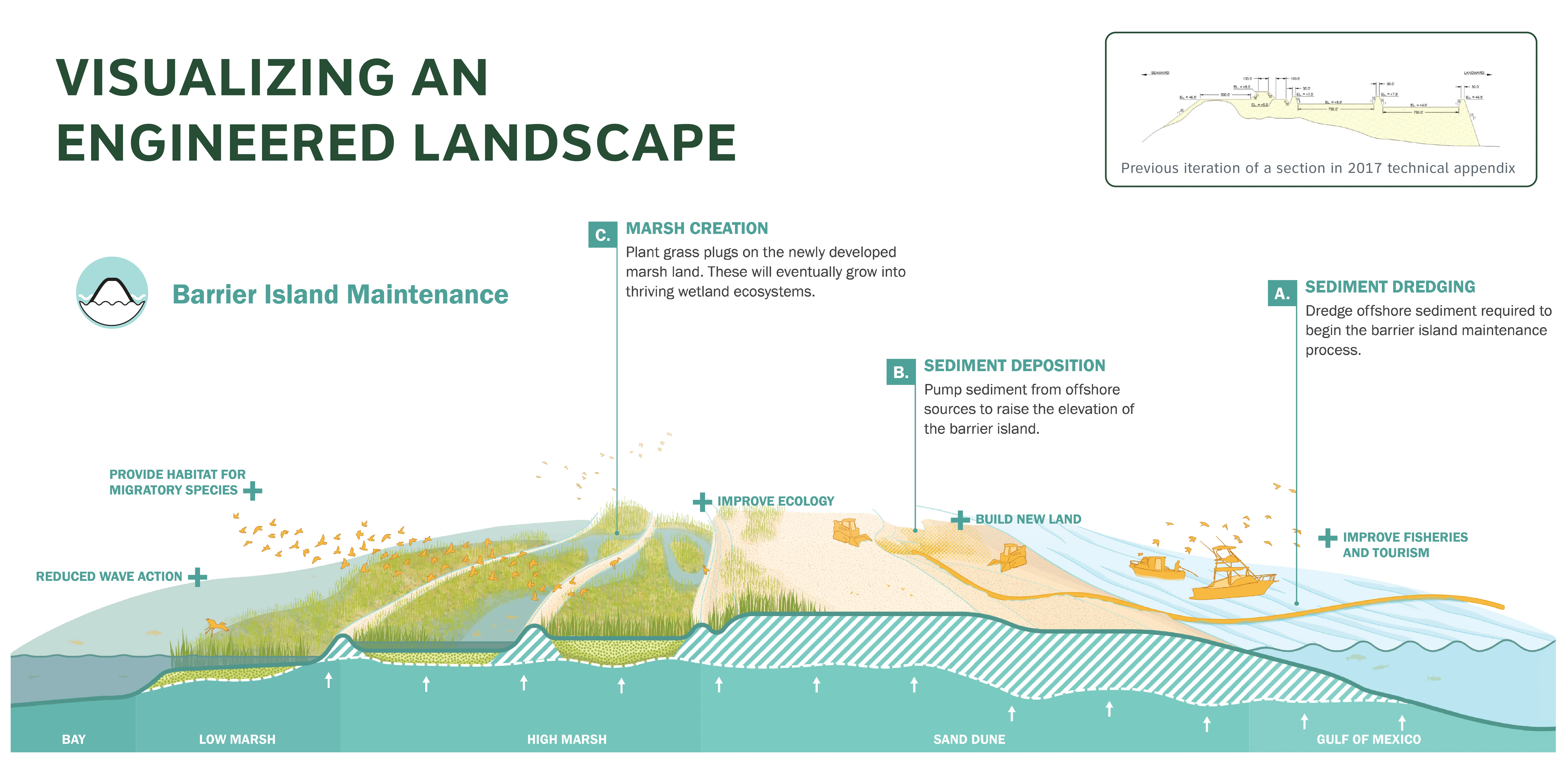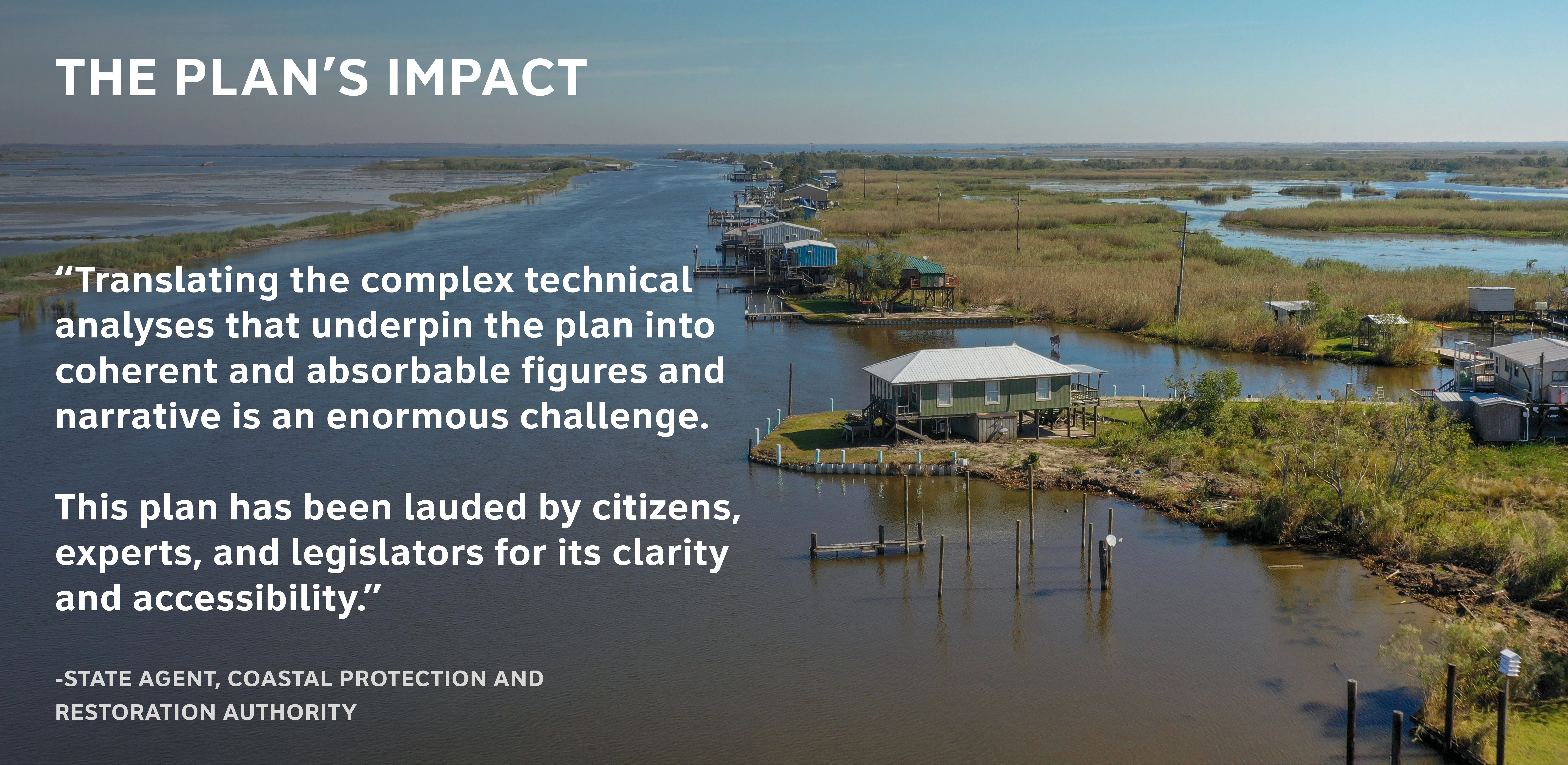 Landscape architects led the document’s visual communications strategy: reframing the overall plan’s graphic identity, improving project and data visualizations, enhancing reading comprehension, and refocusing on a community-centric narrative structure. The plan demystifies the processes behind coastal risk reduction and restoration projects and communicates the value of the landscape and the livelihoods tied to it.