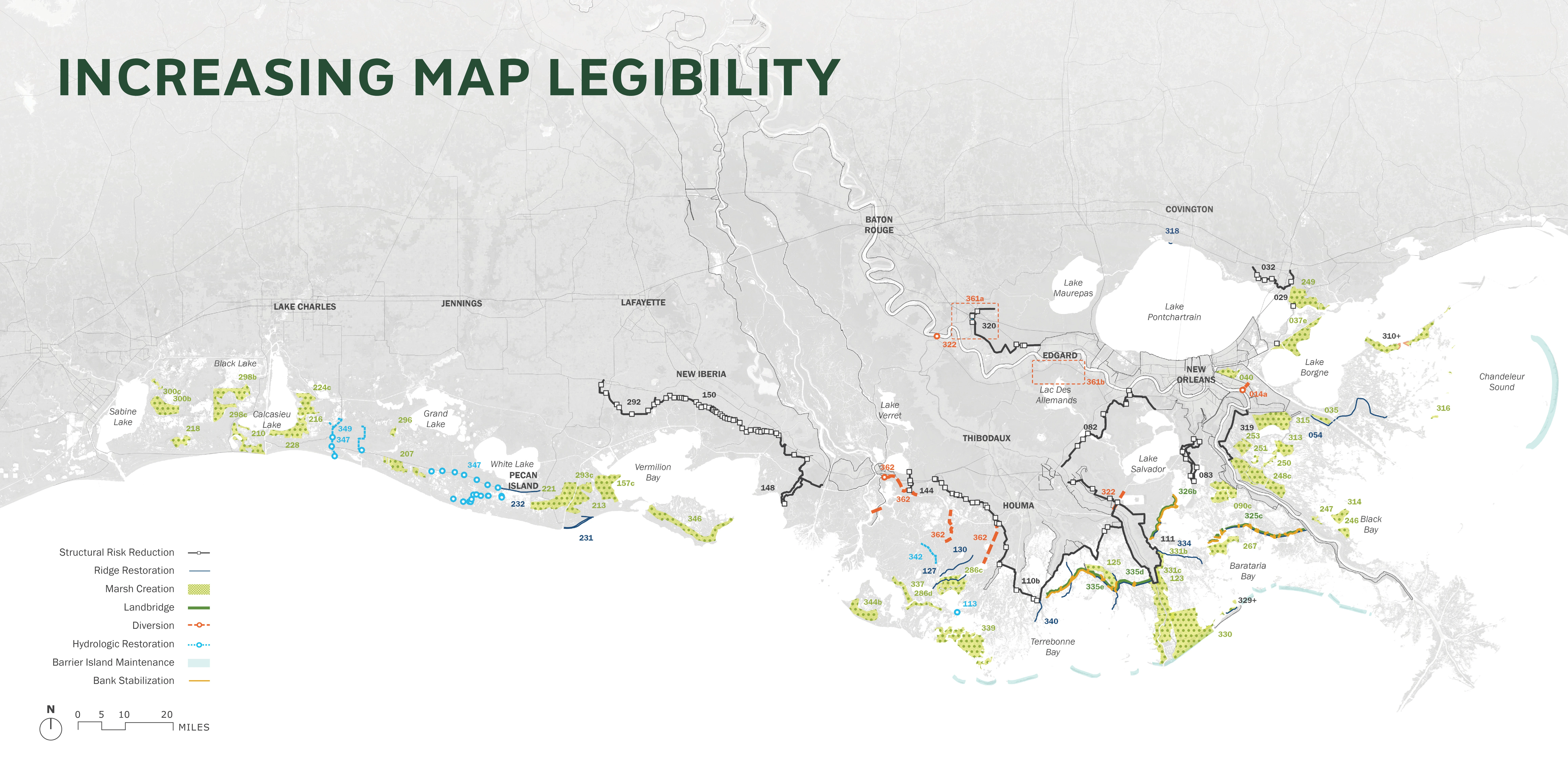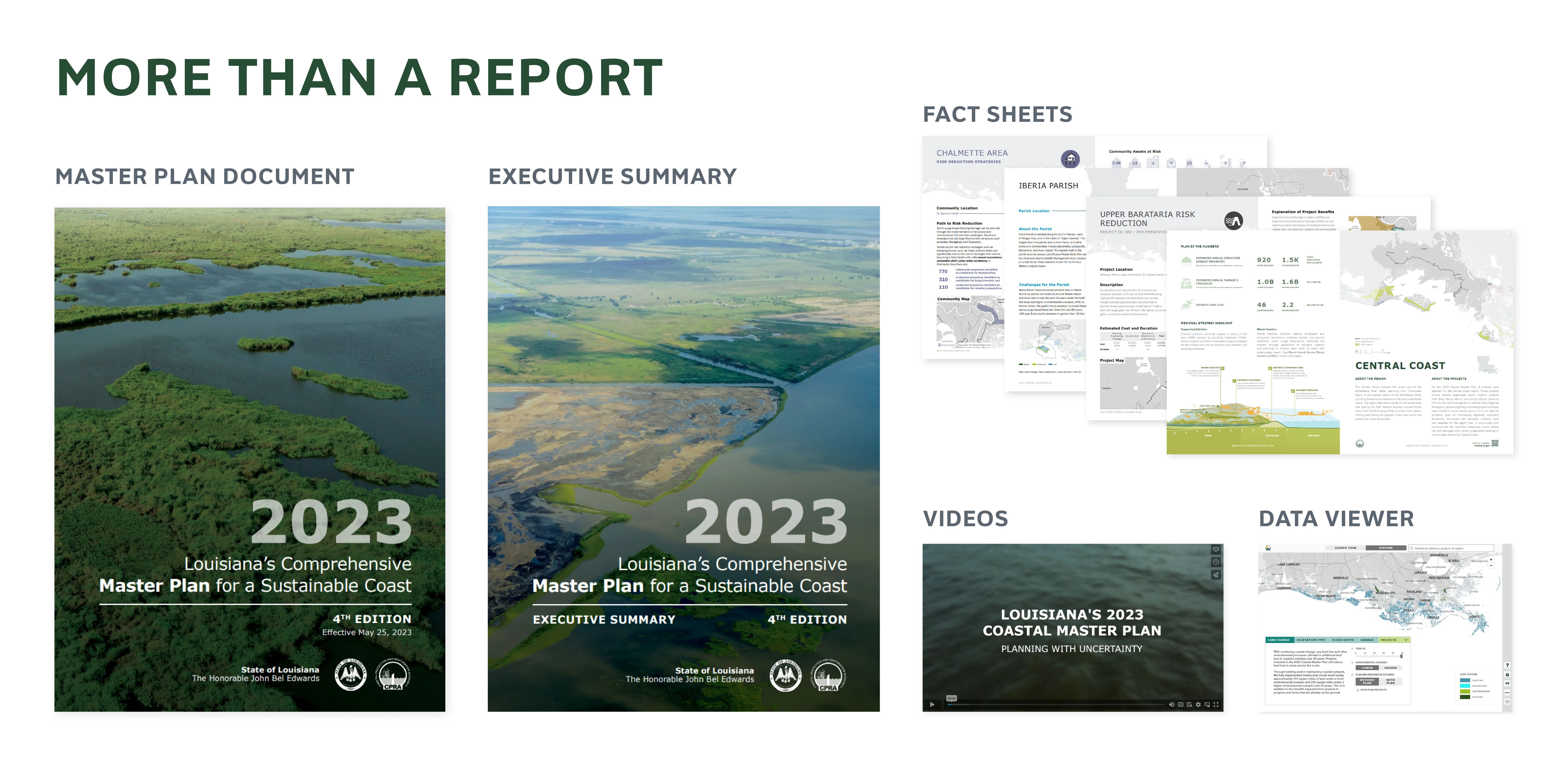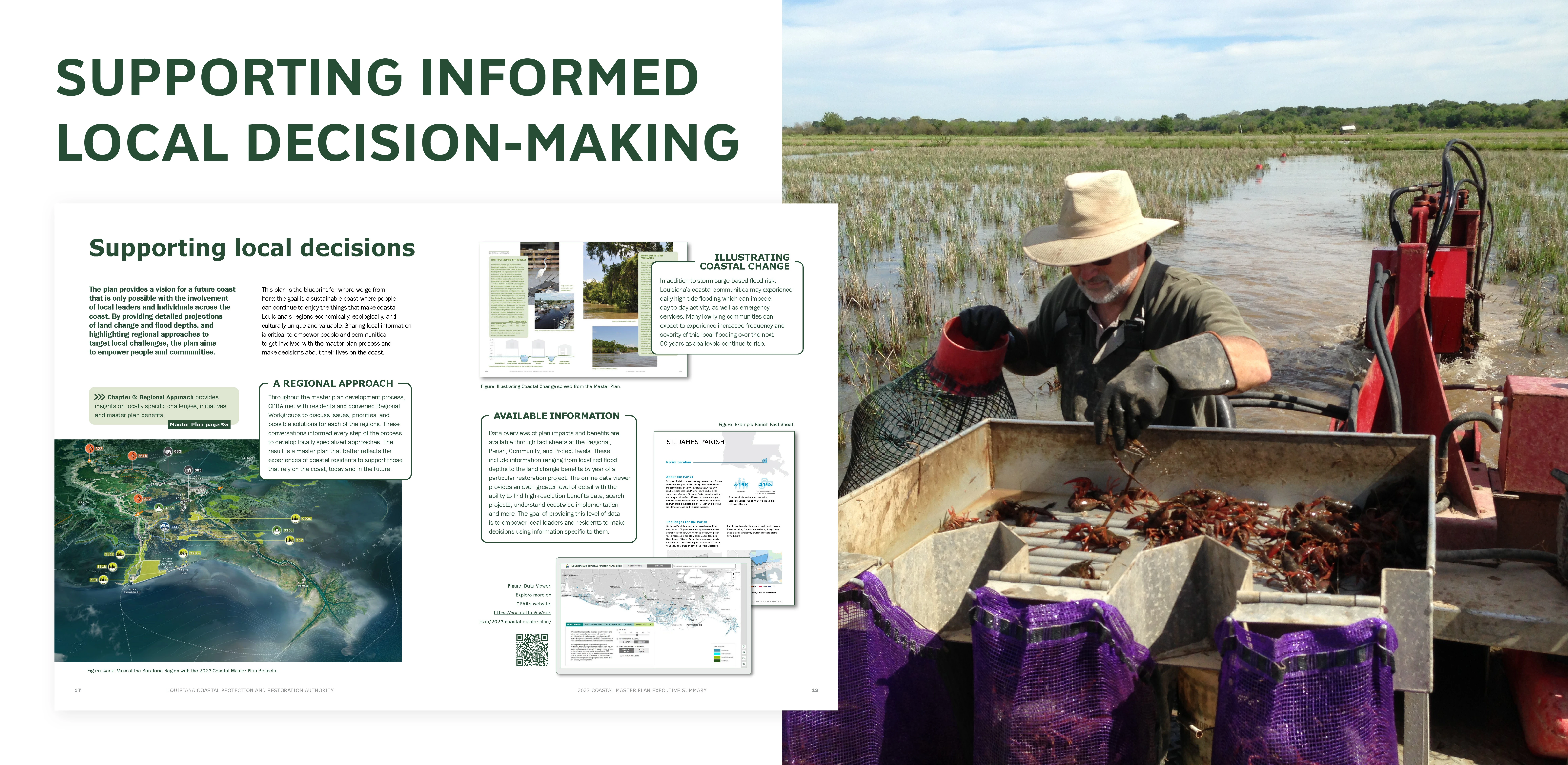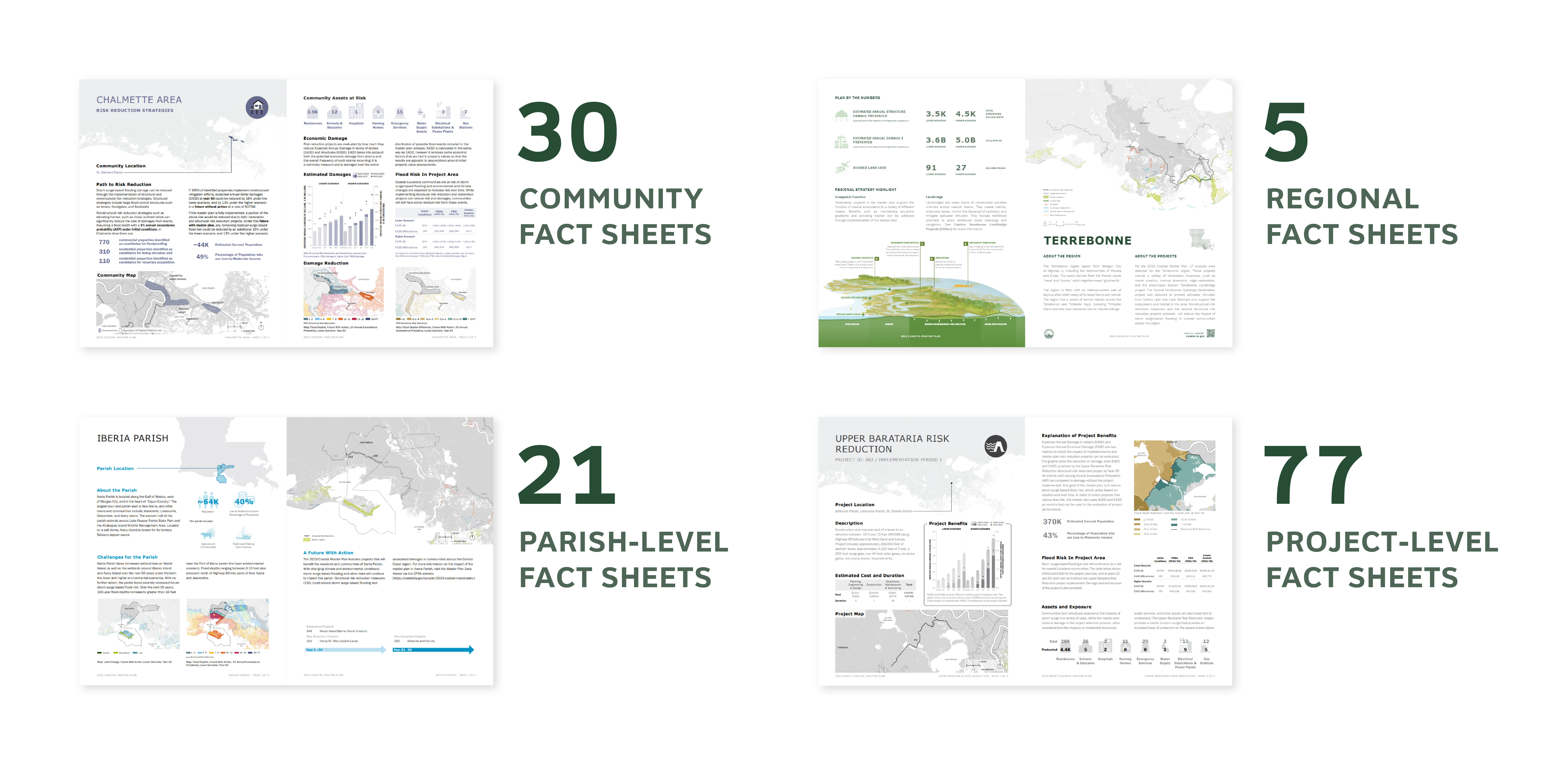 For the 2023 Coastal Master Plan, the landscape architects led an overarching visual communications strategy and graphic identity underpinning the document, as well as collateral for outreach and engagement—including model output maps, aerial regional views, explanatory diagrams, data visualizations, and fact sheets for each project, parish, community, and region. The broader goals of this three-year collaboration included enhancing the plan’s visual accessibility, comprehension, and weaving regional and local identity into the overall narrative.