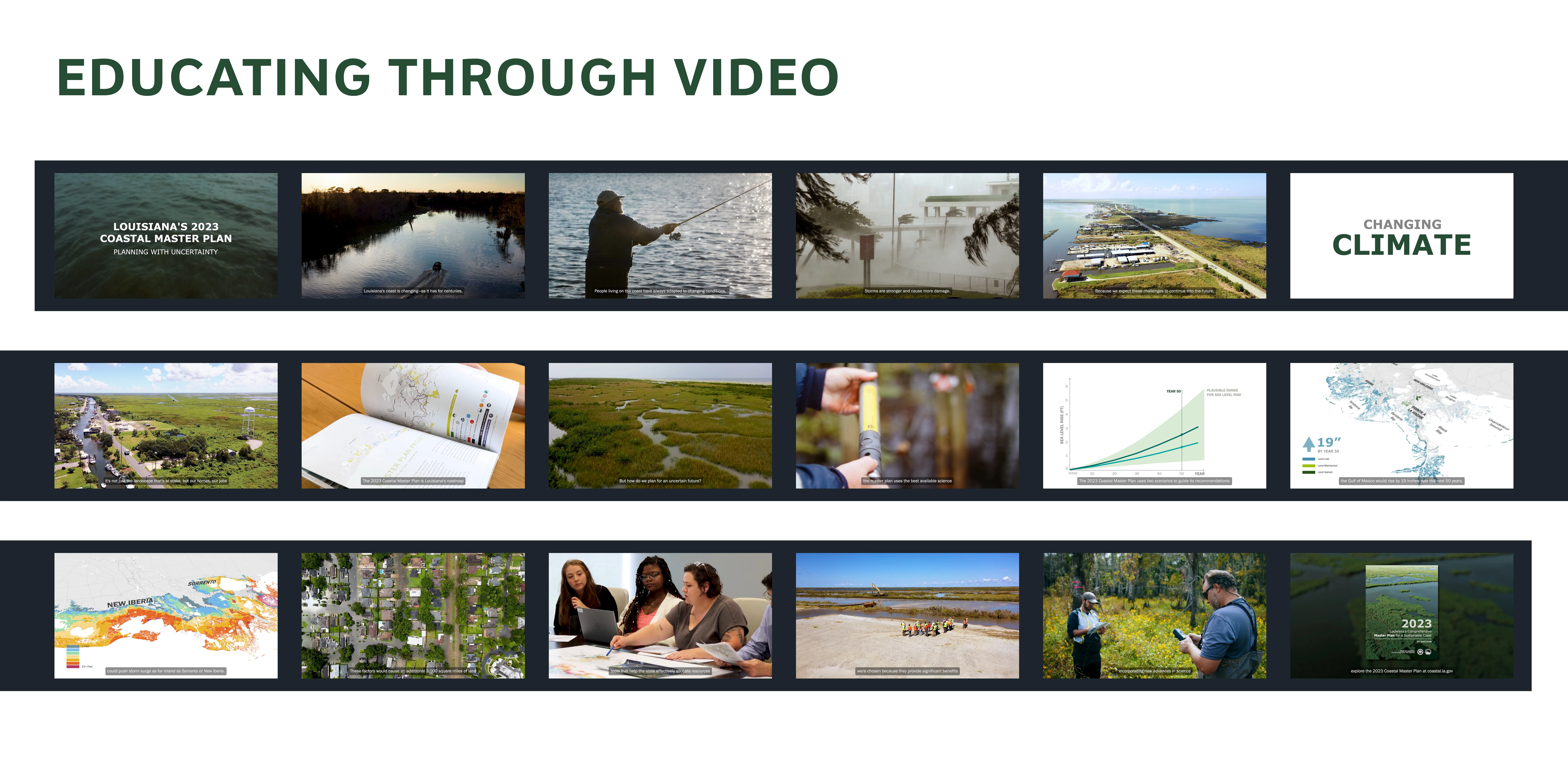 The fact sheets consist of data overviews of plan impacts and benefits at the Regional, Parish, Community, and Project levels. The online data viewer provides an even greater level of detail with the ability to find high-resolution benefits data, search projects, understand coastwide implementation, and more. The data viewer addresses two distinct types of users: first-time users can view an overview of the available information, while return users can explore multiple data sets to better fit their needs. The videos explain how the plan can help residents prepare for a changing landscape, what it means to plan with uncertainty, and how each project type is best utilized in the landscape.