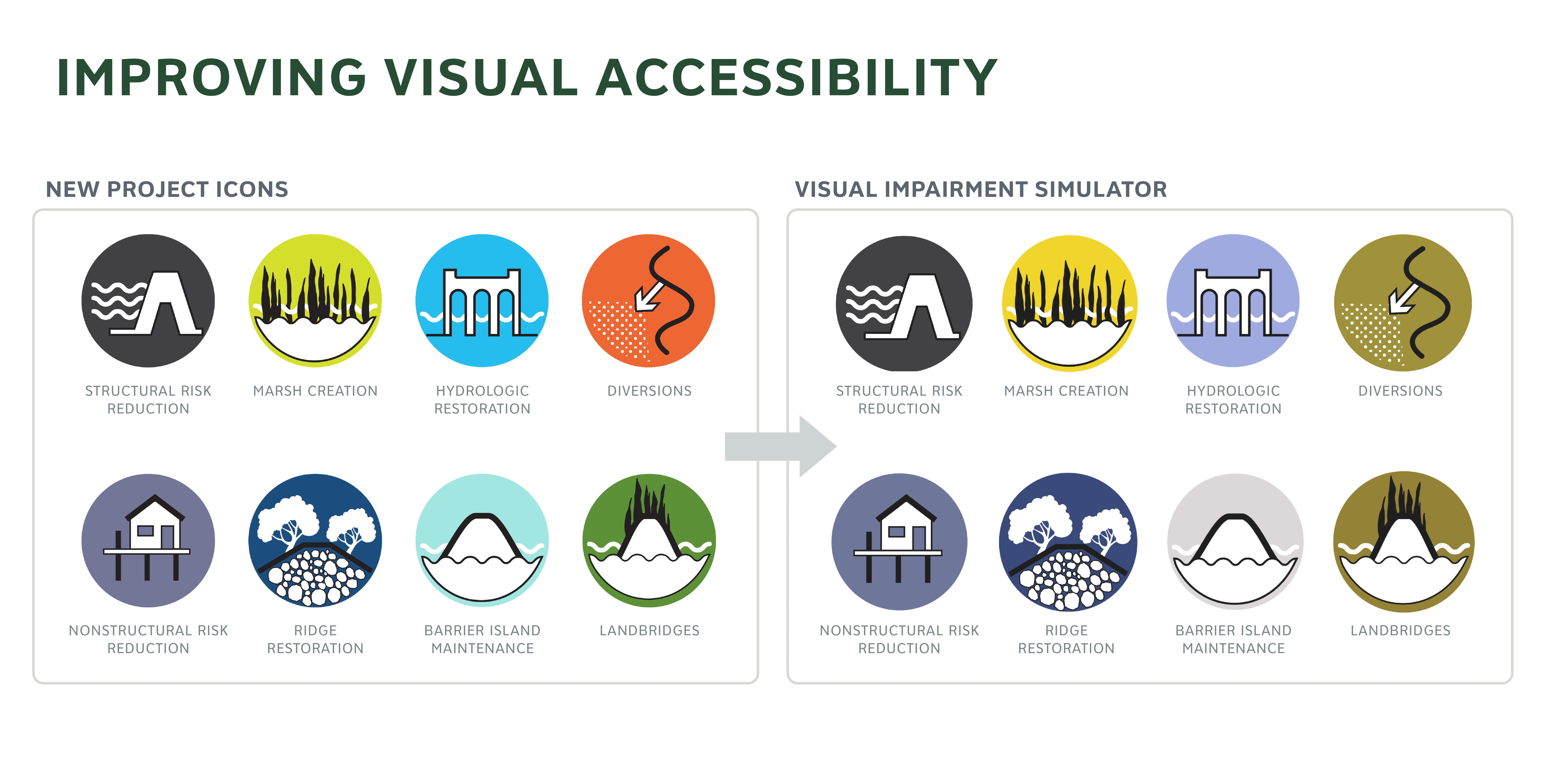 The team also redesigned icons to make them accessible to people with visual impairments, and updated engineering diagrams to visualize the potential of the landscape. Lived experience grounds the document, making clear how the everyday Louisianan can adapt for the future.