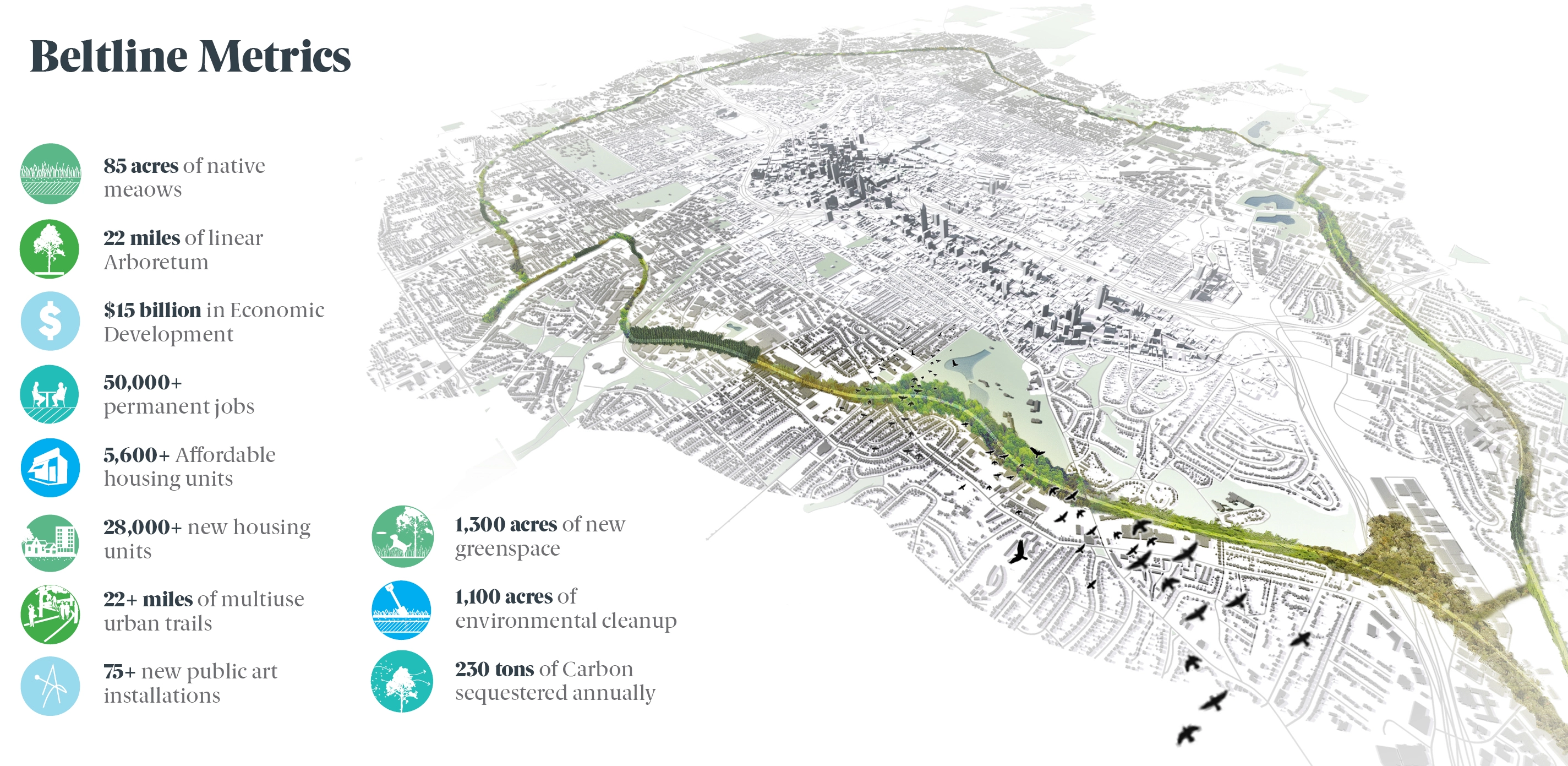 Fifteen years into the project, approximately $800 million in public investment has led to more than $8.2 billion in private investment.  2,977 of the planned 5,600 affordable workforce housing units along the corridor have been constructed to date.  Constructed trail segments have set a new benchmark for public realm design and execution in Atlanta, inviting new and existing businesses to orient their storefronts to the activated greenways. the BeltLine has catalyzed an altogether different type of development for Atlanta: dense, urban, pedestrian-focused, socially cohesive environments. Scheduled for completion in 2030, the project will continue to evolve a civic and cultural space that is at once deeply rooted in the city’s history, deeply committed to its future well-being, and unlike any other Atlanta experience.