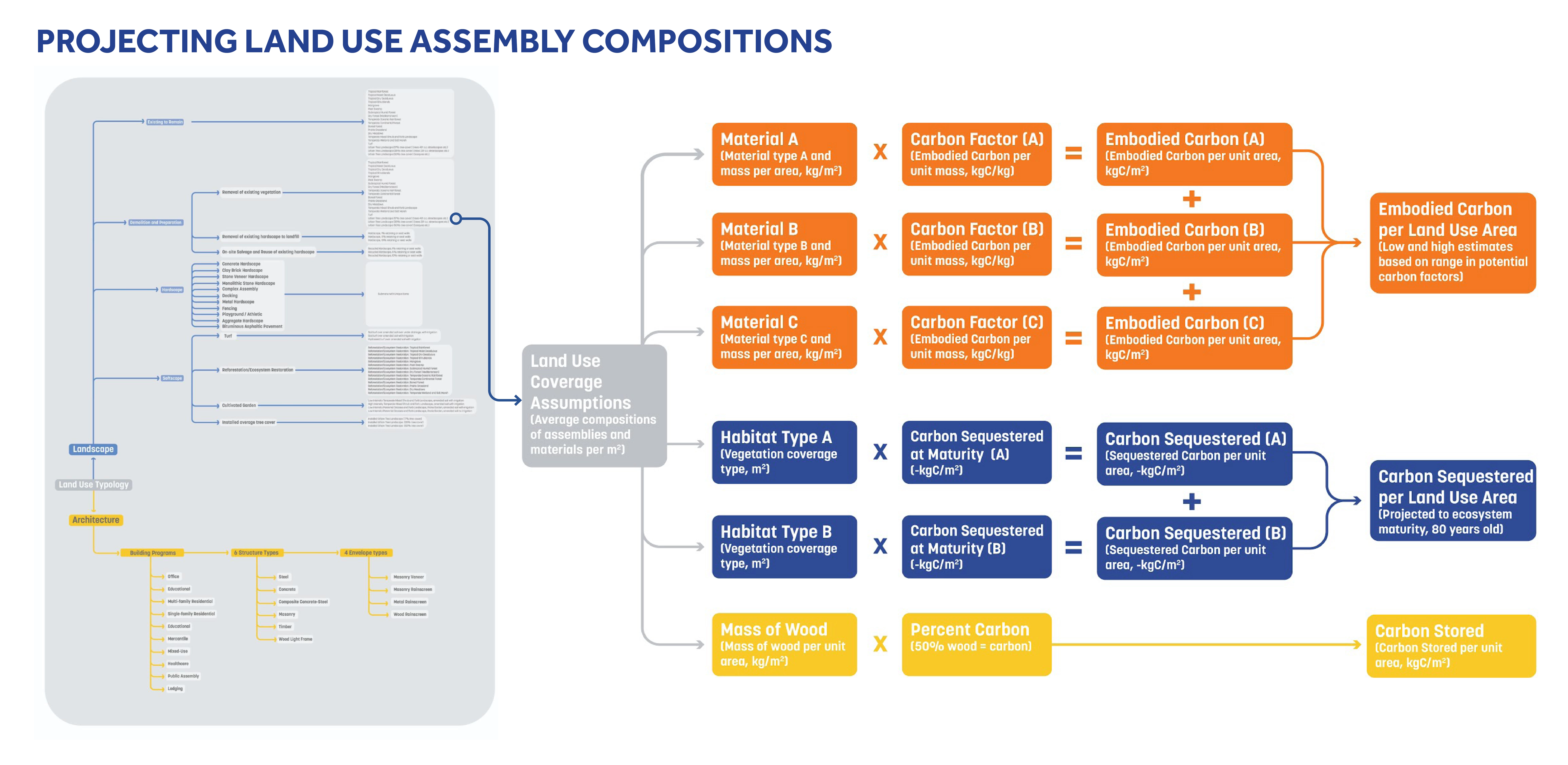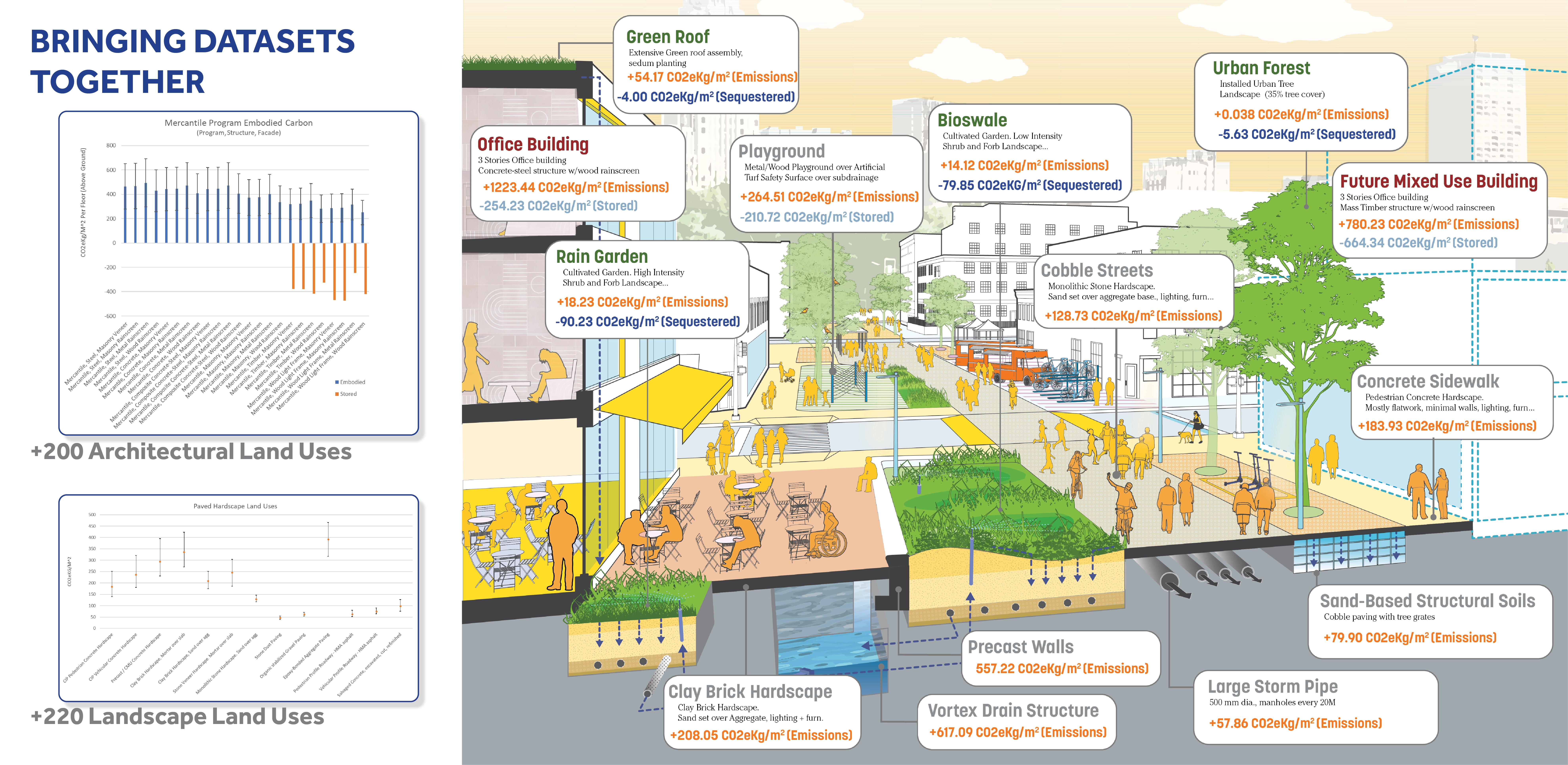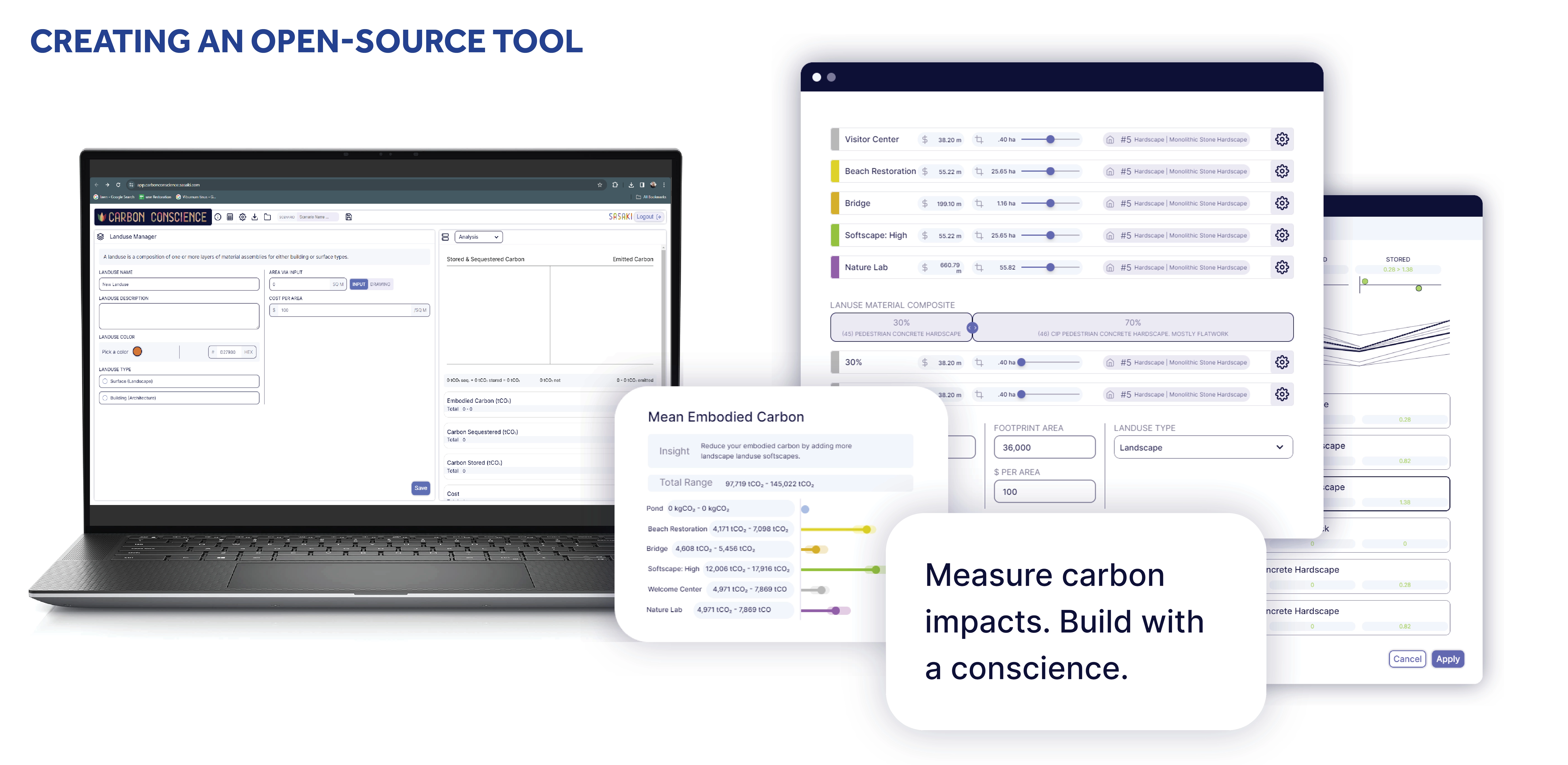 Carbon Conscience brings together landscape, architectural, and ecological literature into a common platform to make the potential global warming impacts of the built environment easy to understand and address in the early design phases—when design project teams can change course, adjust frameworks, and most effectively advocate for low-carbon design.  The research started with a literature review to understand global warming impacts of land use decisions—since land use is the most fundamental decision-making unit for planning and urban design work. Early in the study, the landscape architect researcher learned that there were no clear baseline datasets for landscape materials. The investigation expanded to include over 170 unique materials and product typologies specified in landscape design projects. The team aggregated life cycle assessments (LCAs) and used box-plot statistics to report carbon factor ranges per typology.  The research team then developed an inventory of land use assembly assumptions based on representative projects, resulting in over 220 unique landscape (and 200 architectural) land uses. Applying these assumptions based on unit area coverage, the researcher was able to estimate the mass of the various materials required to build that land use and then multiplied those quantities by their carbon factors and transportation costs to provide projected low-, mean-, and high-embodied carbon per land use. The team used a whole ecosystem approach to understand carbon sequestration capacity, studying the average carbon sequestration rates and storage capacity for macro ecosystems which could be translated to land use projections. The wide range of consulted white papers inevitably used different methods. To harmonize these citations into a common format, the team developed a matrix that correlated the projected biomass, average annual sequestration rates, decomposition rates, and allochthonous carbon assumptions. This step uncovered a huge range of sequestration potential—from low-carbon dry chaparral to extremely high-carbon mangroves. The team discovered the need to differentiate its models to include logistic curves for forests and linear regressions for wetlands—and the need to account for variable decomposition rates based on climatic assumptions and capacity for accumulation of soil organic carbon over time.  The team was now able to compare land uses, such as estimating how many acres of restored temperate forest could offset a new building, or understanding the sequestration potential of a mangrove swamp at risk of demolition. A unique innovation was representing the living systems of the constructed environment in the same manner and rigor as buildings and infrastructure.  The immediate products of this work included a white paper and dataset with a full, replicable methodology. This database is translated into the free and open-source Carbon Conscience platform for any designer, agency, or activist to test their ideas. The dataset is being integrated into the source data for the next version of the Pathfinder, EPIC, and Landkit, and is referenced in North Carolina State University Professor Meg Caulkins's upcoming book on low-carbon construction materials and design. This research revealed many questions and gaps in the literature, but it significantly boosts how landscape architects can tackle the challenge of decarbonizing the built environment through a collective effort—one design at a time.