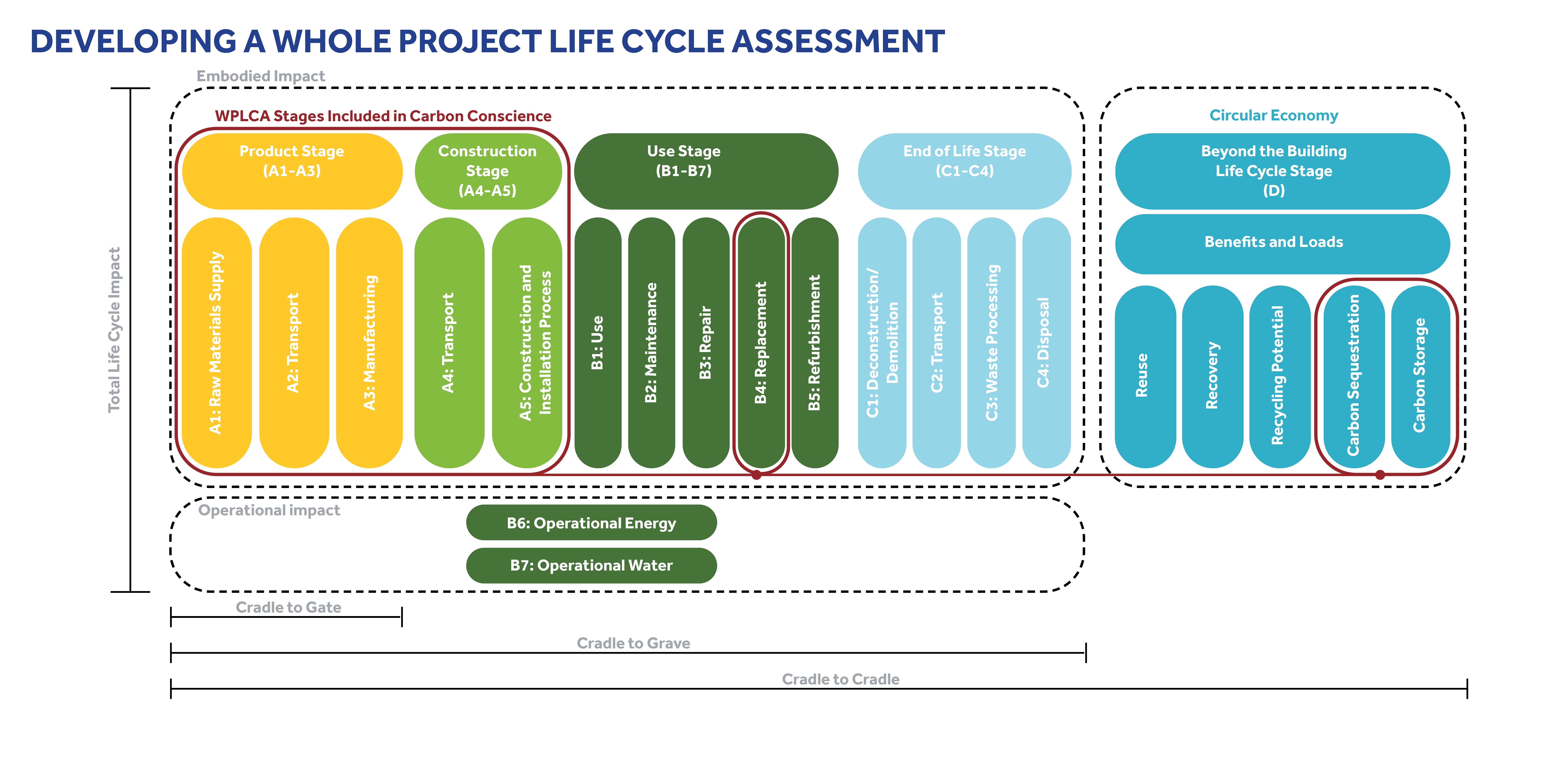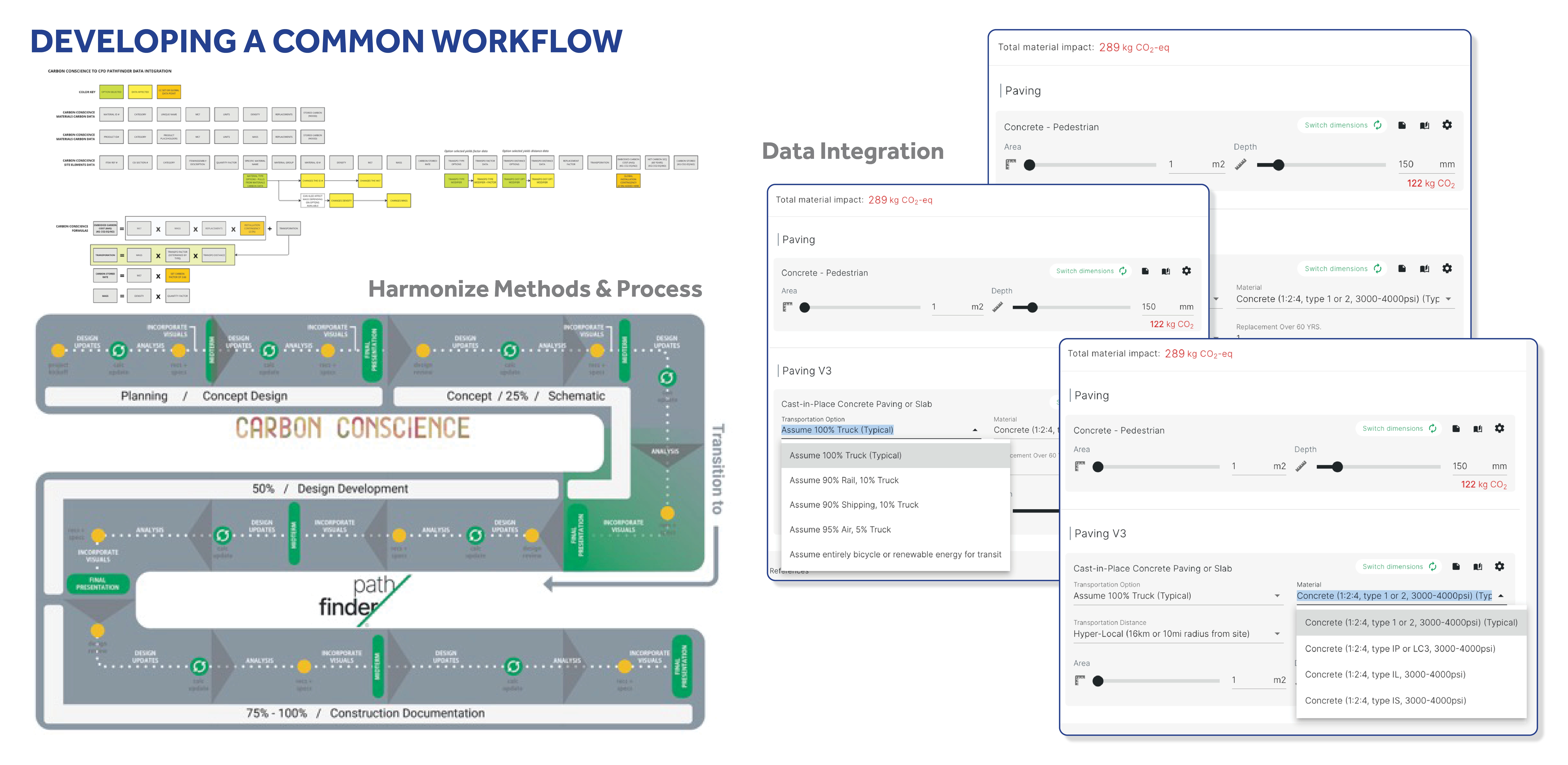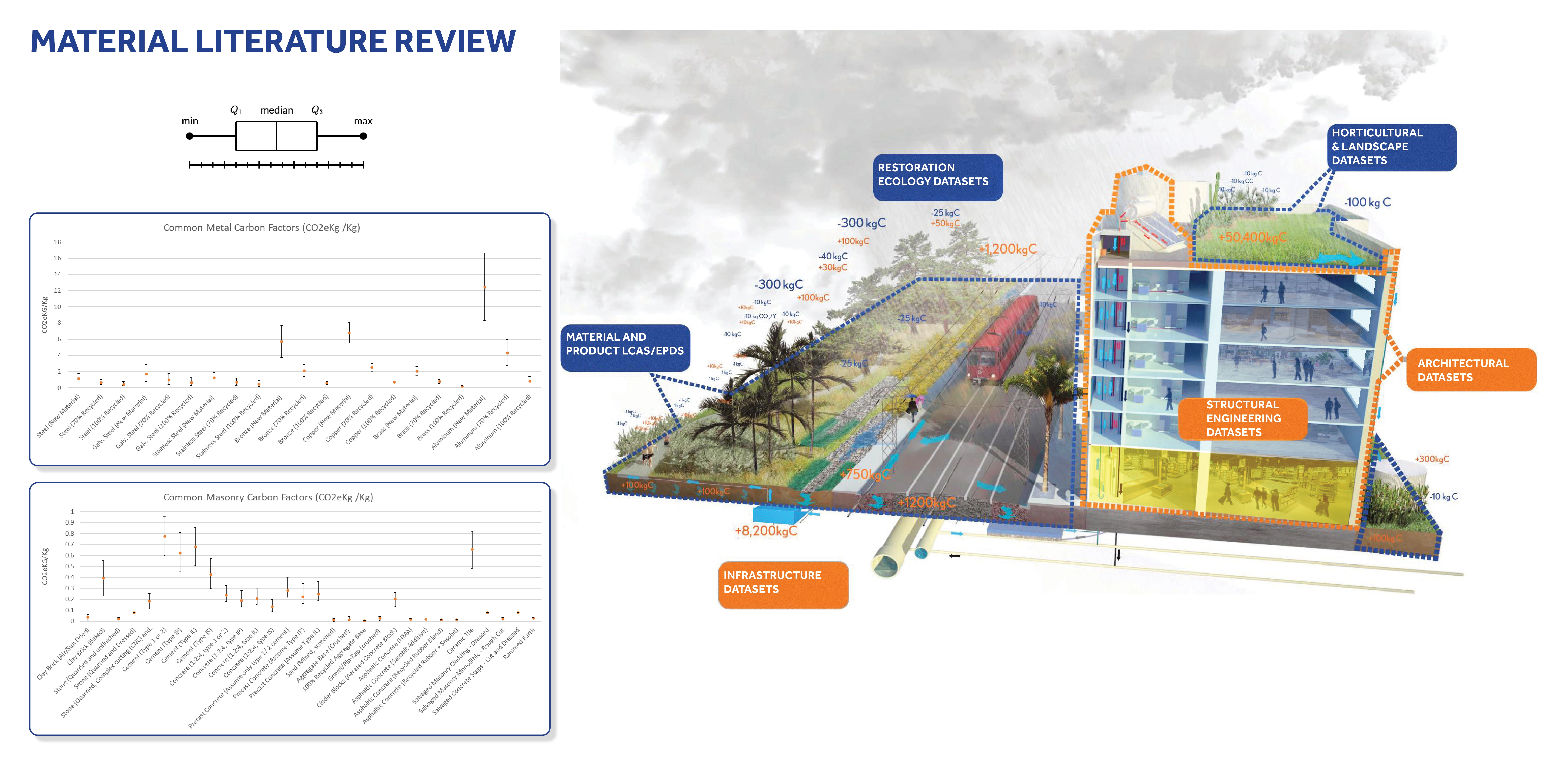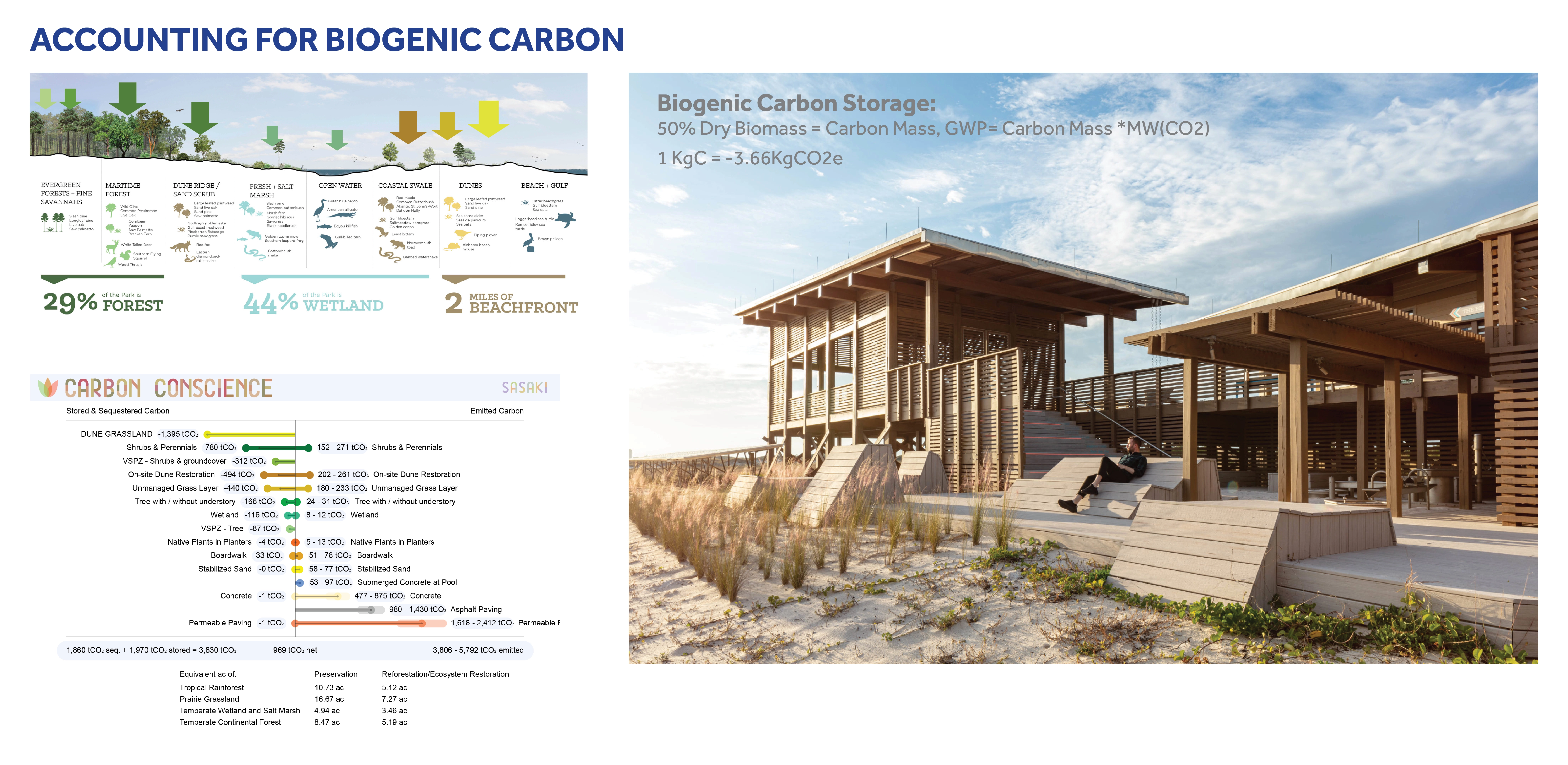 Carbon Conscience brings together landscape, architectural, and ecological literature into a common platform to make the potential global warming impacts of the built environment easy to understand and address in the early design phases—when design project teams can change course, adjust frameworks, and most effectively advocate for low-carbon design.  The research started with a literature review to understand global warming impacts of land use decisions—since land use is the most fundamental decision-making unit for planning and urban design work. Early in the study, the landscape architect researcher learned that there were no clear baseline datasets for landscape materials. The investigation expanded to include over 170 unique materials and product typologies specified in landscape design projects. The team aggregated life cycle assessments (LCAs) and used box-plot statistics to report carbon factor ranges per typology.  The research team then developed an inventory of land use assembly assumptions based on representative projects, resulting in over 220 unique landscape (and 200 architectural) land uses. Applying these assumptions based on unit area coverage, the researcher was able to estimate the mass of the various materials required to build that land use and then multiplied those quantities by their carbon factors and transportation costs to provide projected low-, mean-, and high-embodied carbon per land use. The team used a whole ecosystem approach to understand carbon sequestration capacity, studying the average carbon sequestration rates and storage capacity for macro ecosystems which could be translated to land use projections. The wide range of consulted white papers inevitably used different methods. To harmonize these citations into a common format, the team developed a matrix that correlated the projected biomass, average annual sequestration rates, decomposition rates, and allochthonous carbon assumptions. This step uncovered a huge range of sequestration potential—from low-carbon dry chaparral to extremely high-carbon mangroves. The team discovered the need to differentiate its models to include logistic curves for forests and linear regressions for wetlands—and the need to account for variable decomposition rates based on climatic assumptions and capacity for accumulation of soil organic carbon over time.  The team was now able to compare land uses, such as estimating how many acres of restored temperate forest could offset a new building, or understanding the sequestration potential of a mangrove swamp at risk of demolition. A unique innovation was representing the living systems of the constructed environment in the same manner and rigor as buildings and infrastructure.  The immediate products of this work included a white paper and dataset with a full, replicable methodology. This database is translated into the free and open-source Carbon Conscience platform for any designer, agency, or activist to test their ideas. The dataset is being integrated into the source data for the next version of the Pathfinder, EPIC, and Landkit, and is referenced in North Carolina State University Professor Meg Caulkins's upcoming book on low-carbon construction materials and design. This research revealed many questions and gaps in the literature, but it significantly boosts how landscape architects can tackle the challenge of decarbonizing the built environment through a collective effort—one design at a time.