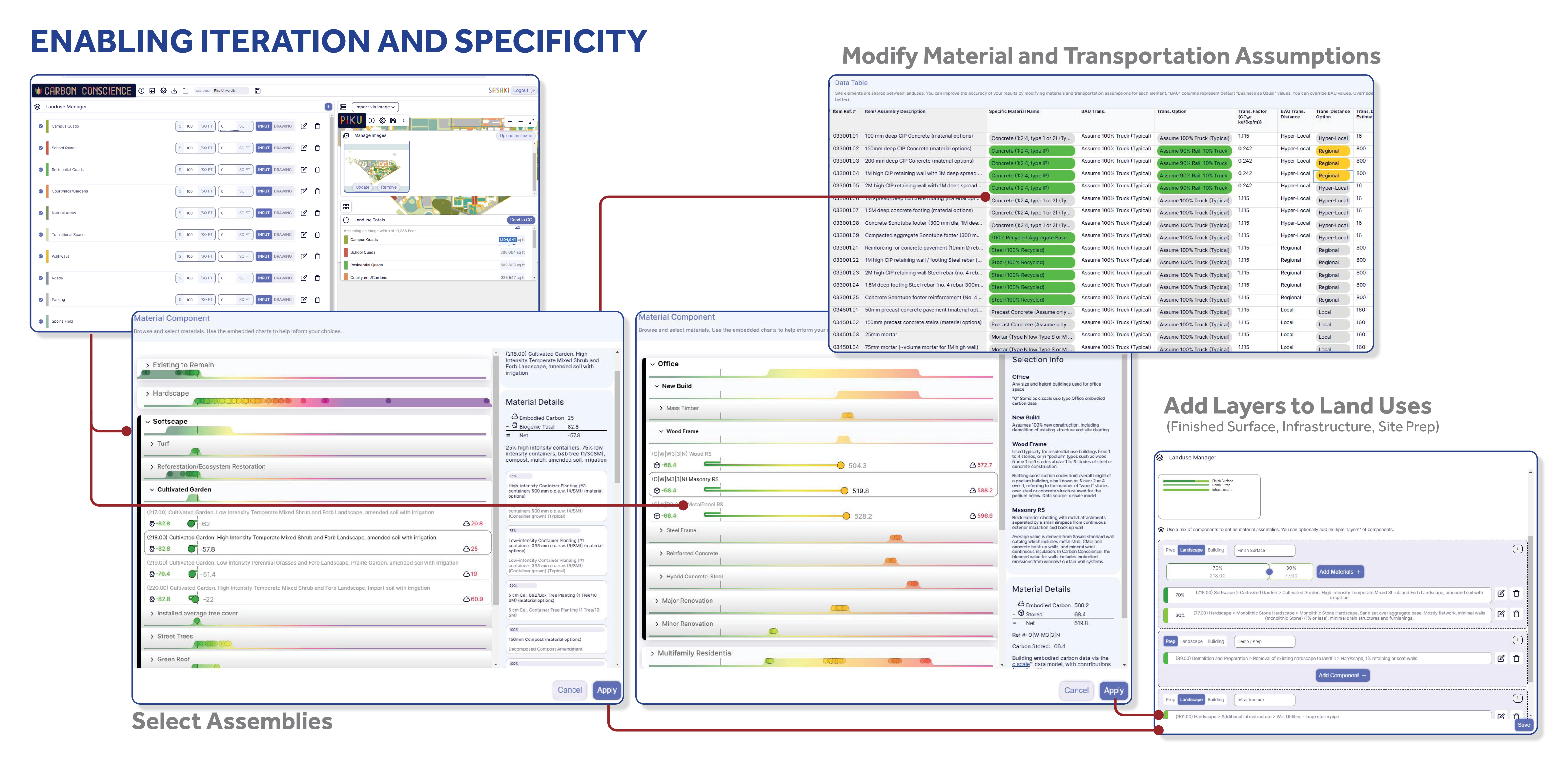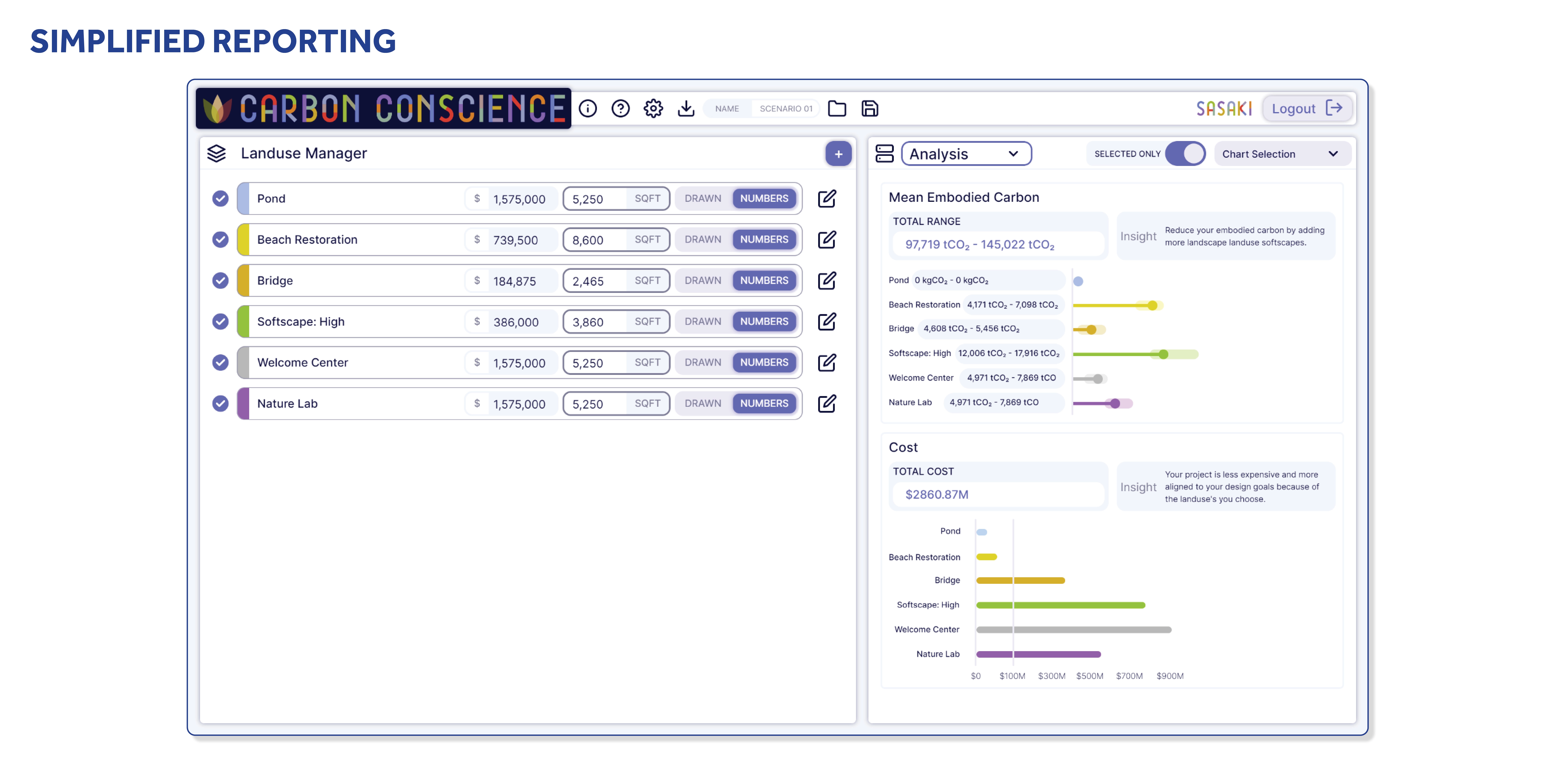 Carbon Conscience results from a multi-year investigation into how designers can make informed planning decisions related to climate impacts. This work included a literature review of over 400 sources, including architectural, industrial, ecological, and landscape white papers. Carbon Conscience is the only peer-reviewed dataset and application that brings landscape and architectural land uses together to study planning decisions from a whole project life cycle assessment perspective. It is now being integrated into the next generation of Pathfinder, Landkit, and EPIC tools. Carbon Conscience supports advocacy for investing in living systems for carbon drawdown and reducing embodied carbon in the built environment.