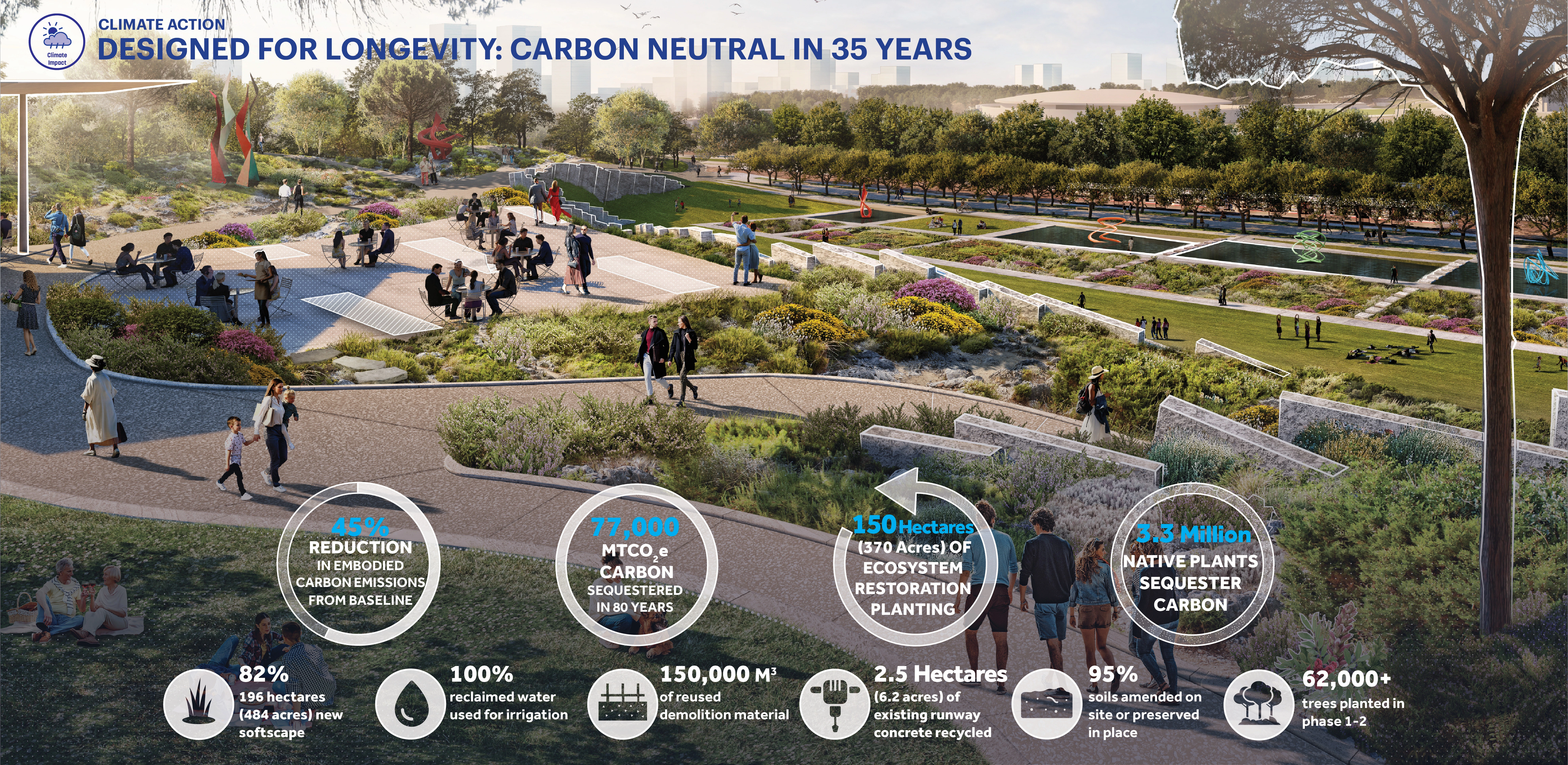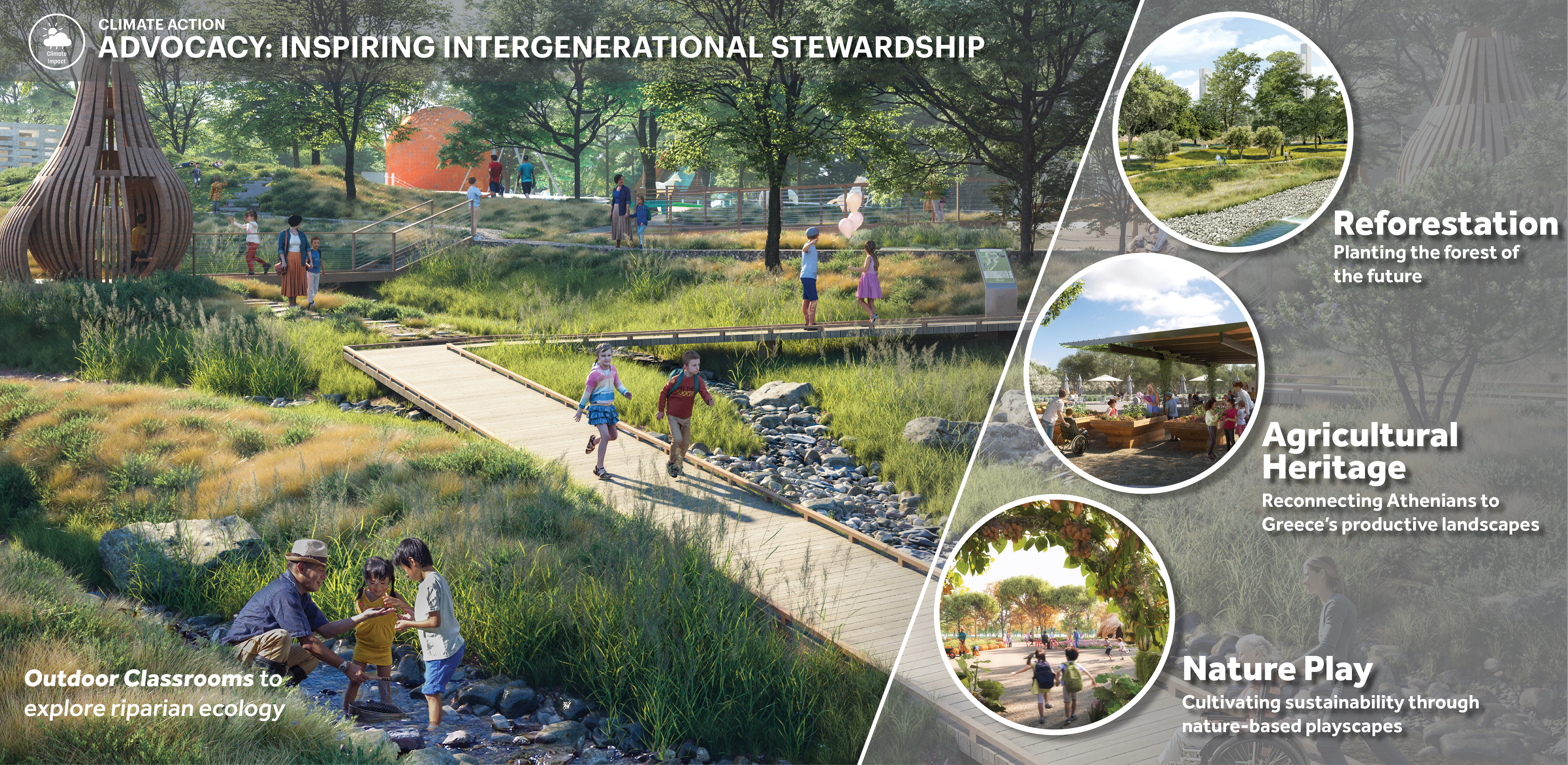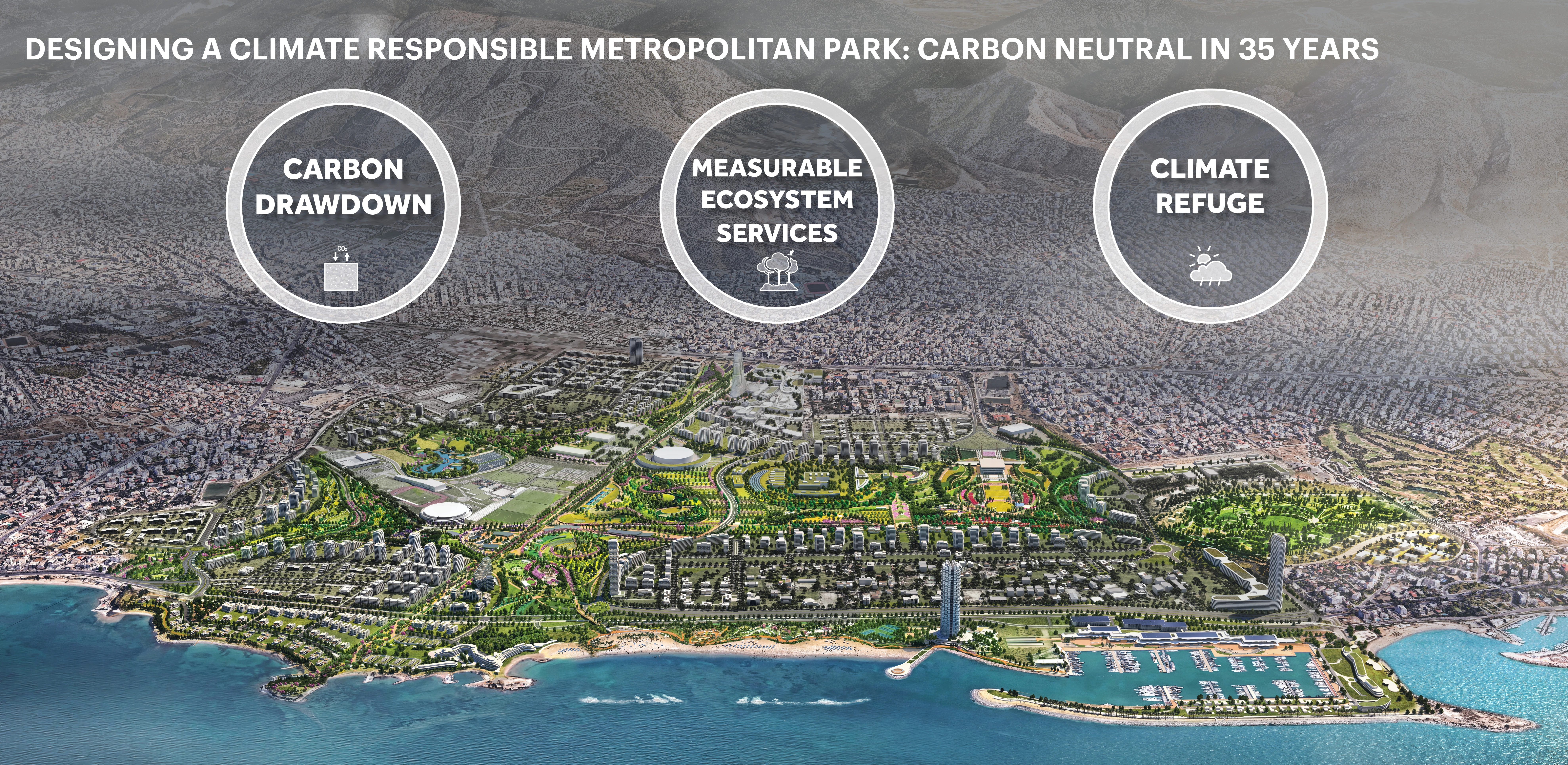 The planning of the 650-acre Ellinikon Park began with a climate action goal-setting exercise and prioritization workshop. Through the use of benchmarking and interactive digital tools, the team convinced the client to pursue ambitious climate action goals, including planning for a carbon-positive, low-water use landscape, and creating an urban heat refuge. This commitment enabled supplemental field investigations, including extensive soil and concrete testing and field surveys of established vegetation across the decommissioned Athens International Airport site. Carbon goals proved particularly challenging at the onset when the design team created datasets with local Mediterranean ecosystem parameters, including a low-carbon sequestration and storage capacity biome, and local material Environmental Product Declarations. Through rounds of design iteration, testing, and advancement from planning to technical design phases, the park was able to achieve a projection of carbon neutrality in 35 years, a 45% decrease in embodied carbon, and an expectation of ~40,000 MTCO2e (metric-tons CO2 equivalent) additional carbon sequestered when the landscape achieves carbon carrying capacity. Key carbon reduction strategies included soil amendments and reuse, material reuse, afforestation, and minimizing new concrete applications. Repurposing of the existing airport runways enabled the reuse of approximately 150,000m3 of existing demolition material. Some materials are refinished in place; some are used in clean fill, crushed road base, or rip-rap; and some are upcycled as paving, benches, and retaining walls as a substitution for precast concrete. The planning process also included a full energy modeling study to size an on-site solar farm to offset operational energy. Maintenance manuals include specifying an all-electric fleet of vehicles and equipment, a commitment to organic horticulture, and integrated pest management practices. Irrigation is provided through reclaimed water sourced from sewage mining, with ~70% of the park dedicated as an ‘establishment-only irrigation zone’ and allowed to naturalize. A large-scale afforestation approach further supports carbon sequestration and urban heat island mitigation goals. The plant list—which includes over 3.3 million trees, shrubs, geophytes, and herbaceous material—was carefully considered based on native status, adaptability to local climatic conditions, and cultural connections and traditions. Given recent heat emergencies in Athens, and the projection for the city to see an average warming of +5.4°C by the end of the century, Ellinikon Park is designed as an urban heat refuge. The design team added strategically placed cooling stations, from water walls to misting stations within a 5-minute walk from anywhere within the park. The park also includes the largest public beach in Athens–a 1-kilometer-long, transit-served coastal front for an urban population that today must drive south or east beyond city limits to access high-quality public beaches. The Ellinikon Park and its waterfront will increase the allocation of open space per Athenian by 44%. This park is historic in ambition and service. It serves as a pivot from years of financial crisis and as an example of the future of Europe’s public spaces by providing an extraordinary public amenity with quality natural areas, play spaces, and recreational programs for an economically diverse and resilient community.