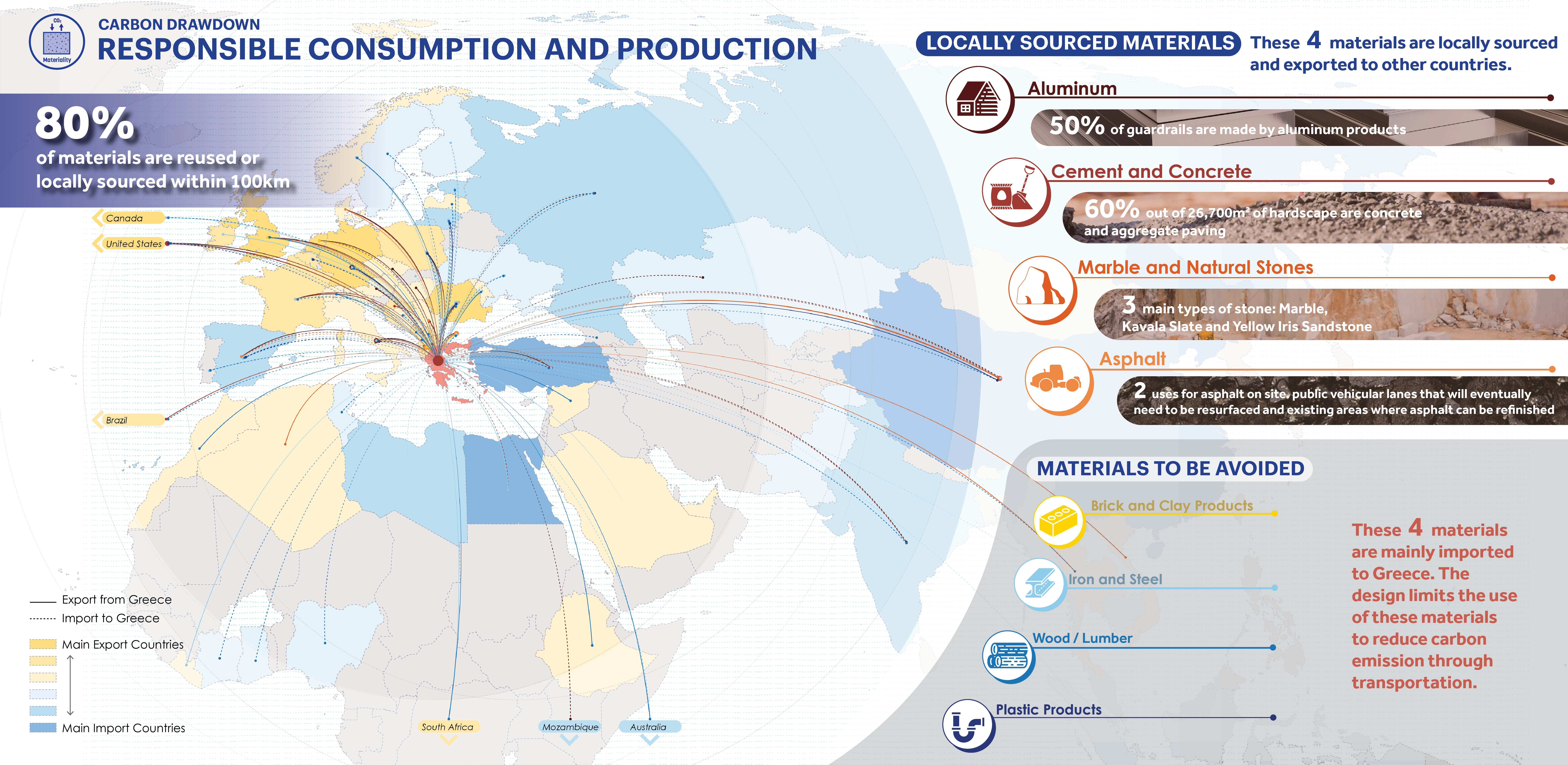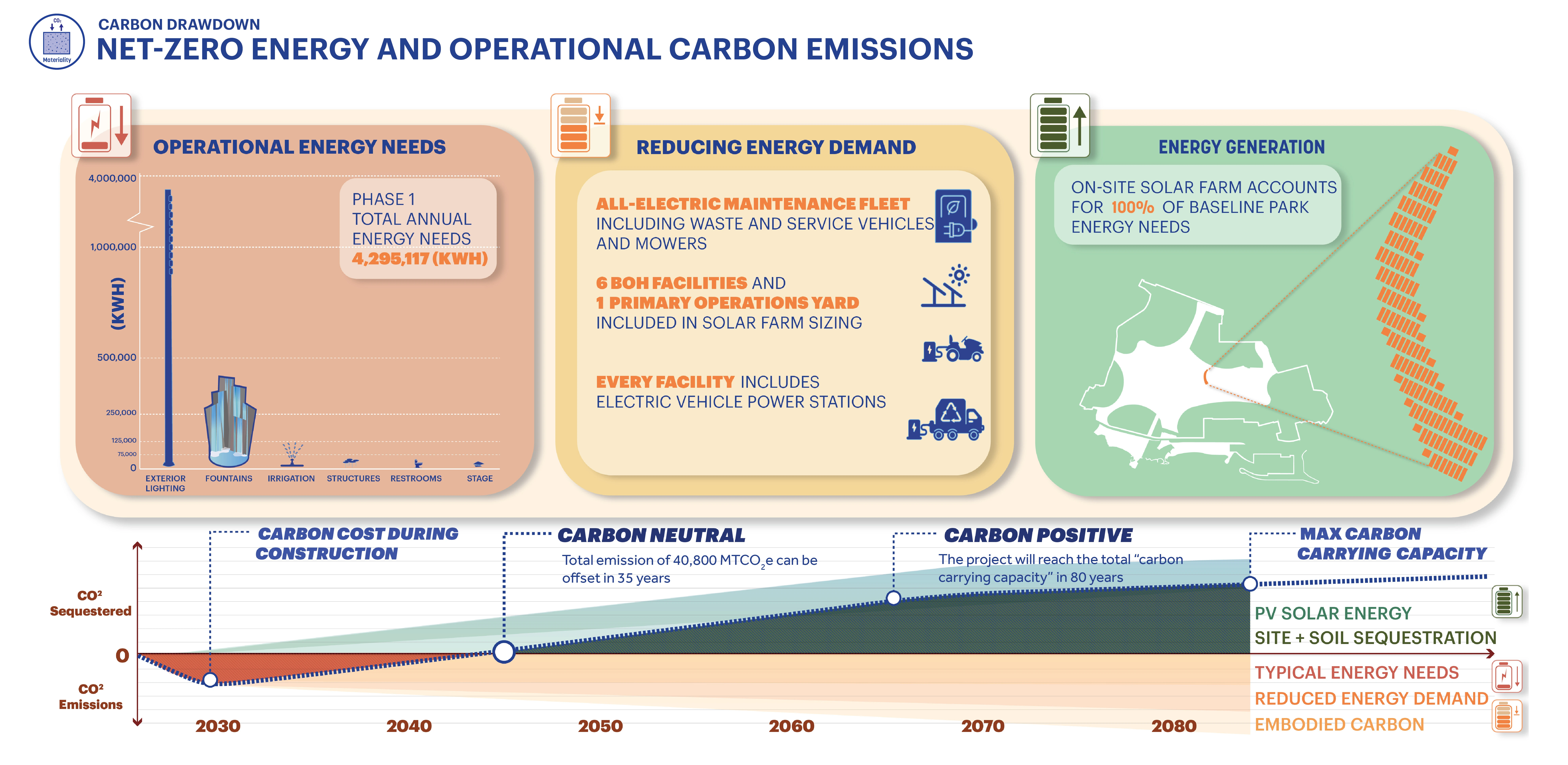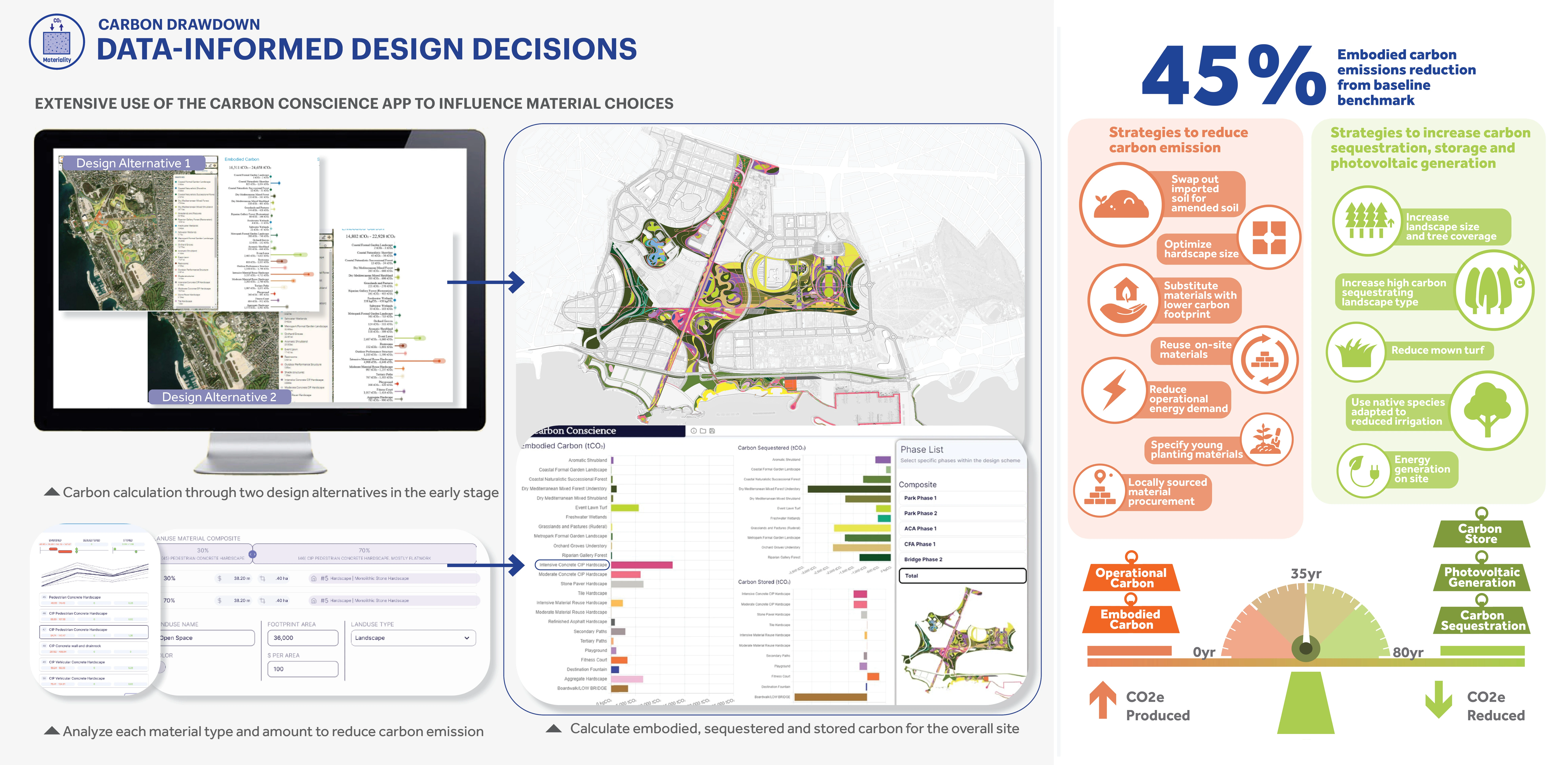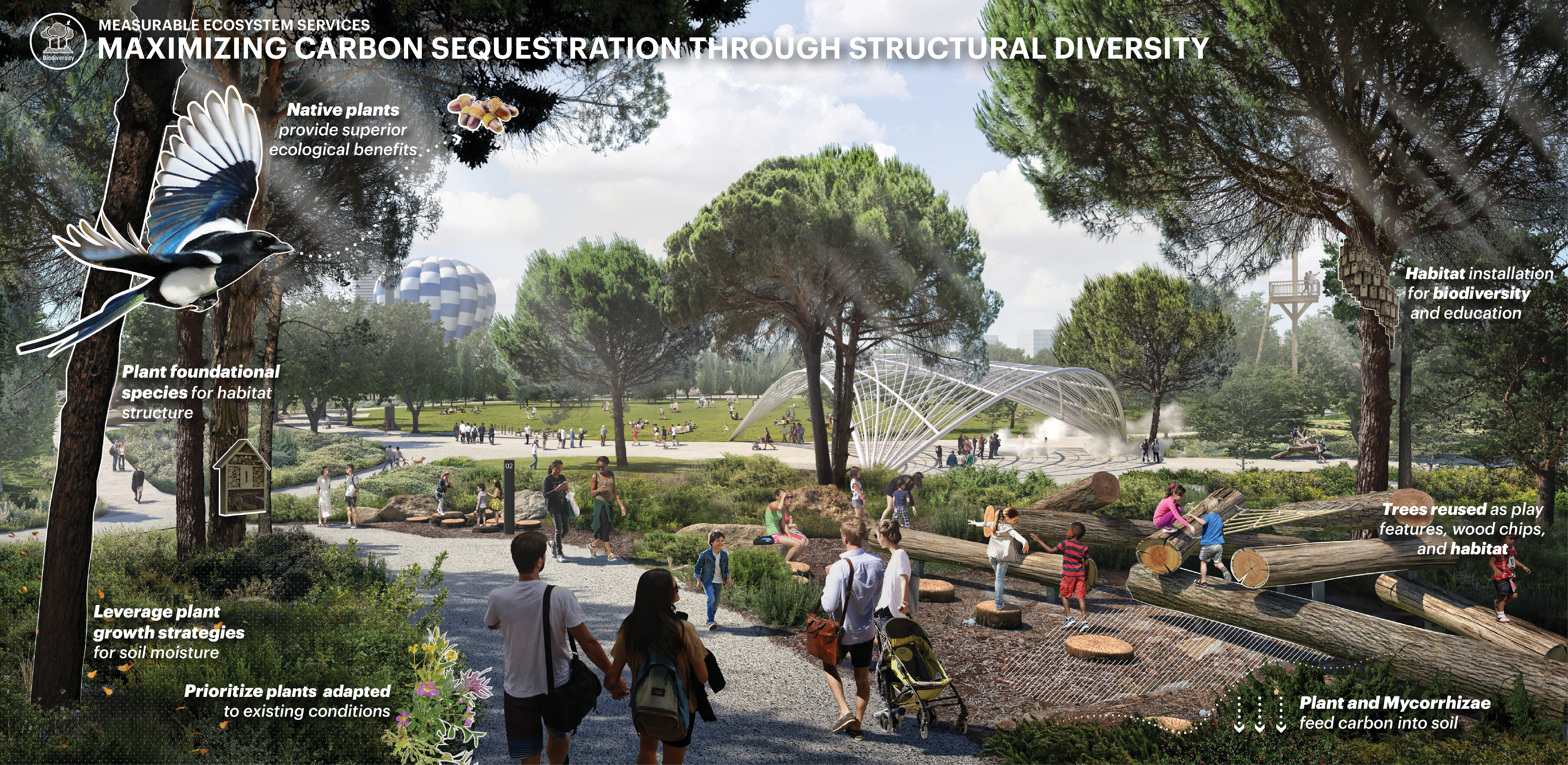 The planning of the 650-acre Ellinikon Park began with a climate action goal-setting exercise and prioritization workshop. Through the use of benchmarking and interactive digital tools, the team convinced the client to pursue ambitious climate action goals, including planning for a carbon-positive, low-water use landscape, and creating an urban heat refuge. This commitment enabled supplemental field investigations, including extensive soil and concrete testing and field surveys of established vegetation across the decommissioned Athens International Airport site. Carbon goals proved particularly challenging at the onset when the design team created datasets with local Mediterranean ecosystem parameters, including a low-carbon sequestration and storage capacity biome, and local material Environmental Product Declarations. Through rounds of design iteration, testing, and advancement from planning to technical design phases, the park was able to achieve a projection of carbon neutrality in 35 years, a 45% decrease in embodied carbon, and an expectation of ~40,000 MTCO2e (metric-tons CO2 equivalent) additional carbon sequestered when the landscape achieves carbon carrying capacity. Key carbon reduction strategies included soil amendments and reuse, material reuse, afforestation, and minimizing new concrete applications. Repurposing of the existing airport runways enabled the reuse of approximately 150,000m3 of existing demolition material. Some materials are refinished in place; some are used in clean fill, crushed road base, or rip-rap; and some are upcycled as paving, benches, and retaining walls as a substitution for precast concrete. The planning process also included a full energy modeling study to size an on-site solar farm to offset operational energy. Maintenance manuals include specifying an all-electric fleet of vehicles and equipment, a commitment to organic horticulture, and integrated pest management practices. Irrigation is provided through reclaimed water sourced from sewage mining, with ~70% of the park dedicated as an ‘establishment-only irrigation zone’ and allowed to naturalize. A large-scale afforestation approach further supports carbon sequestration and urban heat island mitigation goals. The plant list—which includes over 3.3 million trees, shrubs, geophytes, and herbaceous material—was carefully considered based on native status, adaptability to local climatic conditions, and cultural connections and traditions. Given recent heat emergencies in Athens, and the projection for the city to see an average warming of +5.4°C by the end of the century, Ellinikon Park is designed as an urban heat refuge. The design team added strategically placed cooling stations, from water walls to misting stations within a 5-minute walk from anywhere within the park. The park also includes the largest public beach in Athens–a 1-kilometer-long, transit-served coastal front for an urban population that today must drive south or east beyond city limits to access high-quality public beaches. The Ellinikon Park and its waterfront will increase the allocation of open space per Athenian by 44%. This park is historic in ambition and service. It serves as a pivot from years of financial crisis and as an example of the future of Europe’s public spaces by providing an extraordinary public amenity with quality natural areas, play spaces, and recreational programs for an economically diverse and resilient community.