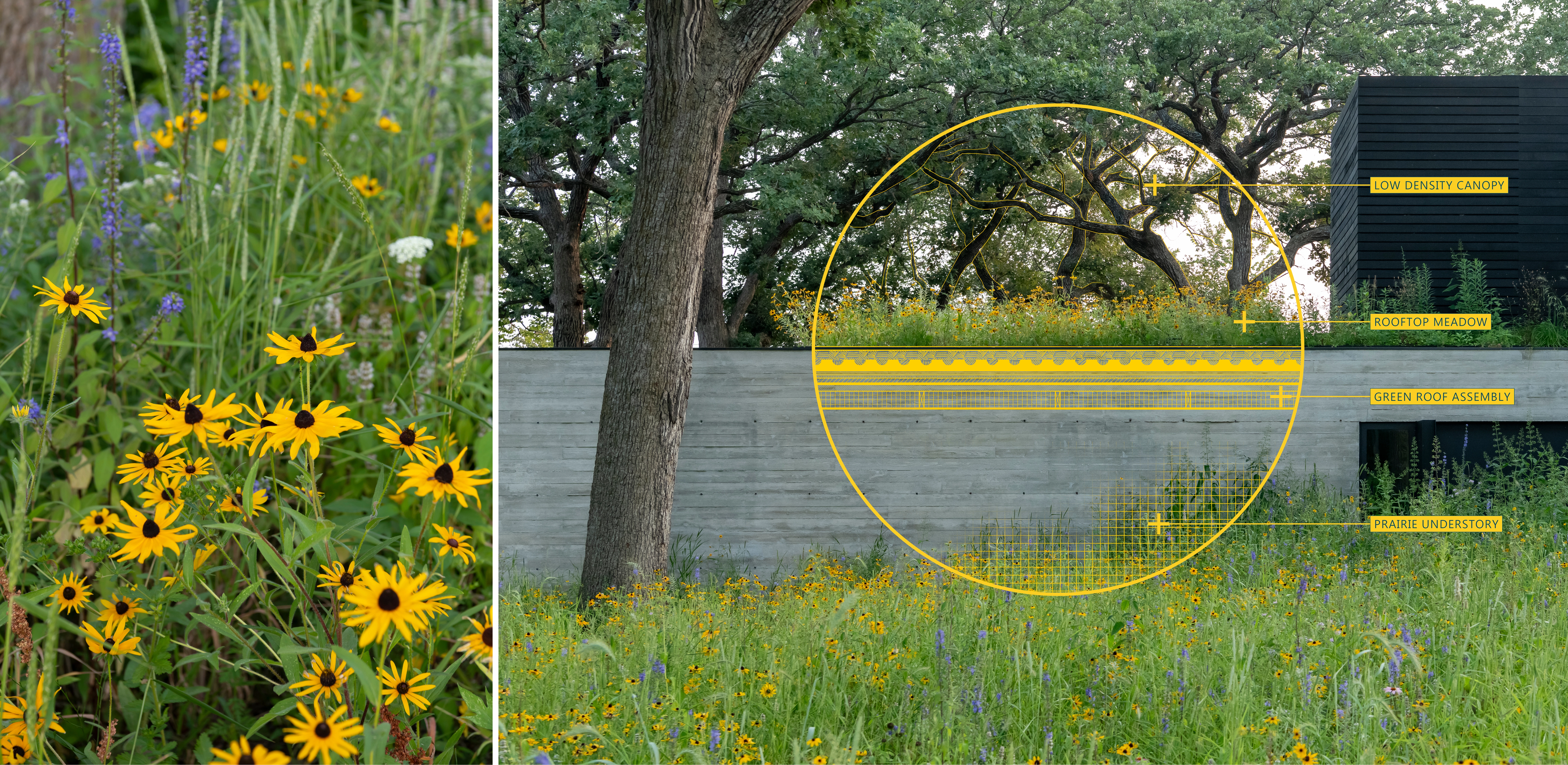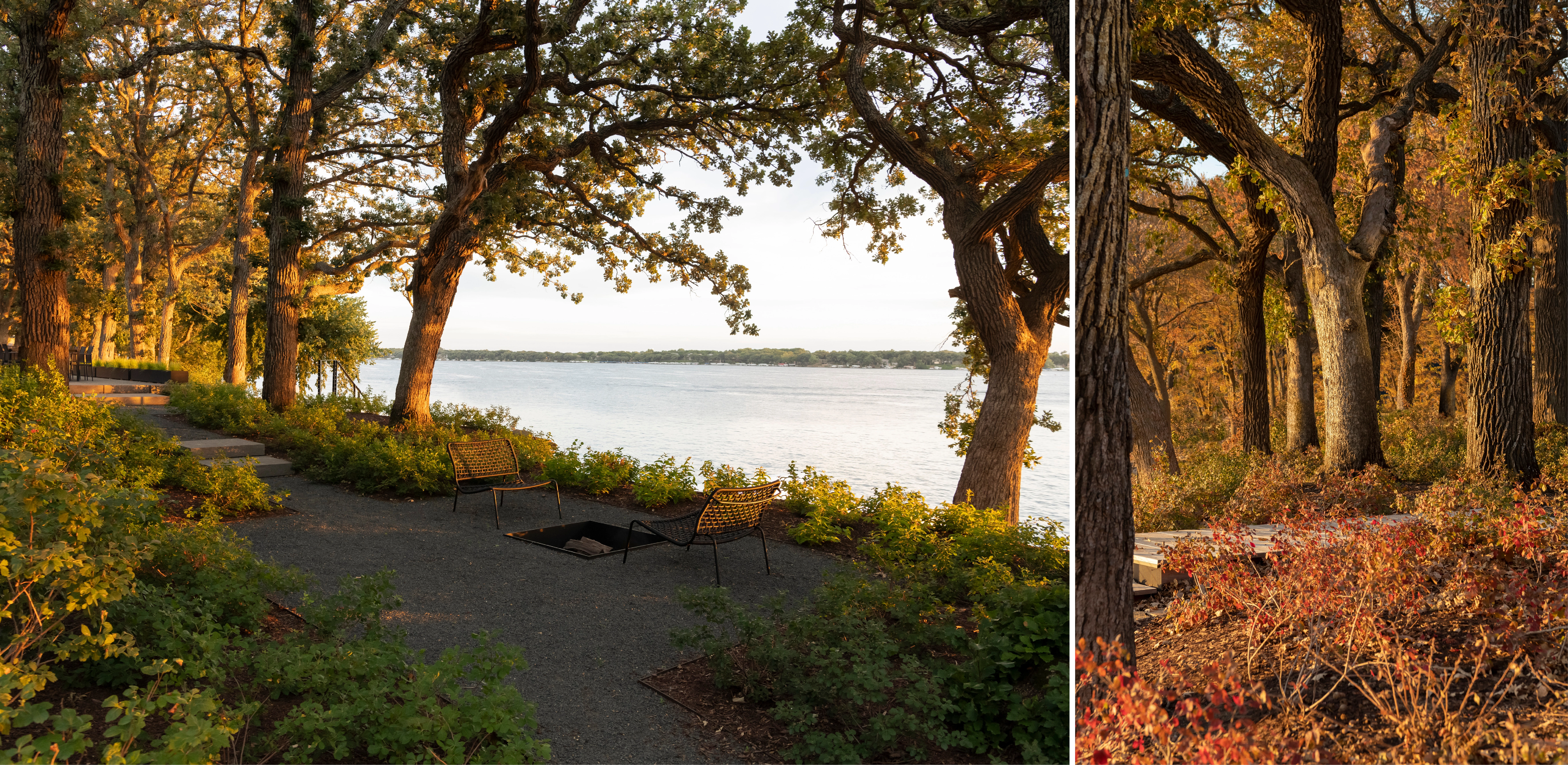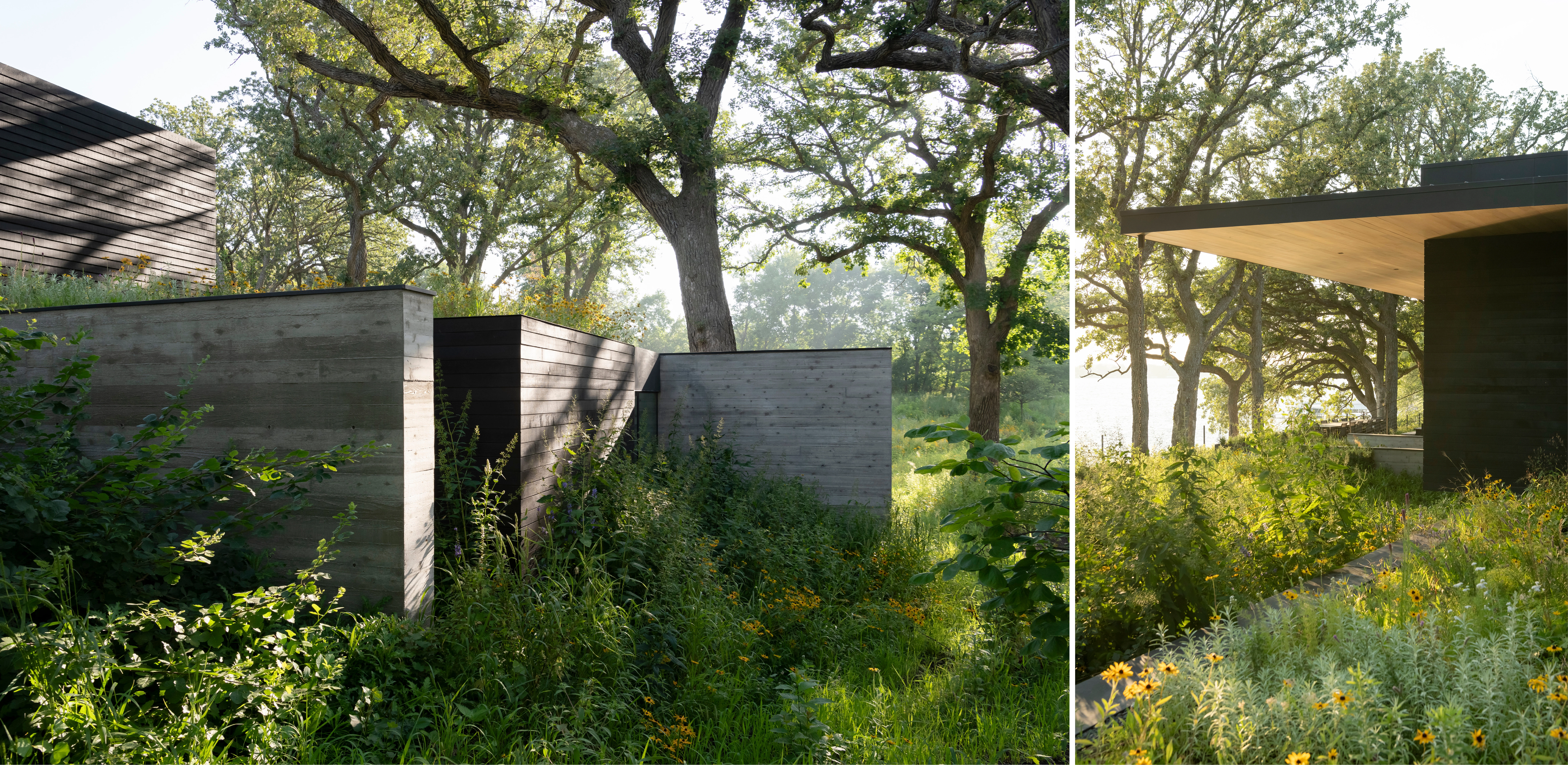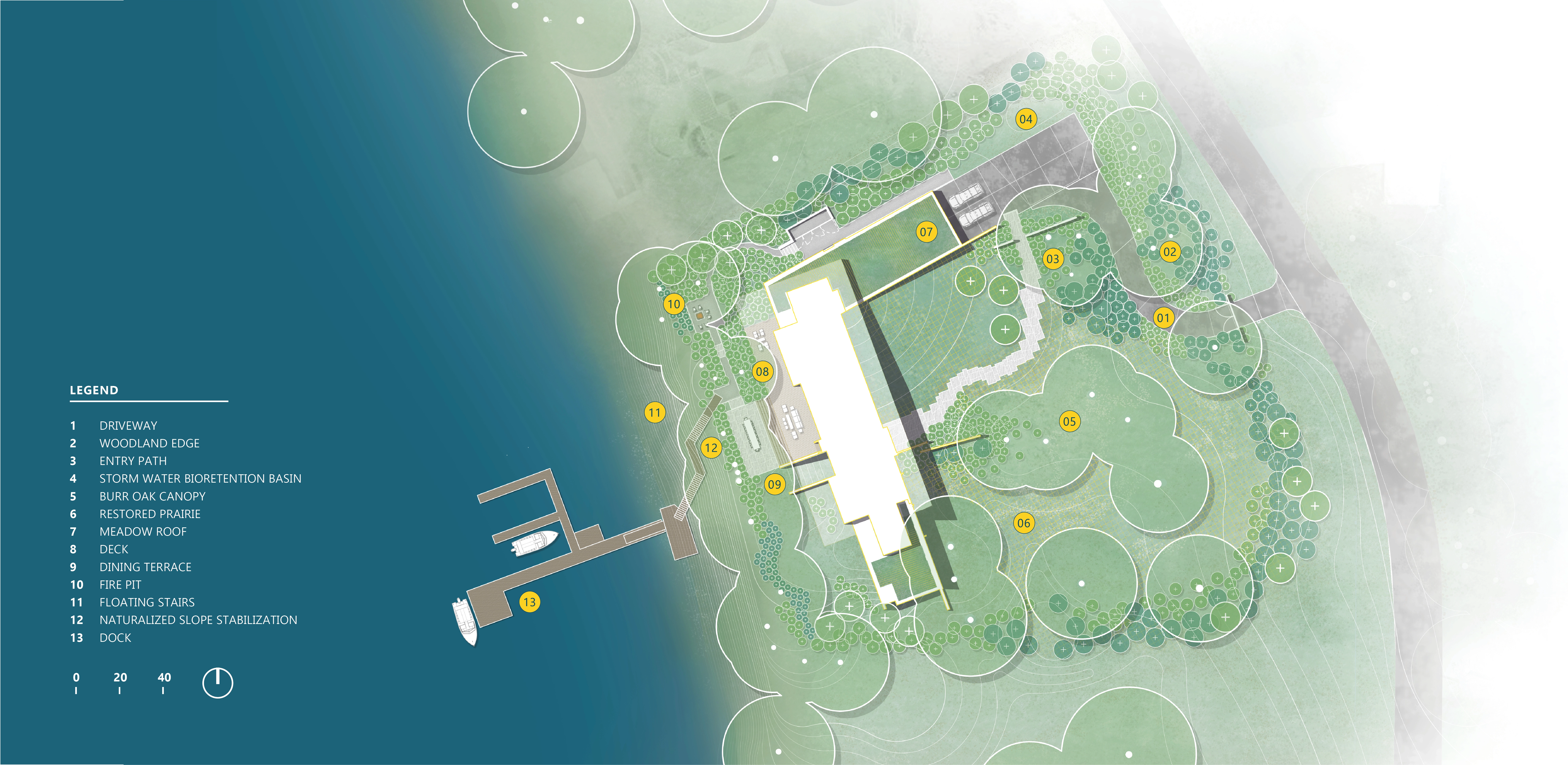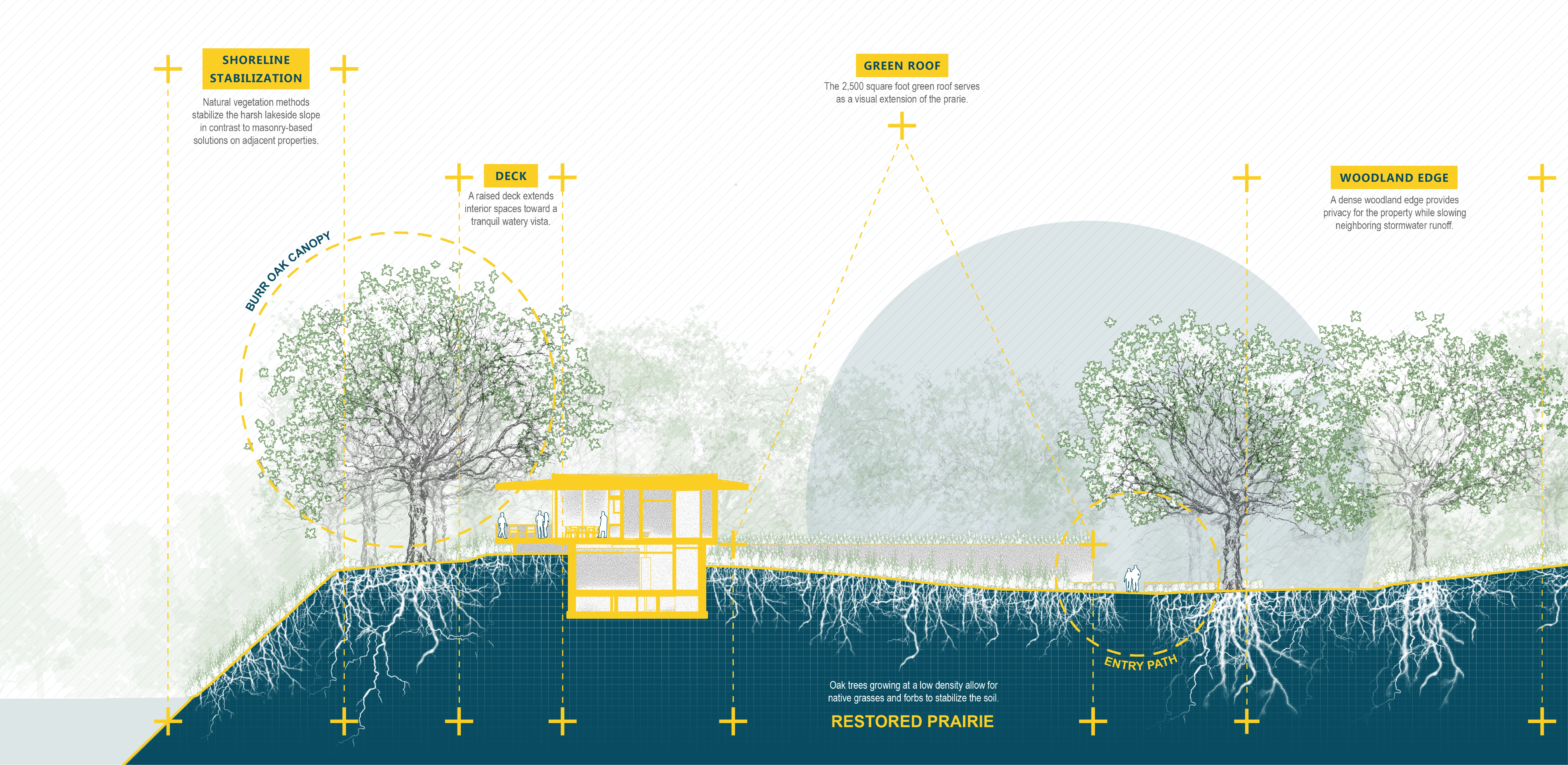 PROCESS Understanding that a savanna possesses a wide range of habitats and canopy coverage, the team created a transect of the property, analyzing canopy closure and drainage patterns to define three distinct landscapes: prairie, open woodland, and woodland. Next, the design removed all non-native species, reduced vehicular paved areas by 40%, and replaced 35,000 square feet of lawn with over twenty varieties of grasses and sedges, and ninety species of wildflowers. Lakeside, native plants with root systems predisposed to providing natural erosion control stabilized the extreme 1.5:1 slope while wetland plugs offer a riparian buffer, improving water quality and biodiversity. This approach challenged existing regulations that proposed masonry-based solutions – a common approach that had armored and individualized the once-natural bank.