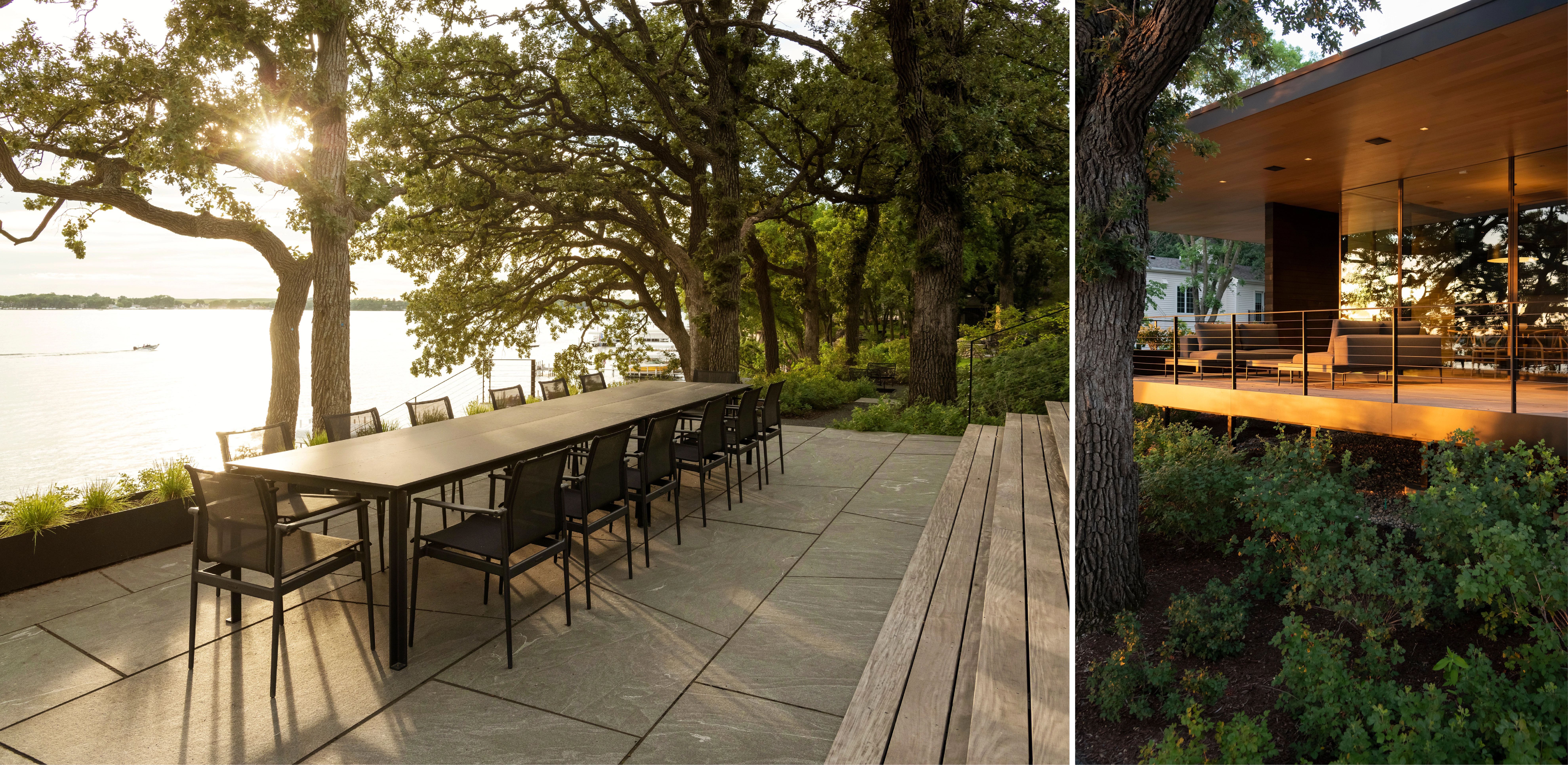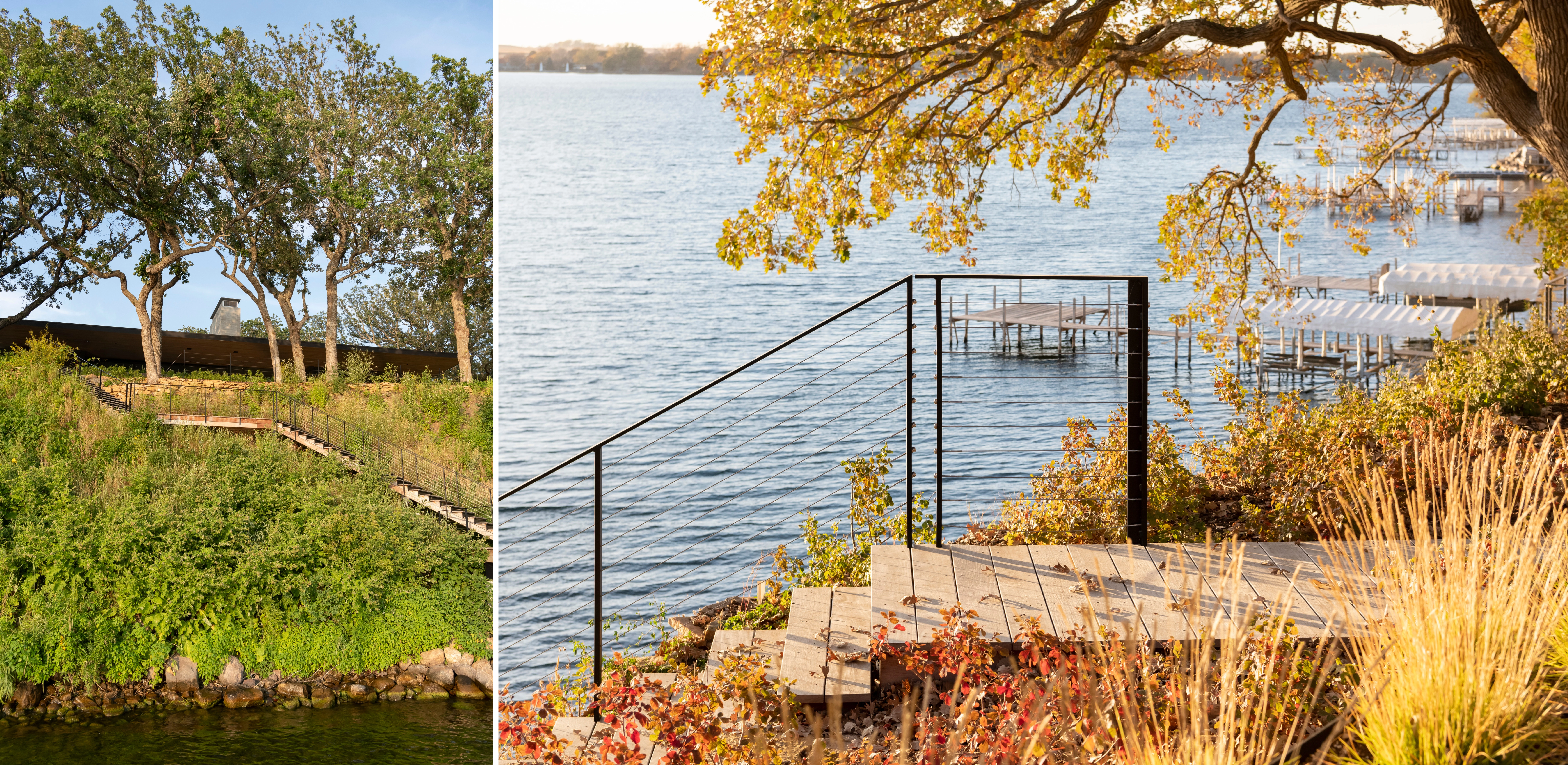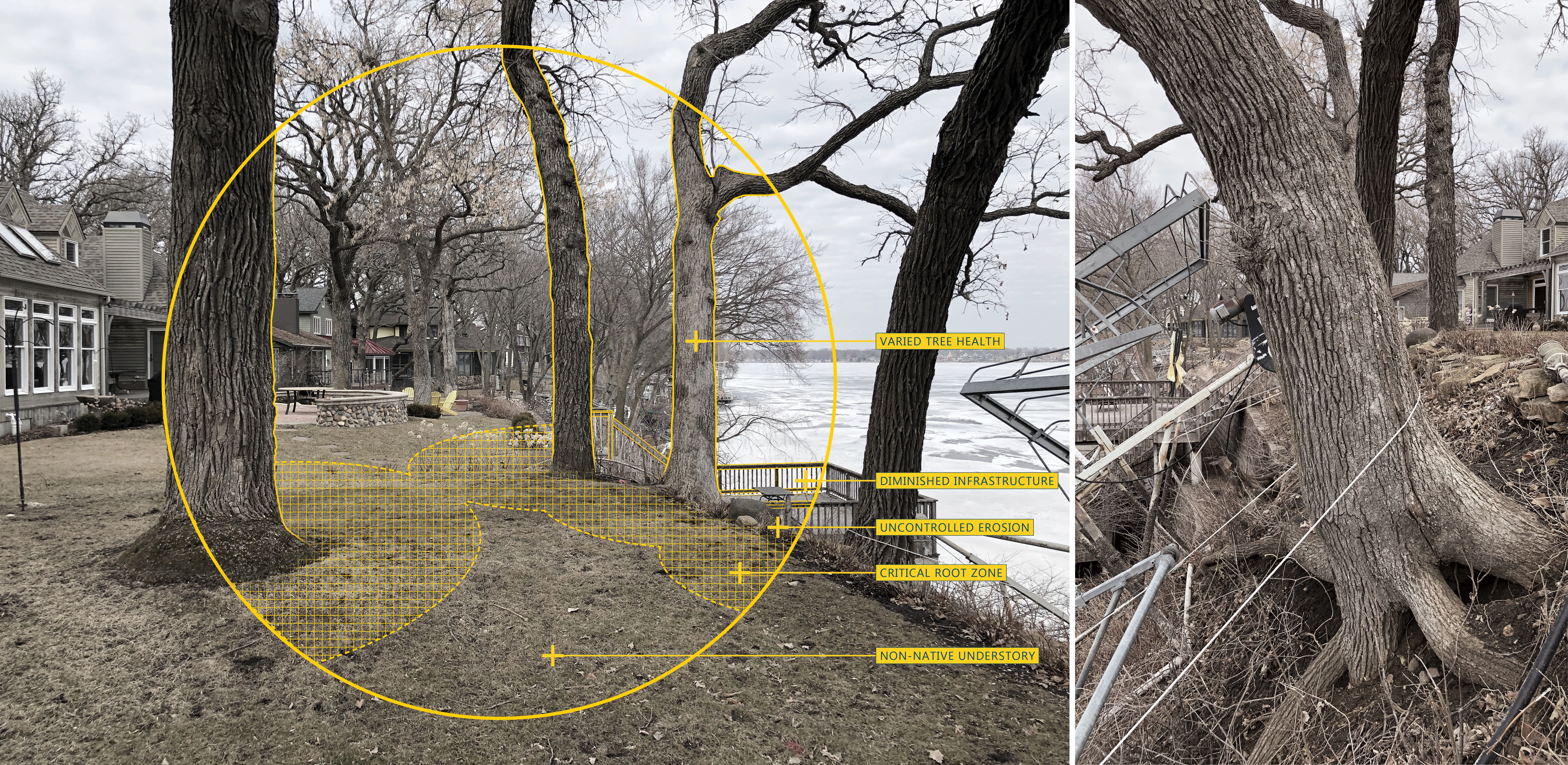 CONTEXT Overlooking pristine waters of a glacially-formed lake, the 1.7-acre property sustained decades of intense human intervention, diminishing its ecological value and denuding the native landscape. Multiple structures, large expanses of lawn, and tree-girdling asphalt extents combined with unstable and eroded shoreline comprised of non-native species, demonstrated the need for a renewed commitment to proper land management. A dense and competing canopy of non-native trees overwhelmed visible signs of understory growth, allowing sediment and chemicals from adjacent properties to drain into the lake. Degraded conditions aside, stands of burr oaks punctuate the land, recalling the once dominant oak savannas that proliferated across the region, but are rarely seen today.