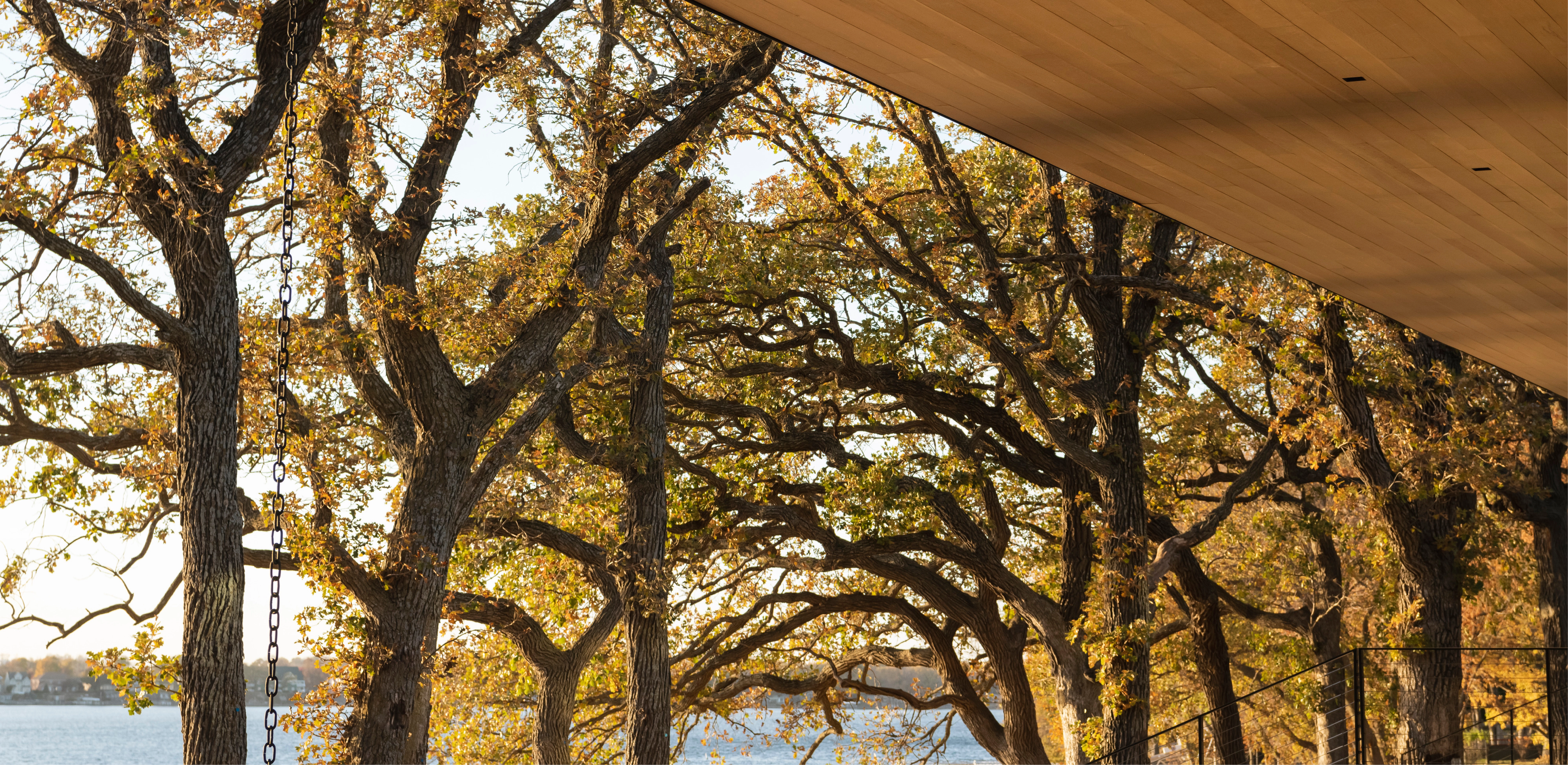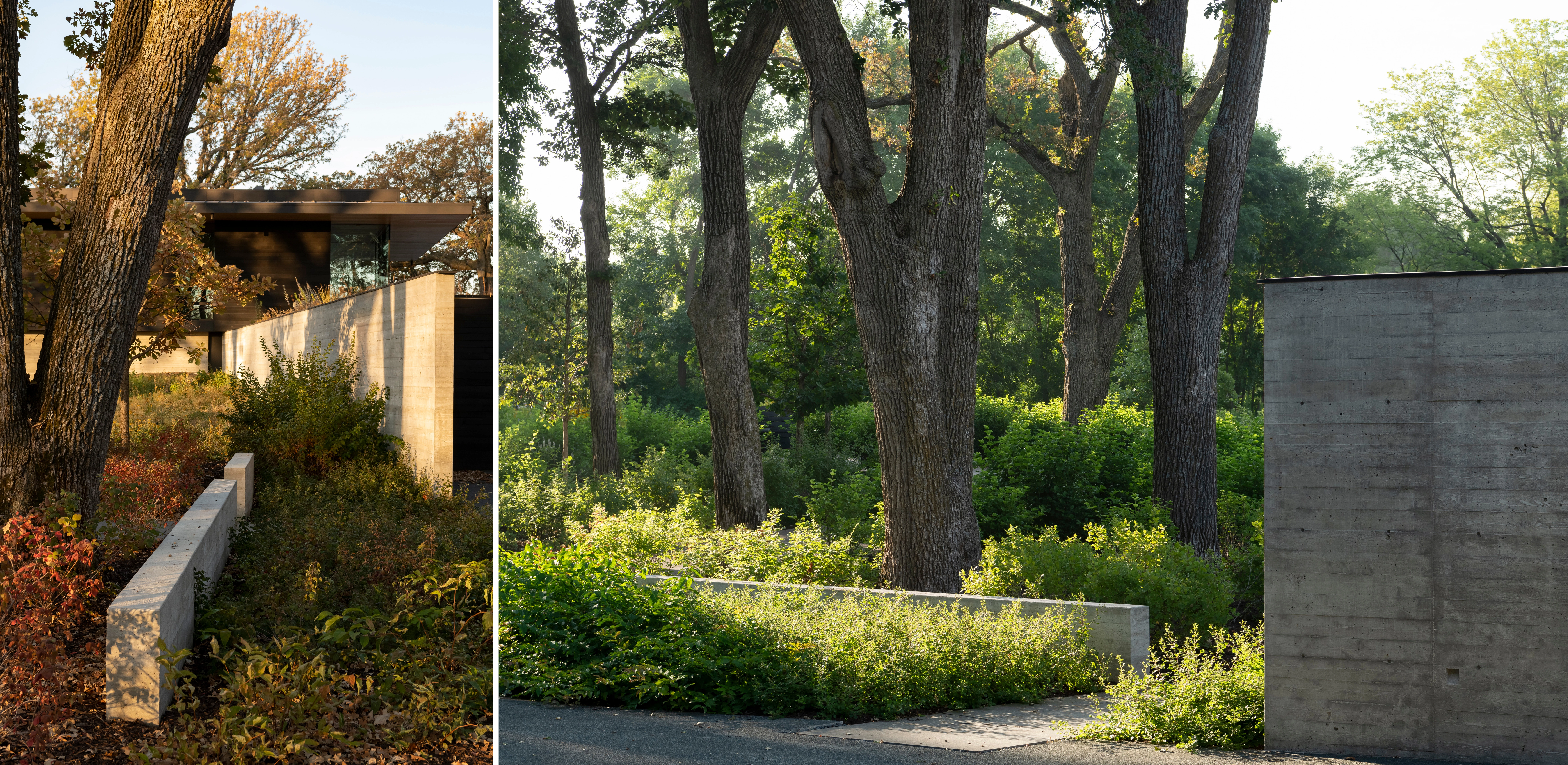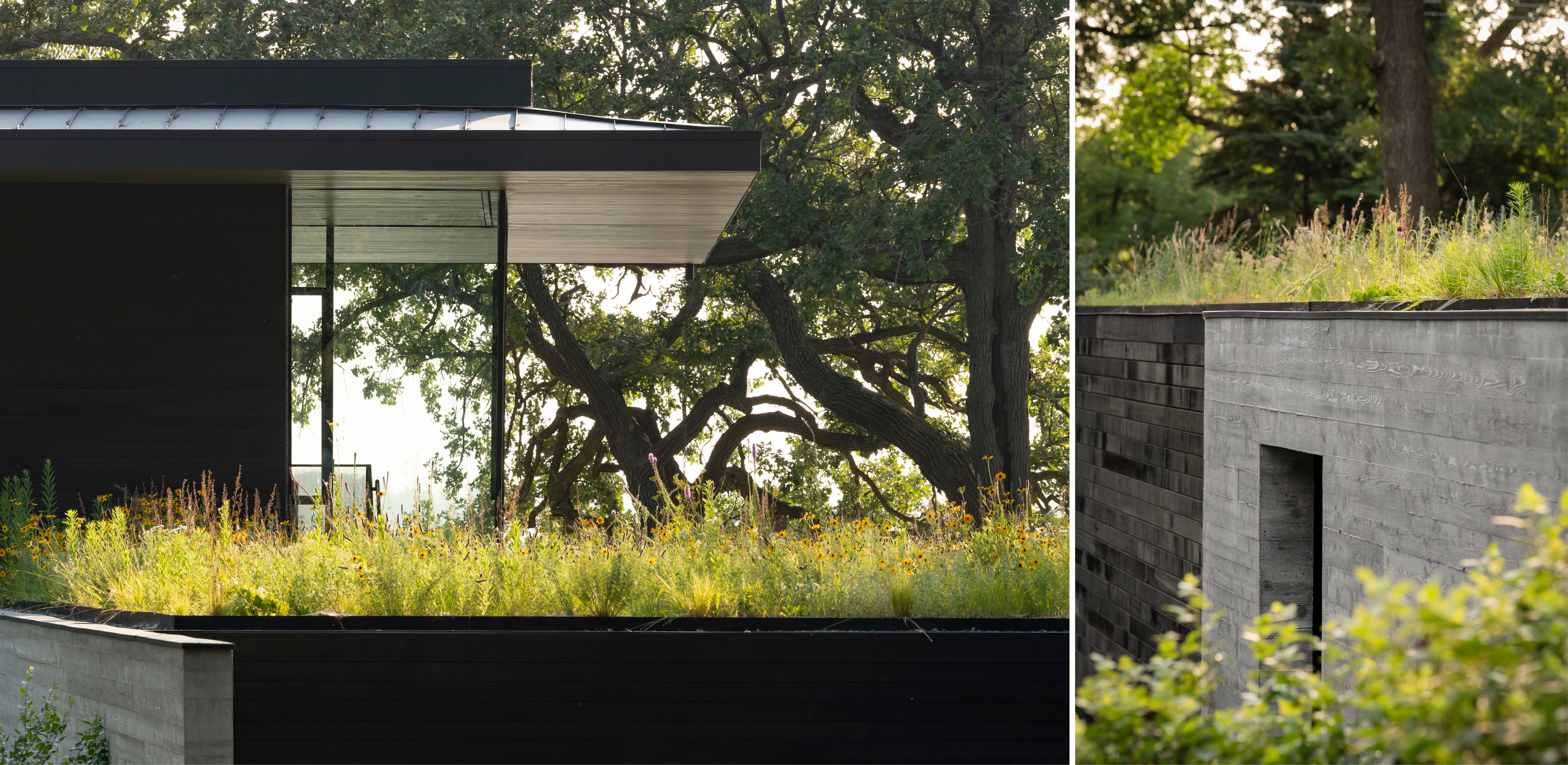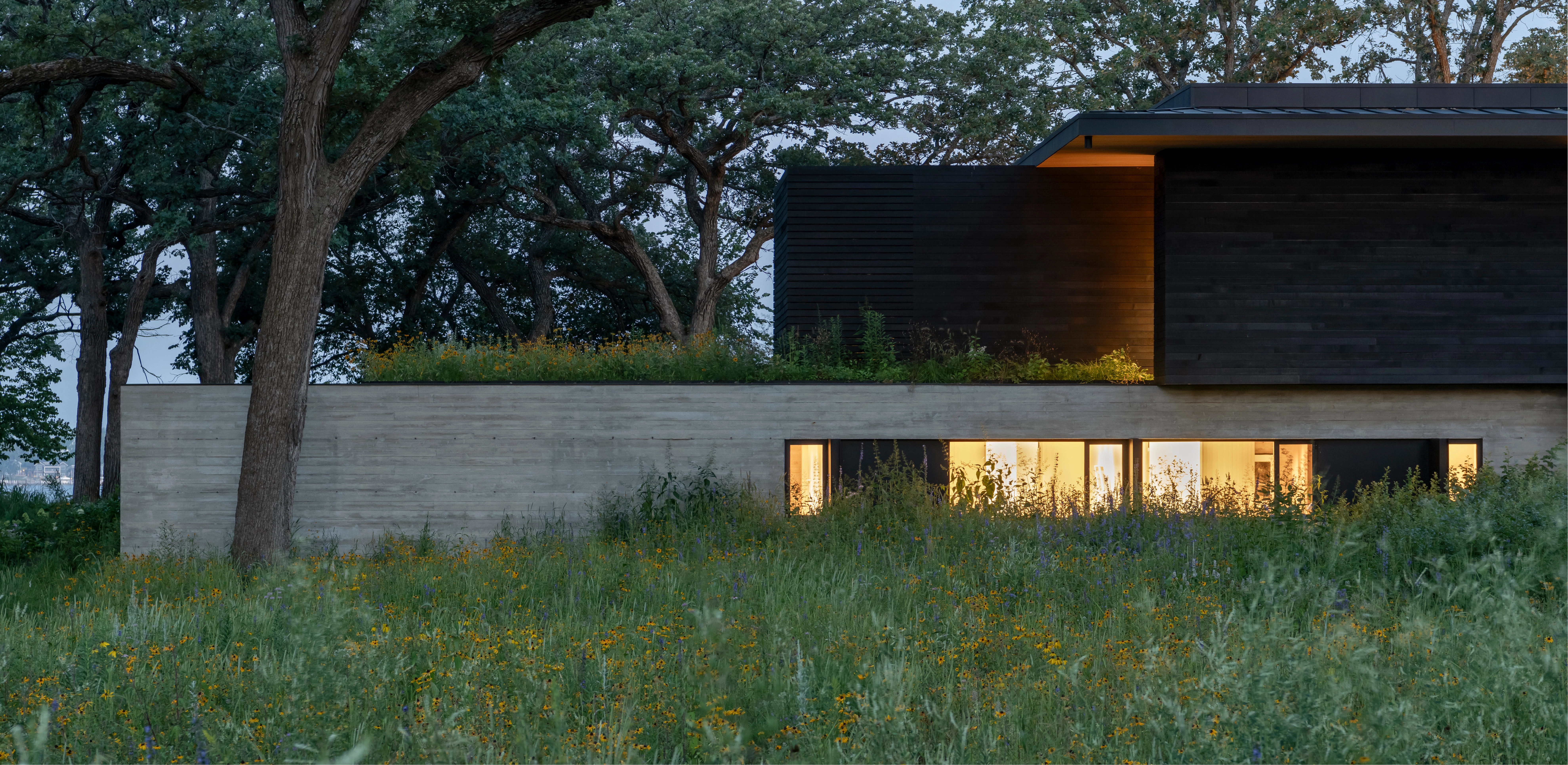 COMMUNE WITH NATURE The splayed, L-shaped footprint of the home parallels the lake and northern boundary, while a reconfigured driveway skirts the property’s eastern edge. By gravitating the program to the perimeter, the plan reestablishes an expansive prairie landscape and its historic drainage-ways, elevating scenic quality from public rights-of-way and creating an immersive entry experience. Nestled within sculptural oaks, the home emerges from a gently sloping landform when viewed from the road, while reading as a single-story structure from the lake. A 2,500 square foot green roof appears as a lifted extension of the prairie. Shared outdoor spaces unite generations for recreation and communion with nature. Low, freestanding walls denote thresholds while permeable pathways sinuously link amenities and emphasize the dynamism of the landscape.
