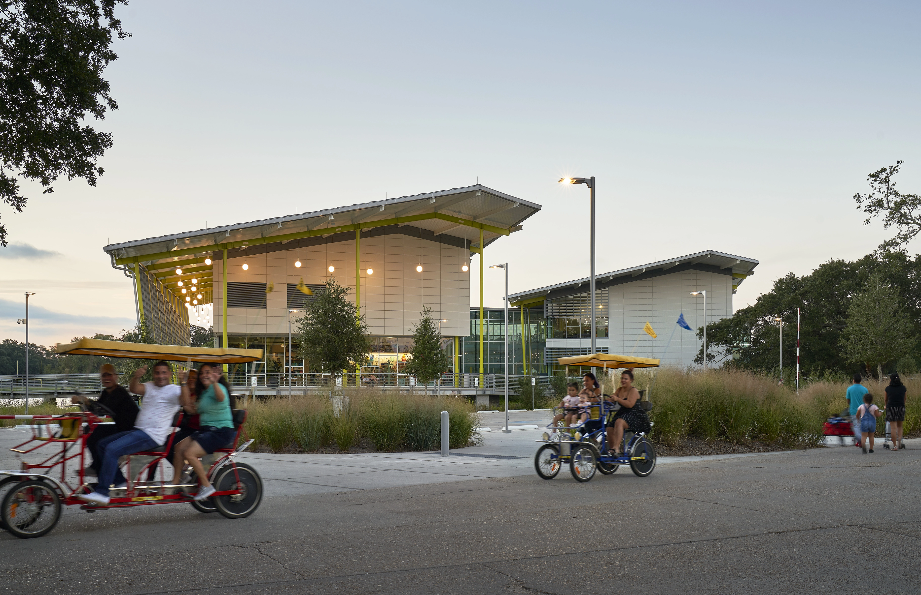 The building and site were designed to accommodate periodic flooding, and mitigate the hot, humid climate. The integrated design optimizes the shade of mature live oak trees, the world’s largest grove of live oaks, and the flow of a freshwater lagoon as a local stormwater receiving area that relieves flooding in downtown neighborhoods. The choreography of the visitor experience connects families with these nature-based systems—moving through groves of live oaks, across water, through immersive exhibits and into a courtyard and sensory gardens.
