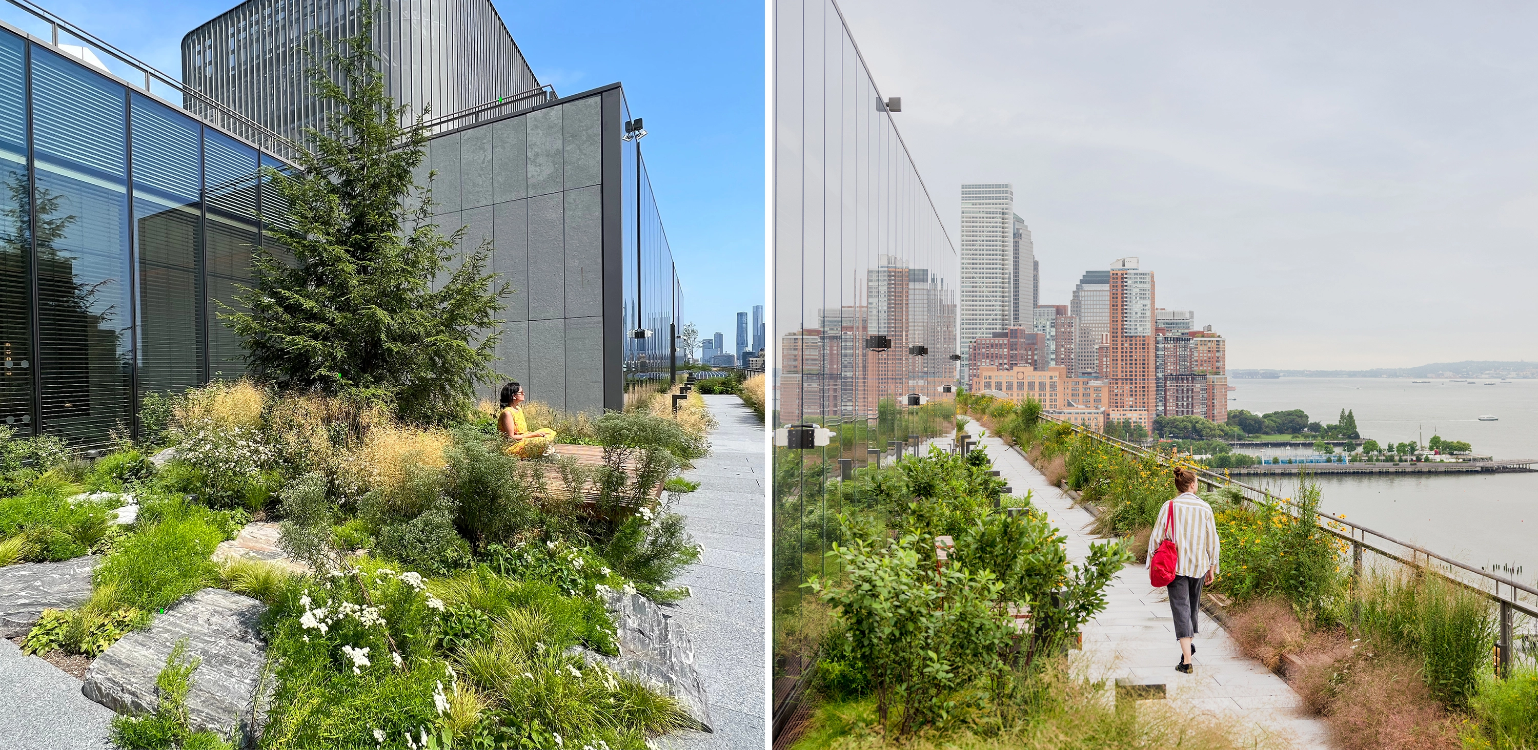 Collectively, the terraces provide a diverse range of work-space environments that inspire collaboration and imagination. The 4th-floor terrace, located on the roof of the existing building, takes cues from its industrial past through distinctive architectural elements, including wind-mitigation screens, pergolas, and seating nooks. The events terrace hosts visitors from the auditorium with a large flexible space, planted islands, fossilized limestone bar counters, and pergolas. The 11th floor is a quarter-mile-long, 360-degree walking path offering a moment of respite, with exceptional views across the water and of the Manhattan skyline. The walking path is framed by plantings inspired by the Dutch term, Bloemendaal – or “Valley of Flowers” – used to characterize the qualities of pre-development Manhattan. The 12th-floor terrace brings employees back to nature with rocky outcroppings and emergent alpine plants at the meditation garden and intimate seating areas nestled in the Pine Grove. A large lawn with rolling topography, a bosque of oak trees, and catenary lights supports flexible use for wellness programming, happy hour events, and lunch hour picnicking.