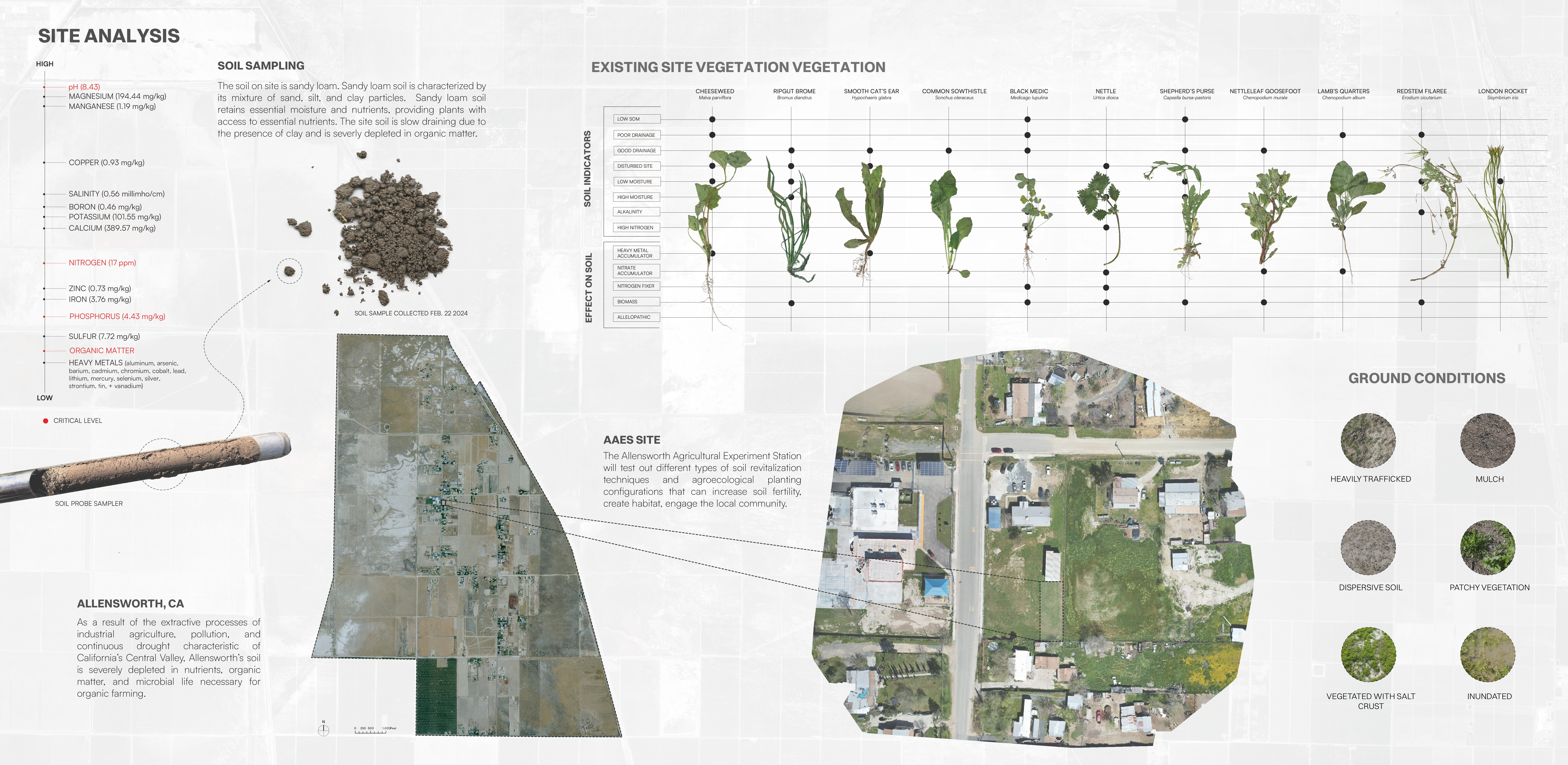 Before construction of the AAES, a deep site analysis was conducted which consisted of soil tests, cataloging of existing plant species, and documentation of existing site resources and amenities (access to water, electricity, etc.) to determine the best ways to remediate the soil and begin to engage the local community.