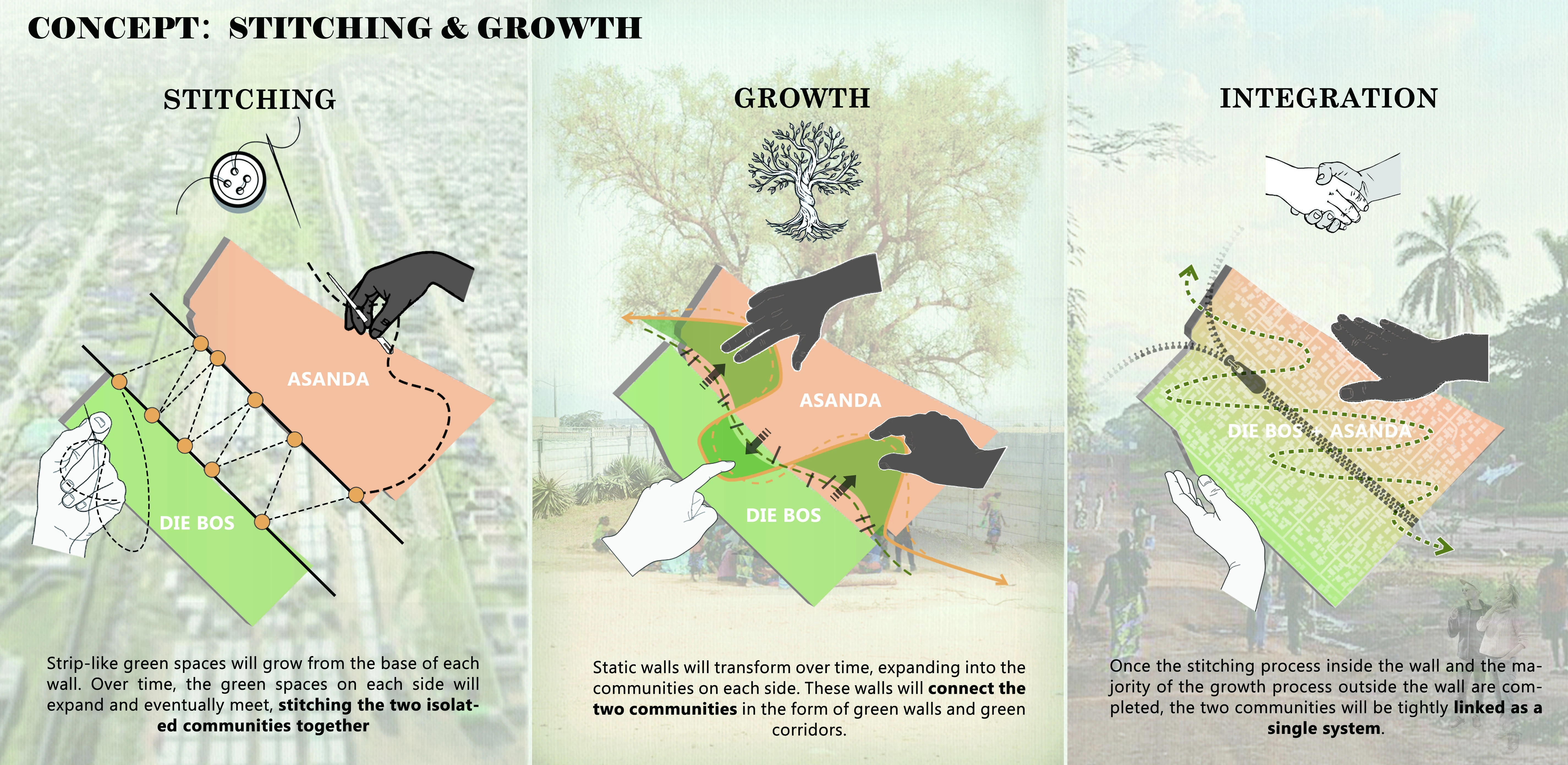 Racial inequality is a challenging global issue, especially pronounced in South Africa. In Cape Town's Asanda and Die Bos communities, two parallel walls and the abandoned land between them completely separate black and white communities. While the white community is affluent, over half of the black residents live below the poverty line, lacking water, fresh food, and etc. We propose a strategy to reconfigure these walls, promote exchange, and restore social equity, responding to ‘ASLA’s Racial Equity Plan of Action’. This project will remove physical and invisible barriers through wall reconfiguration and green space development, achieving environmental justice in the black community and fostering economic exchange between the communities.