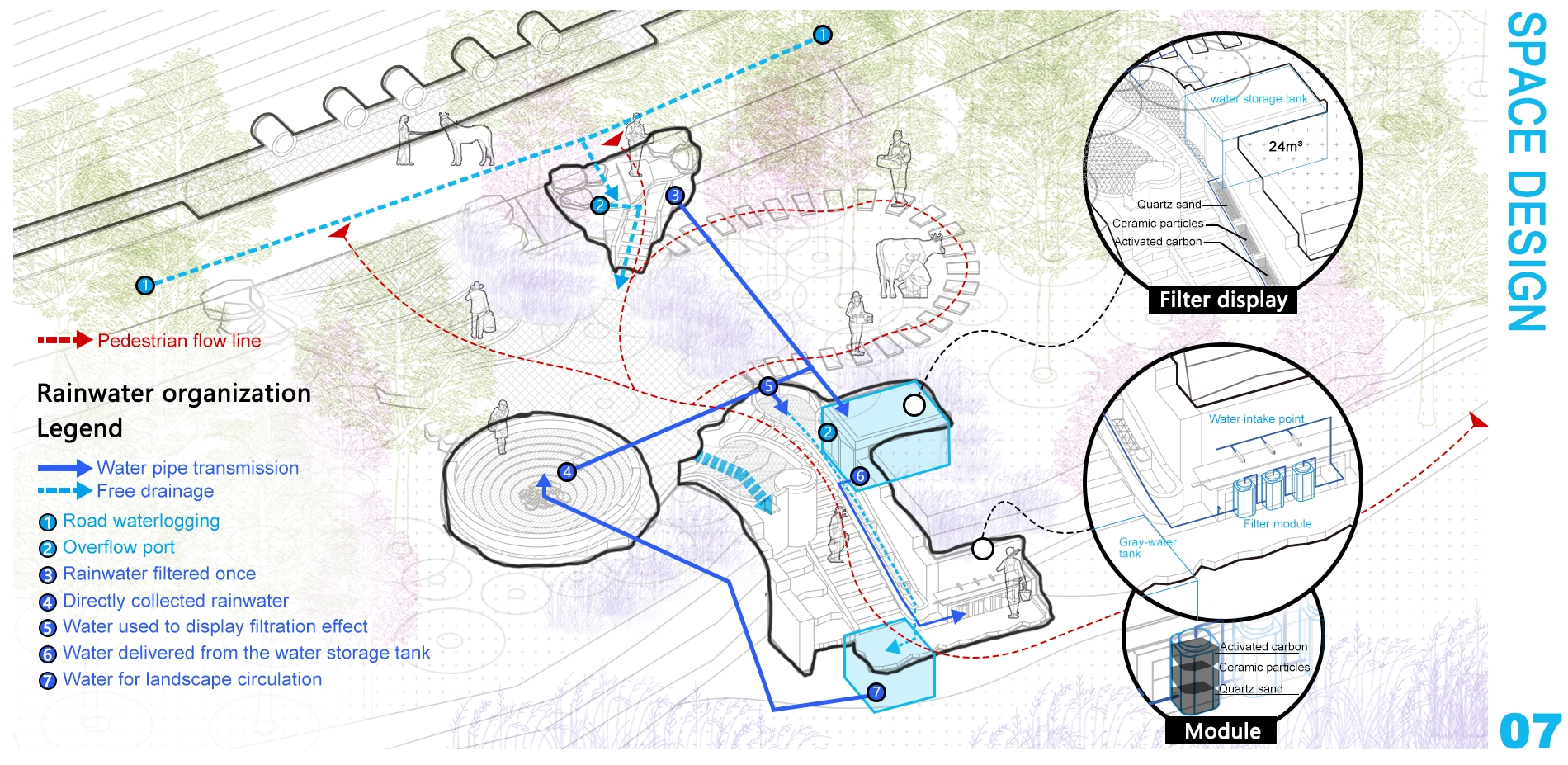 On-site storm tests determined the lowest point of roads. A primary filtration pond on the south side collects runoff. The reservoir's location was determined by natural terrain depression, with rainwater collection pond in open areas. Buried pipes connect them. Terrain elevation creates gravity water pressure, allowing water to flow through a filtration system. Wastewater is collected in an underground gray water tank and pumped back for recycling when full.Ultimately transform soil erosion disasters into water resource benefits.