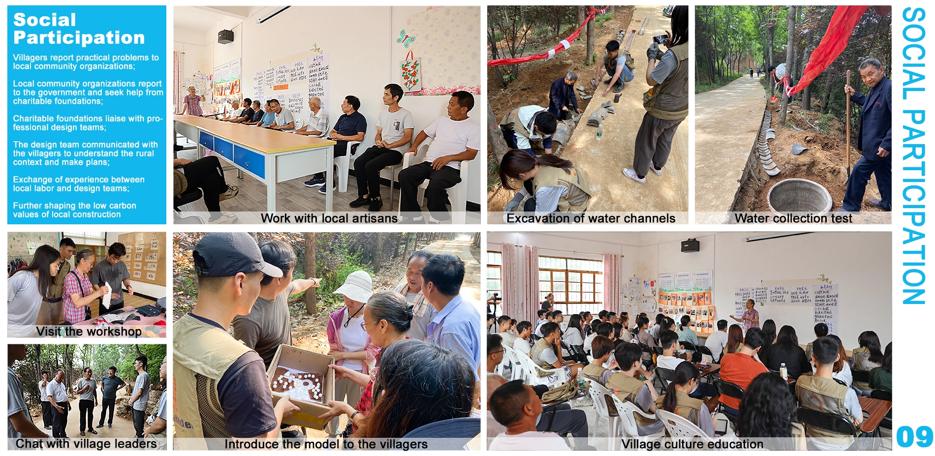 This project in Zhoushan Village, Henan, China, addresses water shortages and soil erosion through a low-carbon water circulating landscape. It uses local and recycled materials and employs permeable paving to protect the ecosystem and reduce costs. The muti-party participation model enhances villagers' skills and environmental awareness. The design team and suppliers improved cultural and technical knowledge, bringing economic benefits to elderly workers. Coordinated by NGOs, this collaboration not only tackled practical issues but also strengthened community ties and promoted rural revitalization.