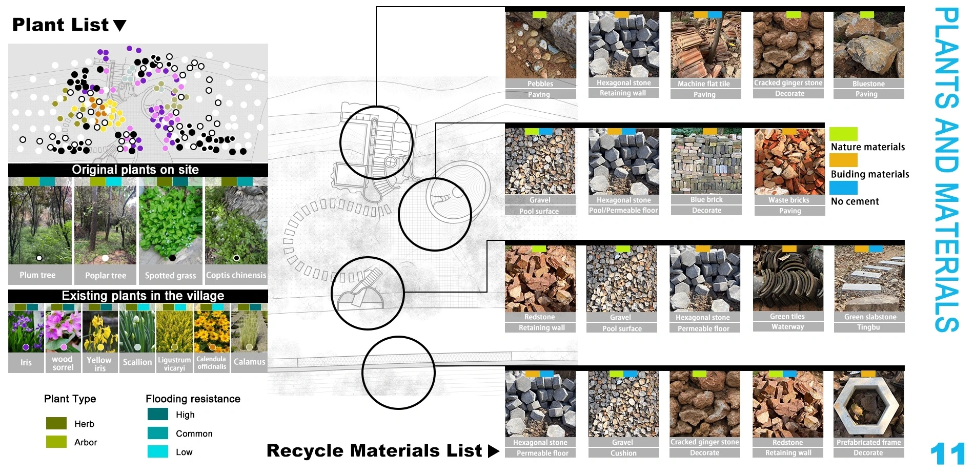 The project follows three principles: environmental, economic, and social sustainability. Design principles include utilizing existing conditions, protecting ecology, controlling costs with recyclable materials, and cooperative construction.