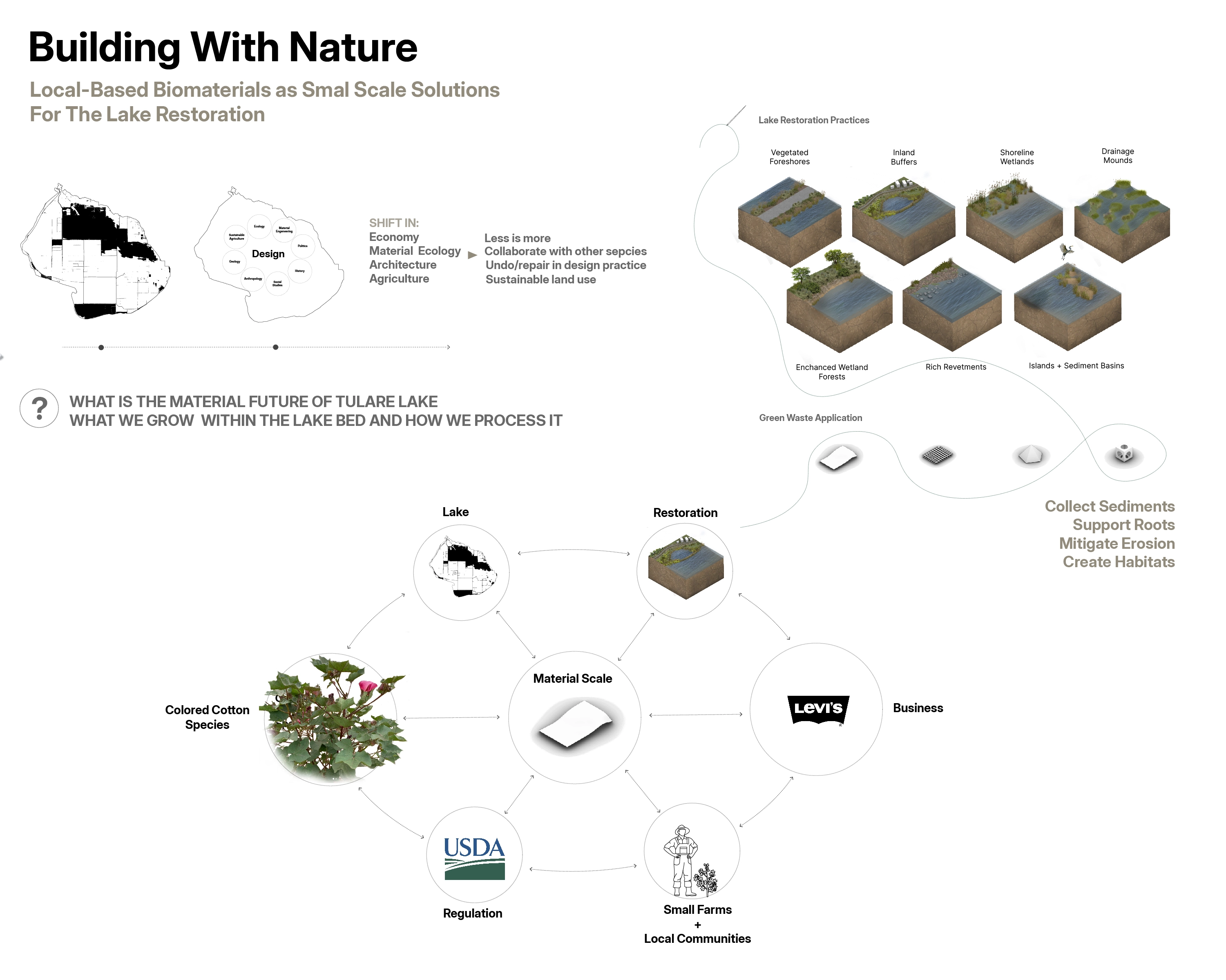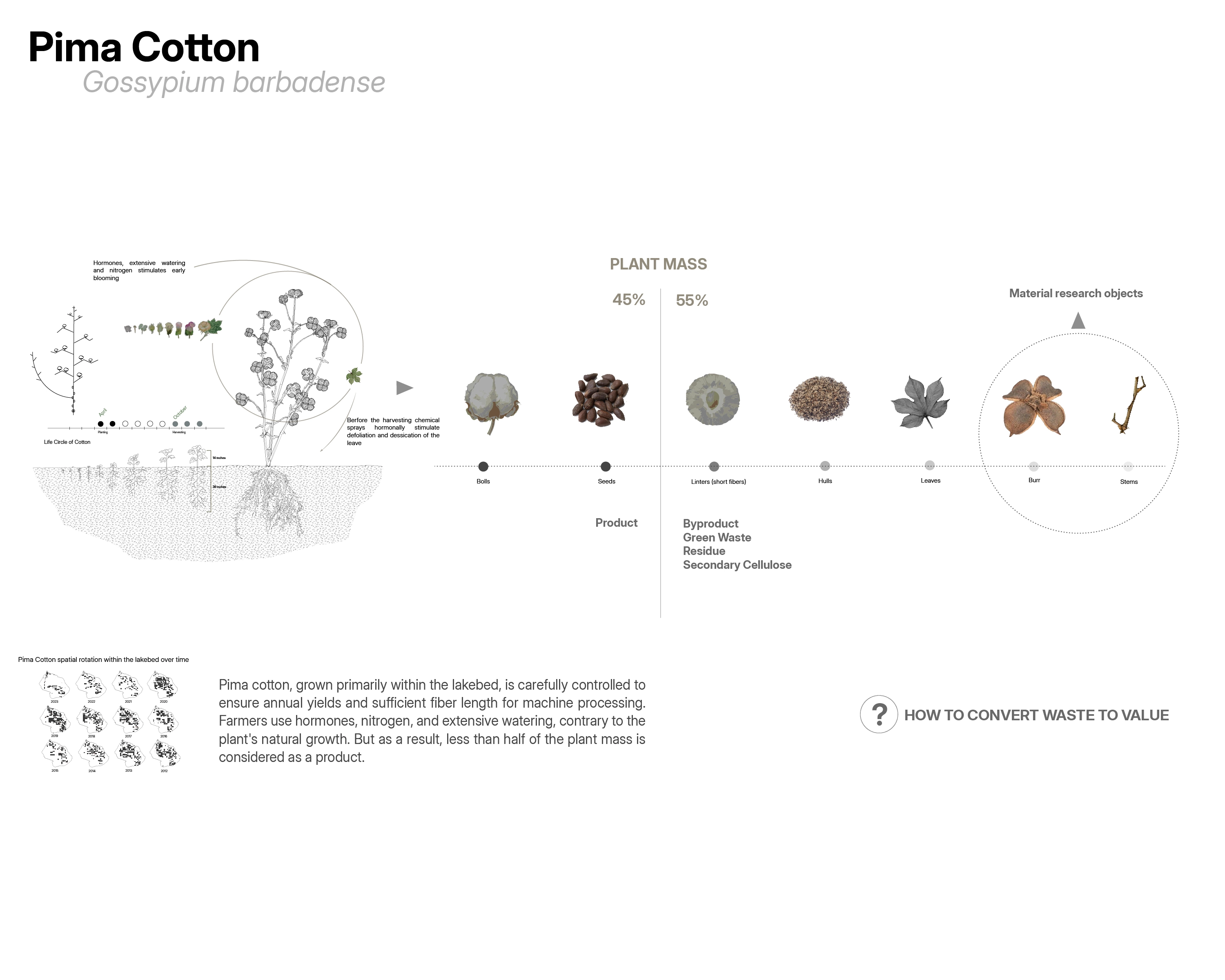 The project investigates the material characteristics of cotton, a key non-food crop with historical significance in the Tulare Lake basin. It addresses environmental imbalances caused by conventional farming and unsustainable water management and seeks sustainable approaches to restore the lake's ecosystem by focusing on material considerations and advocating for a material ecology approach.