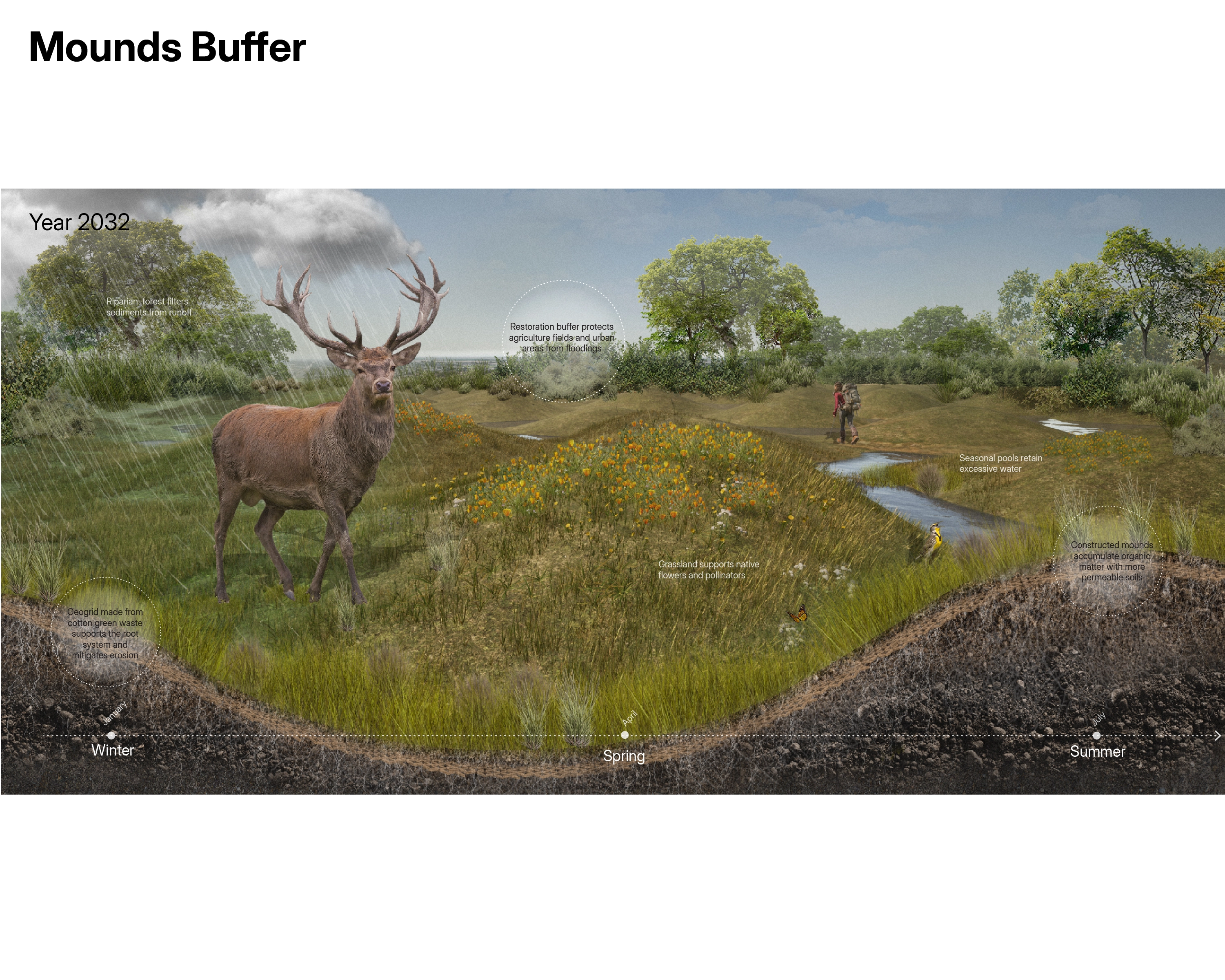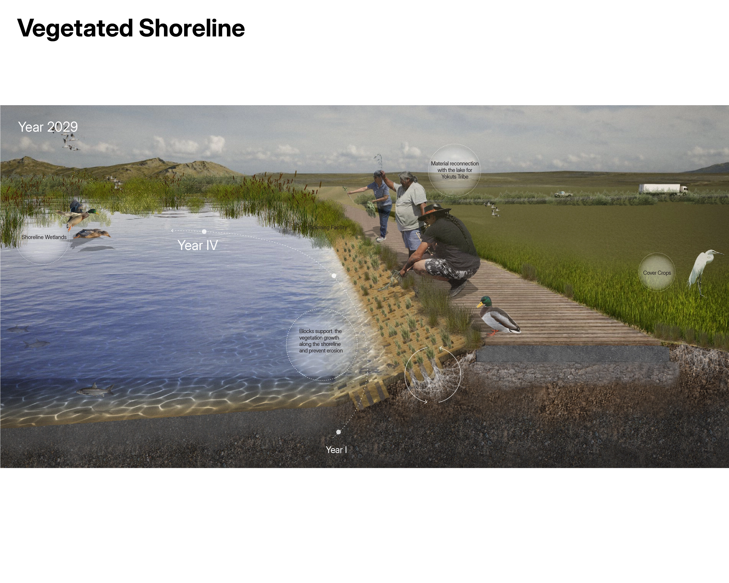 Proposed future scenarios for the lakebed envision a coexistence of water, humans, and other species, viewed from a material design perspective. On the right scale, biocomposites can recombine elements of this complex system.