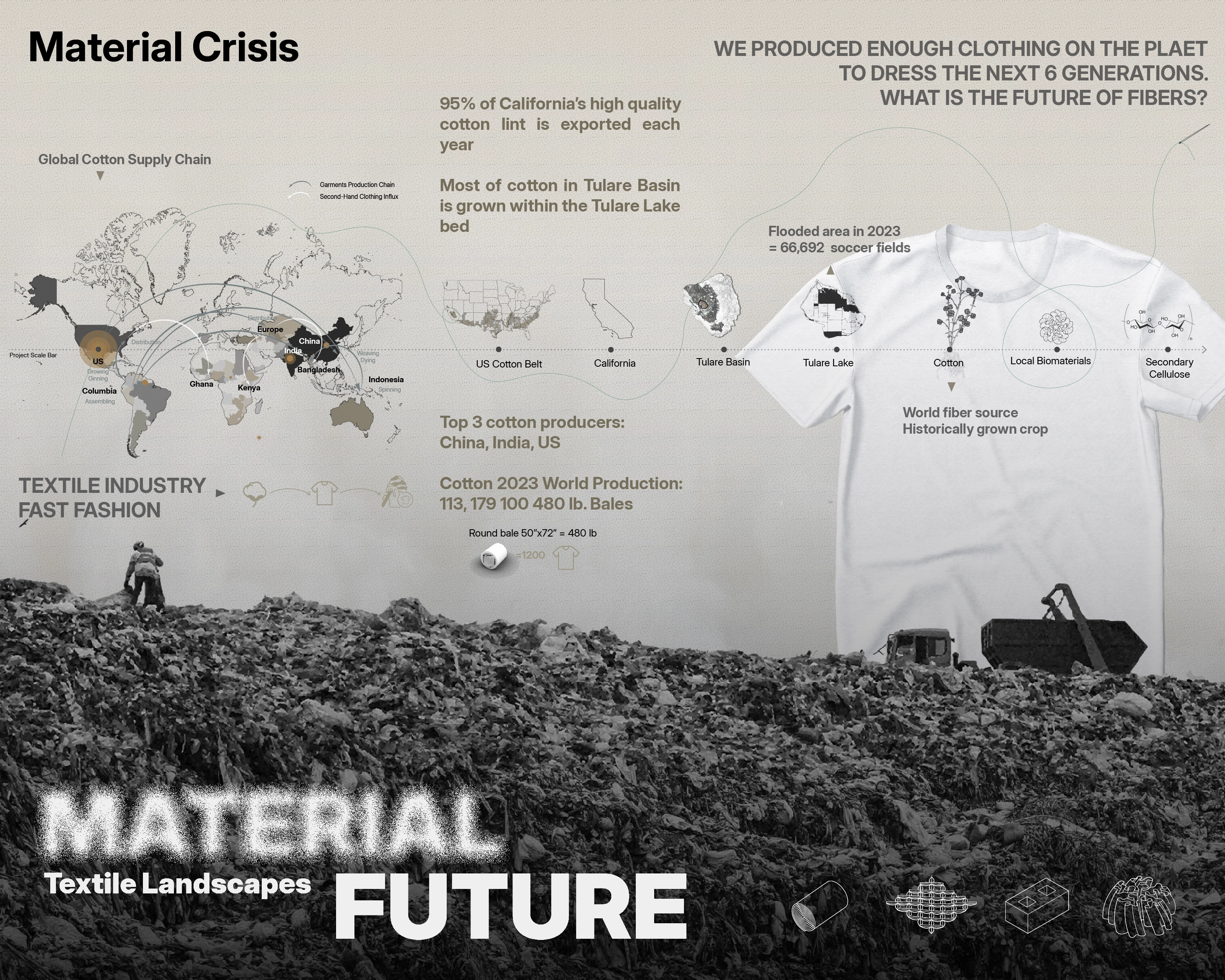 “Textile Landscapes” explores the material characteristics and historical significance of cotton in the Central Valley, focusing on the environmental impacts of large-scale unsustainable farming and water management. It advocates for a material ecology approach that utilizes cotton waste in biocomposites to enhance lake restoration practices and integrate regenerative agriculture for a sustainable future. The project examines cotton's symbolic meaning and impact as a fiber crop, from a global perspective to local materials, within the Tulare Lakebed, once the largest lake west of the Mississippi, now drained for farming. The supply chain of cotton, from boll to garment, highlights its global impact and significant role in textile production and fast fashion.