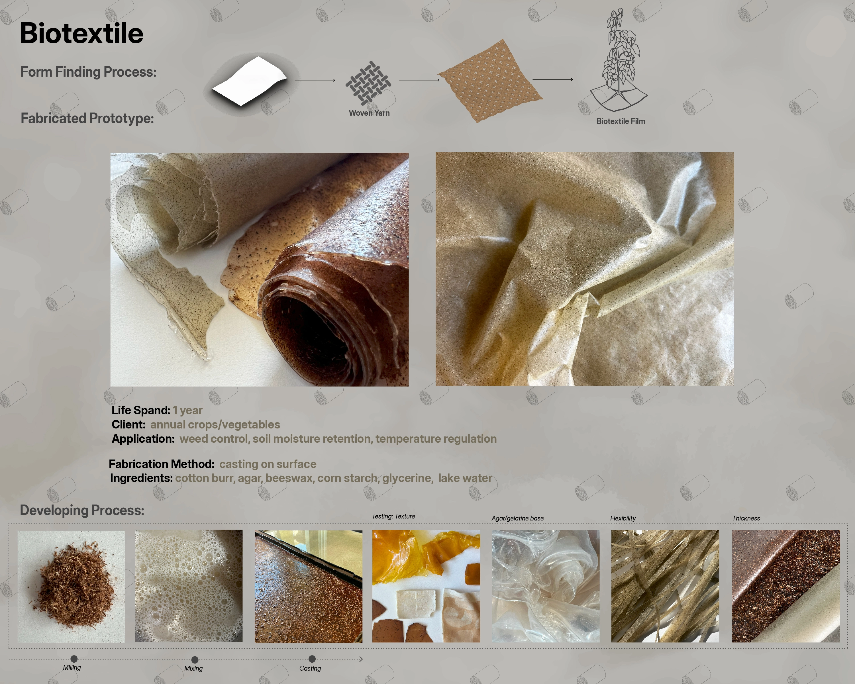 By examining cotton's secondary cellulose and its potential as a biocomposite filler, the proposed methodology reimagines the future of fibers and the ecological framework of cotton cultivation and water management. "Textile Landscapes" offers a comprehensive strategy for environmental stewardship at both the landscape and material levels.